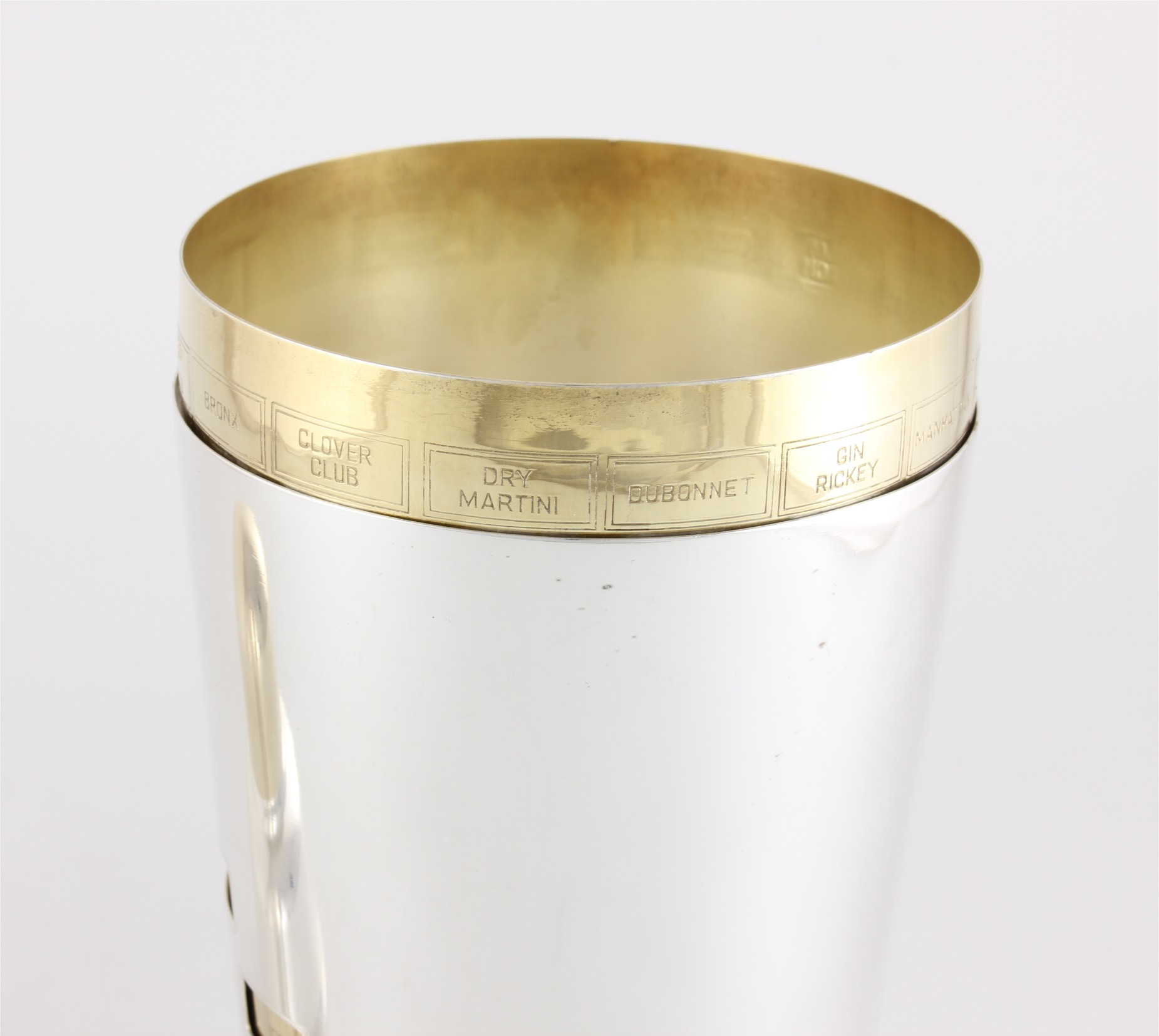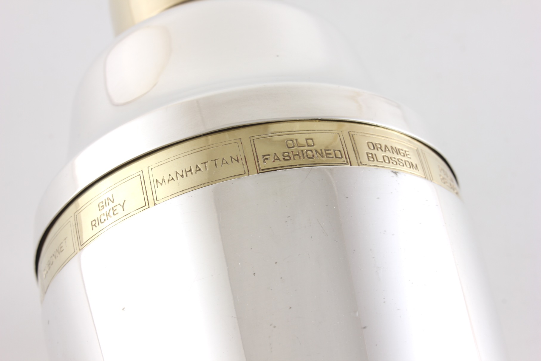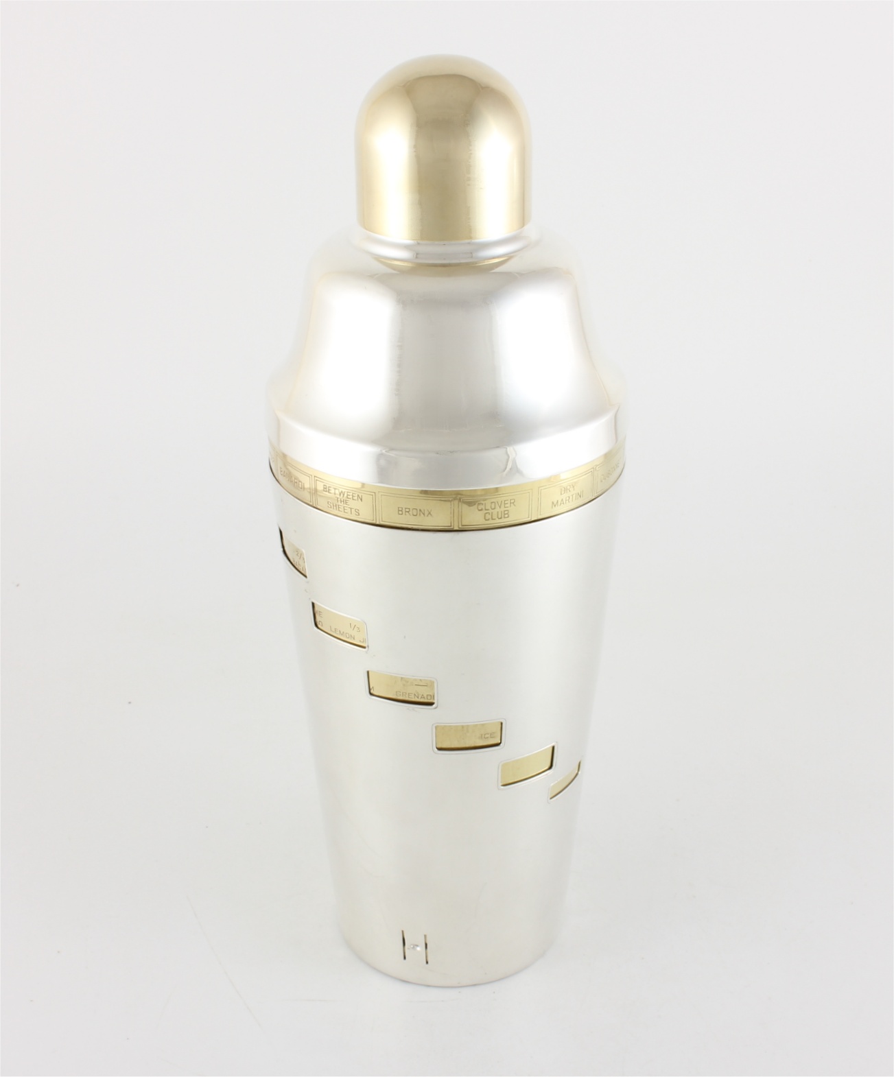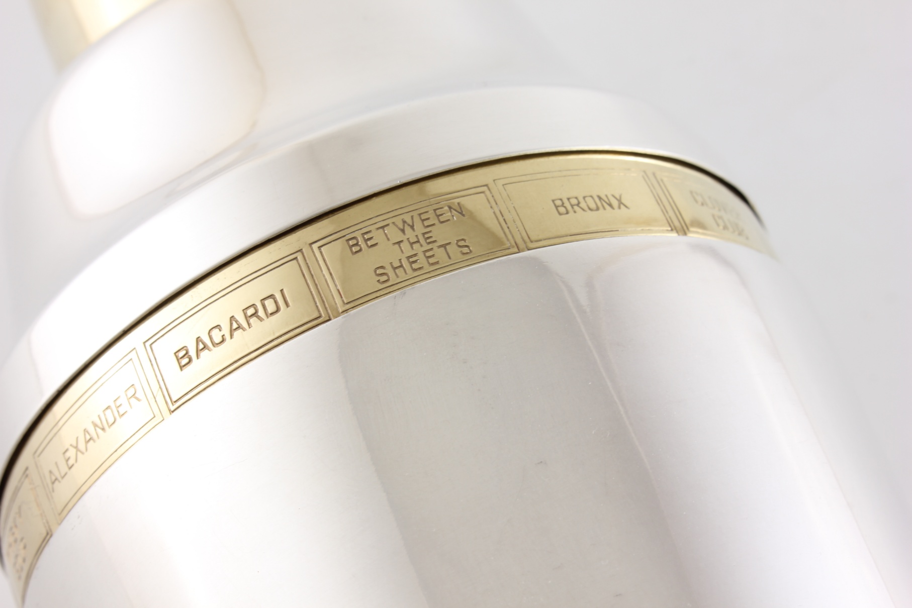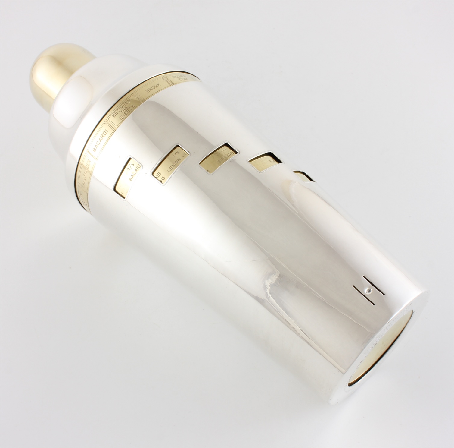 This stylish Art Deco Dial a Drink recipe cocktail shaker is by the American company Napier and features a silver plated sleeve which fits over the nicely gilded body.