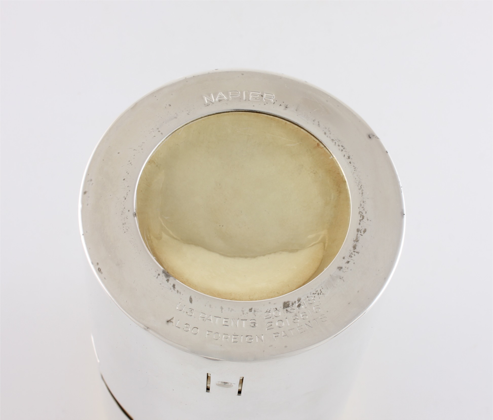 The underside is marked with the maker's details of Napier which is an American company and with US Patents 2013618. 2013616 and also Foreign Patents. The top strainer section is silver plated and has a gilt lid.