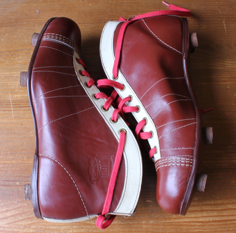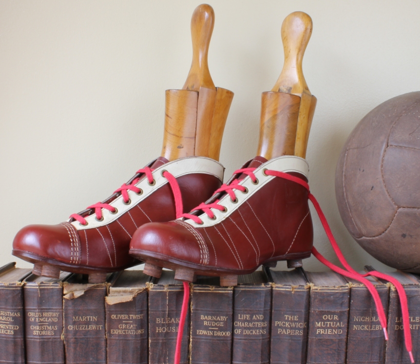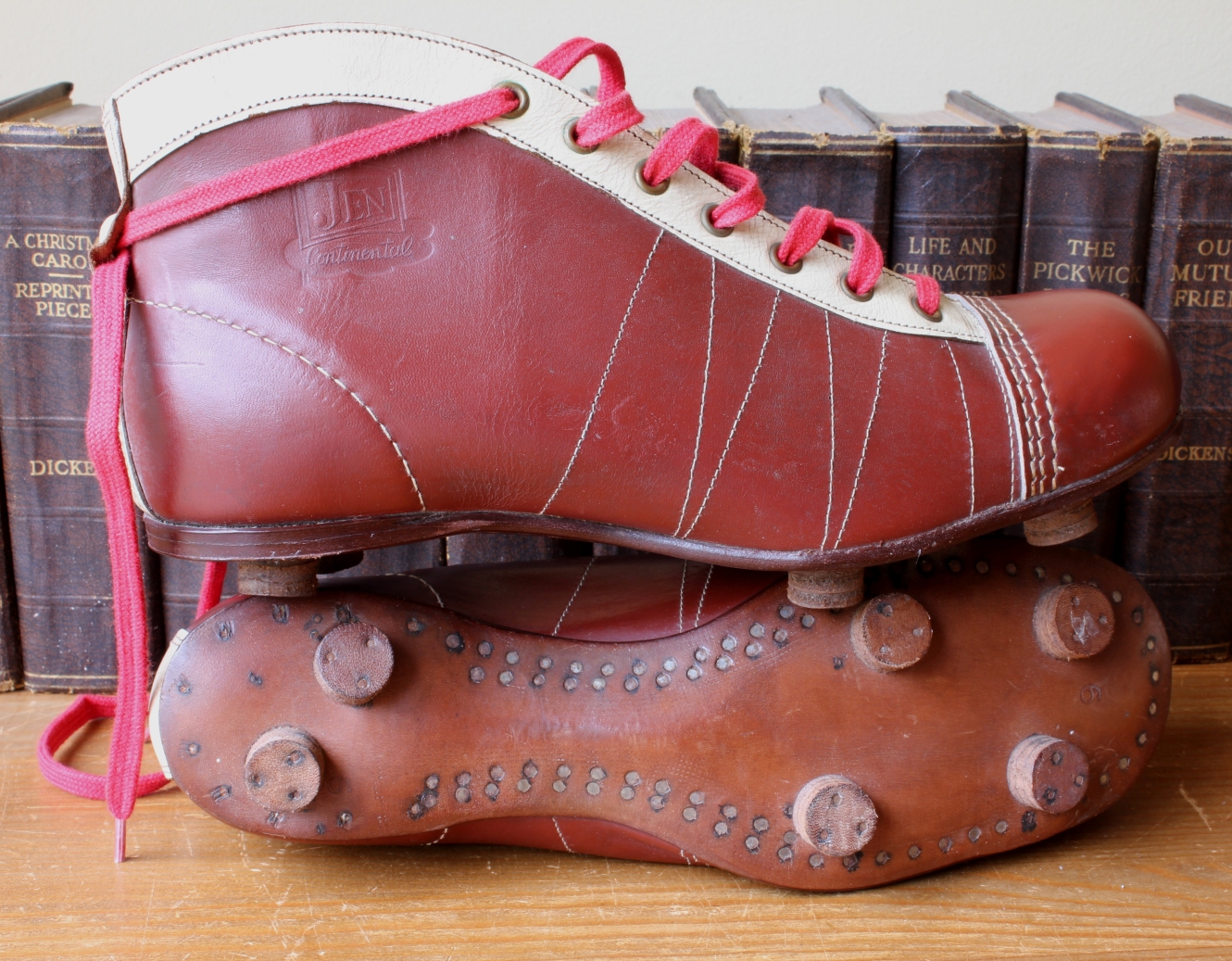 This superb pair of Jen Continental football boots which date from the 1950's are made of red leather with leather soles and studs.