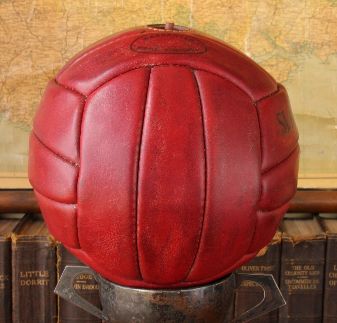 This unusual and rare vintage Slazenger Jack Hatfield International football is made of thick and heavy Red leather and features a new at the time "Laceless" bladder system.
