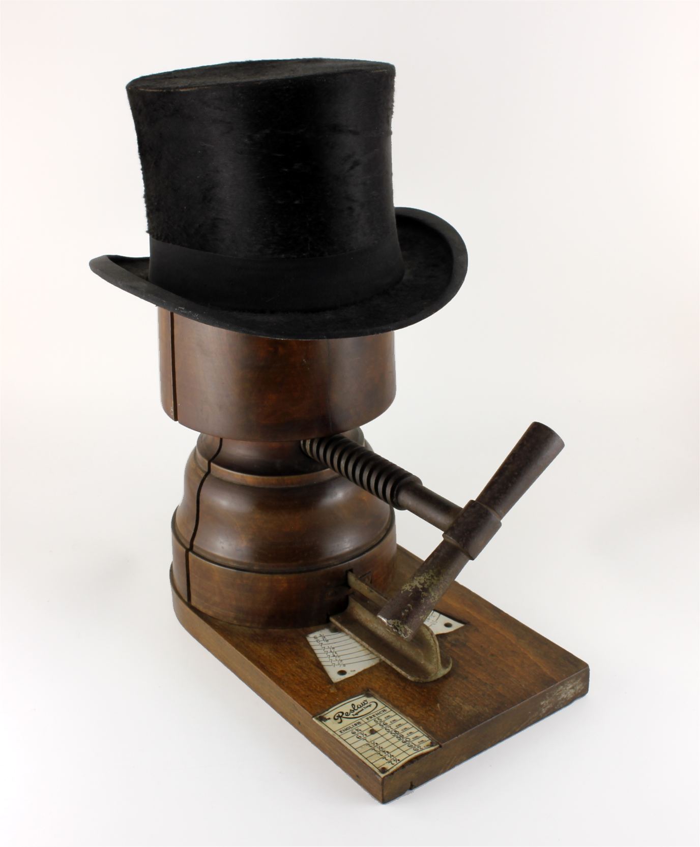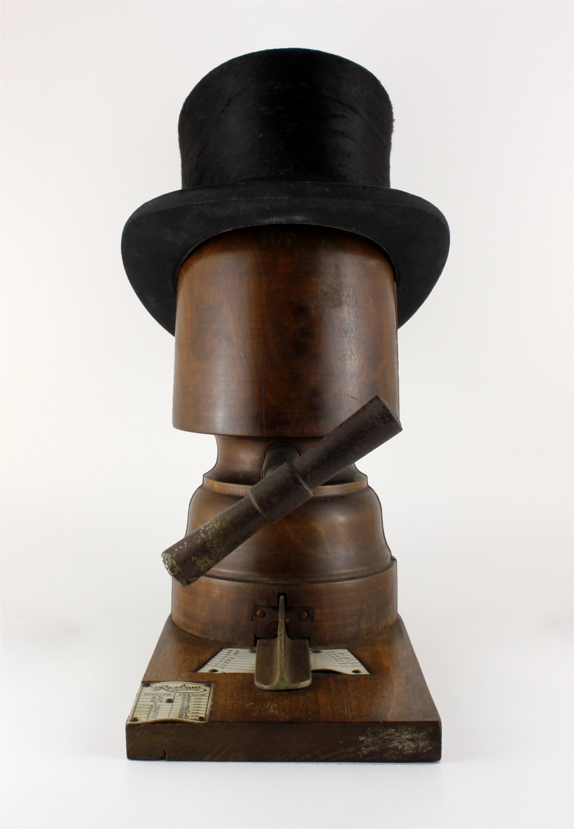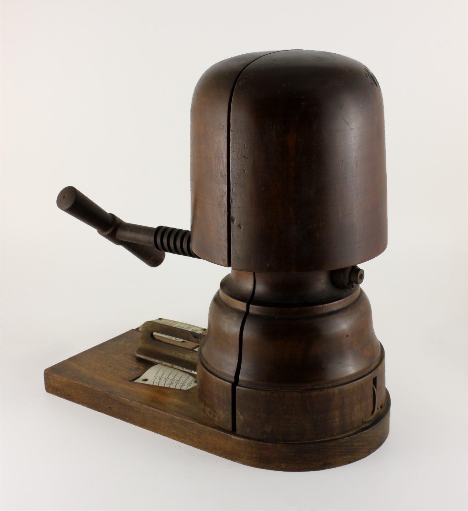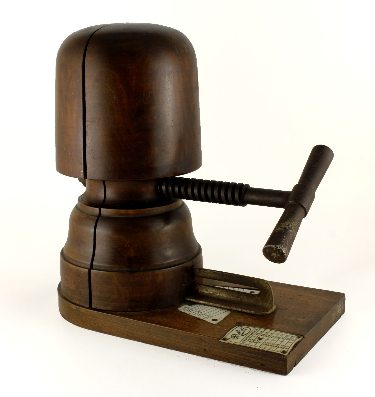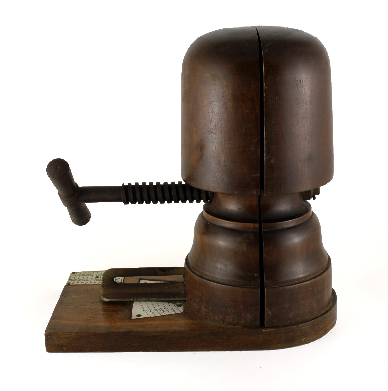 This fine mechanical hat sizer has a large metal handle which when turned opens and closes the wooden hat section to adjust the size, has a wonderful dark rich patina and is a particularly nice example having both the milliner's name and the sizer chart.
