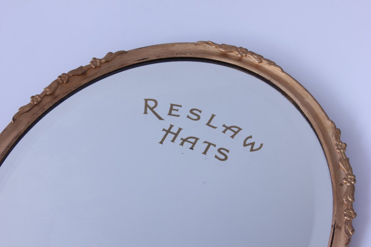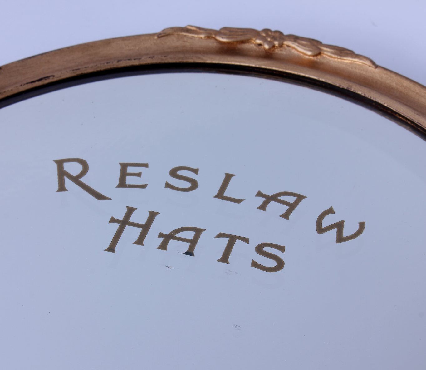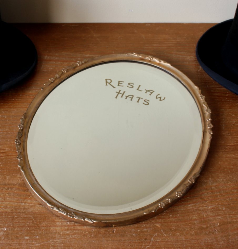 This handsome Reslaw Hats mirror which would have been used to advertise hats in a milliner shop from 1930's has the original bevelled mirror plate which features the wording Reslaw Hats in gilt writing.