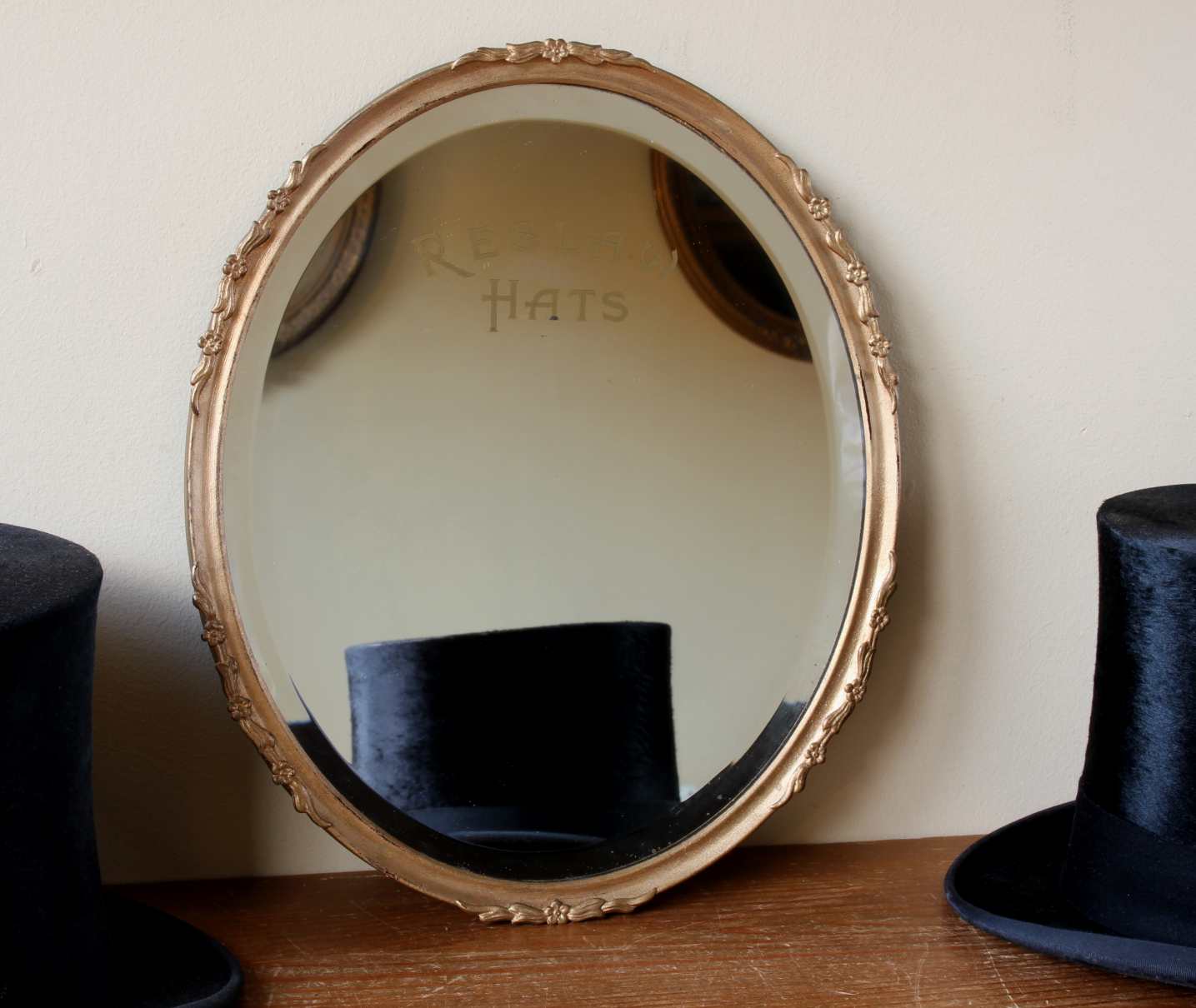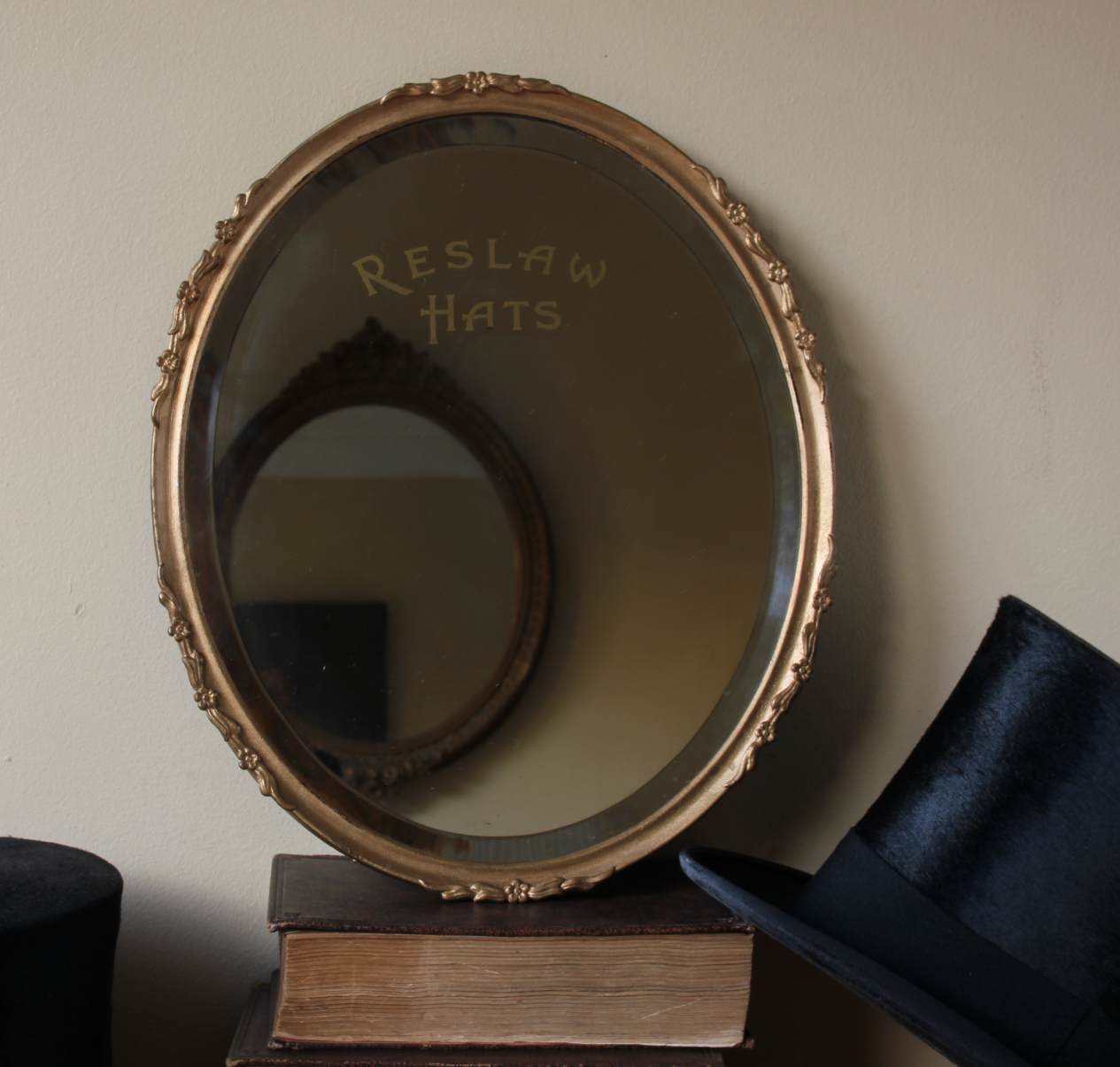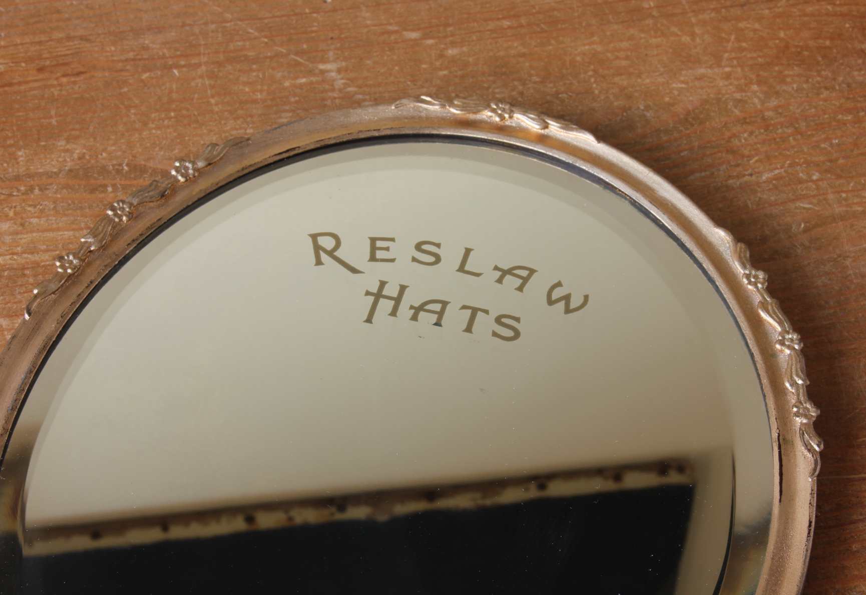 This handsome Reslaw Hats mirror which would have been used to advertise hats in a milliner shop from 1930's has the original bevelled mirror plate which features the wording Reslaw Hats in gilt writing.