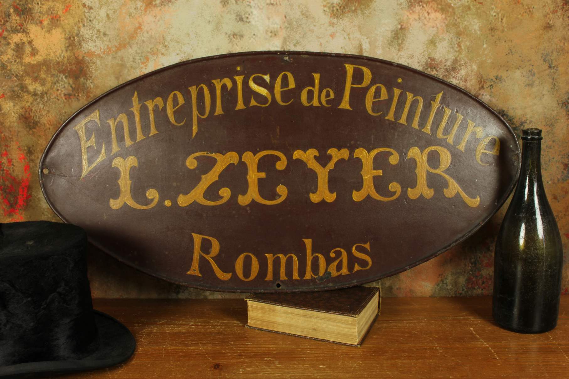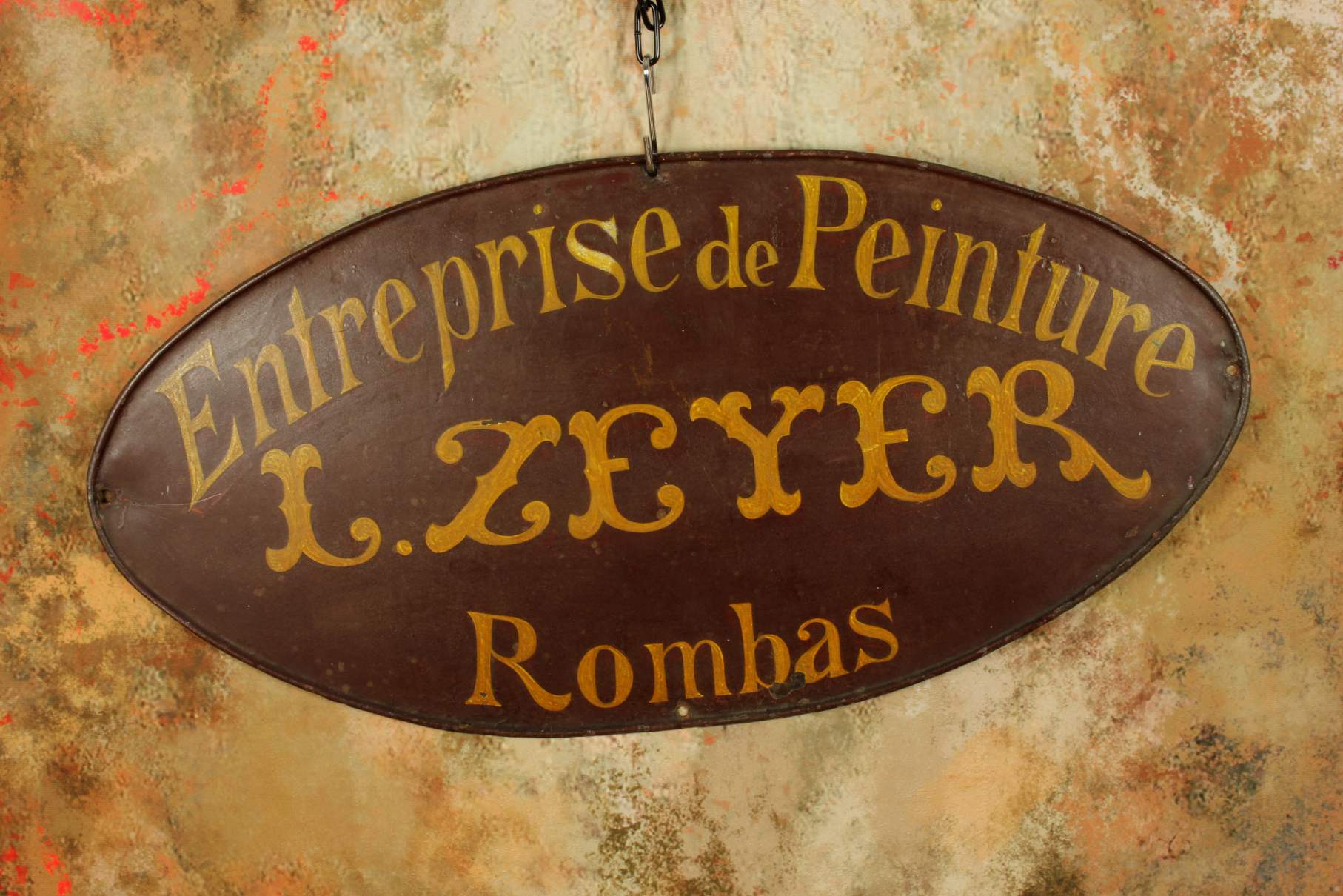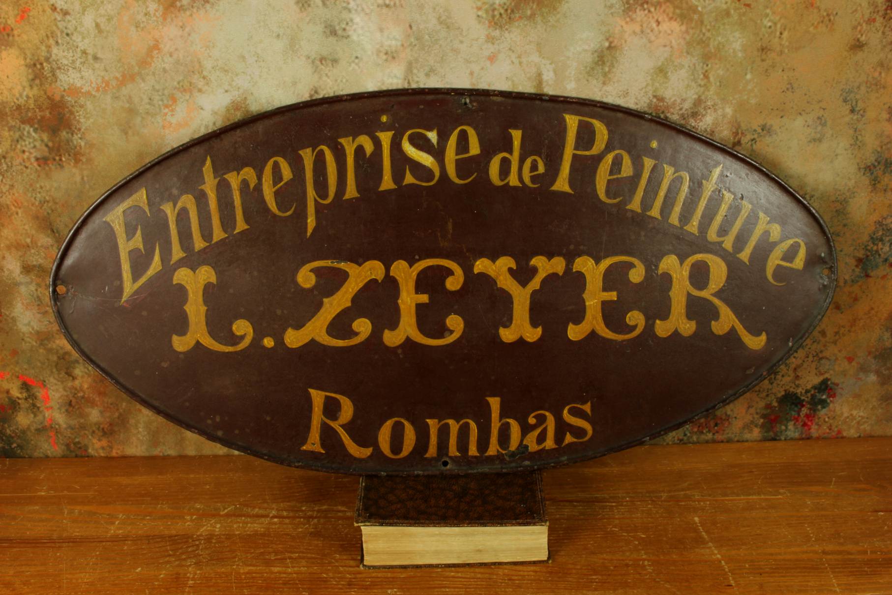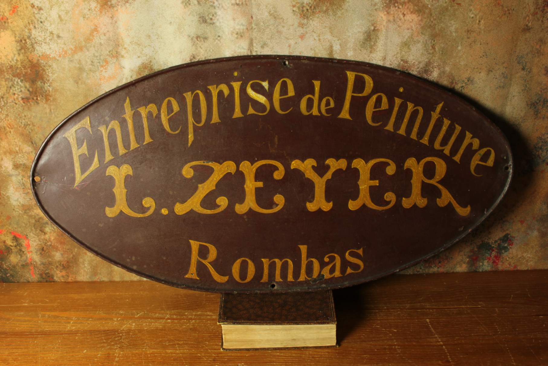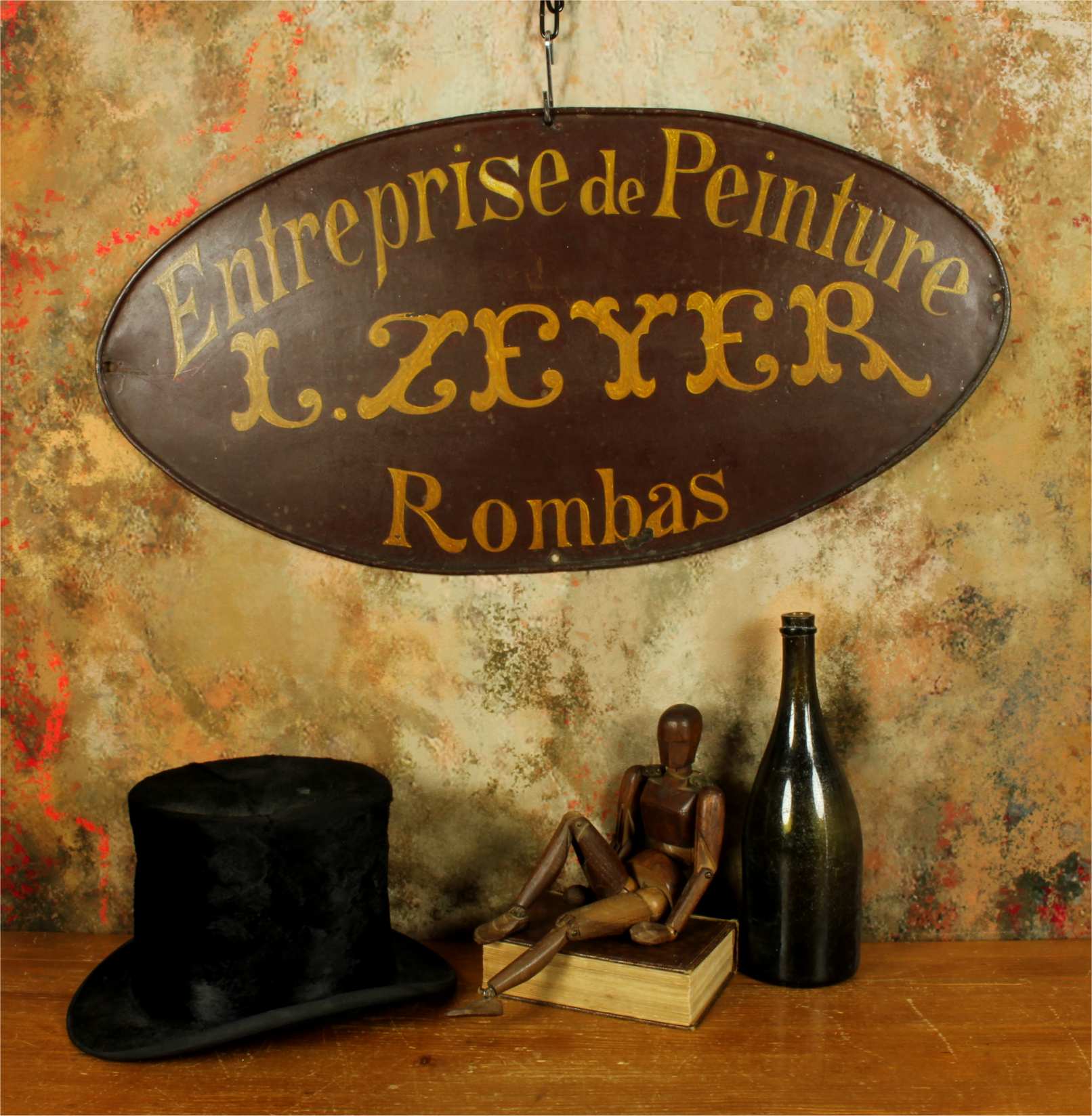 This fabulous highly decorative French tradesman's sign which is made of metal has a painted brown background with beautifully hand painted wording to the front in orange / brown that reads Entreprise de Peinture, L Zeyer, Rombas.