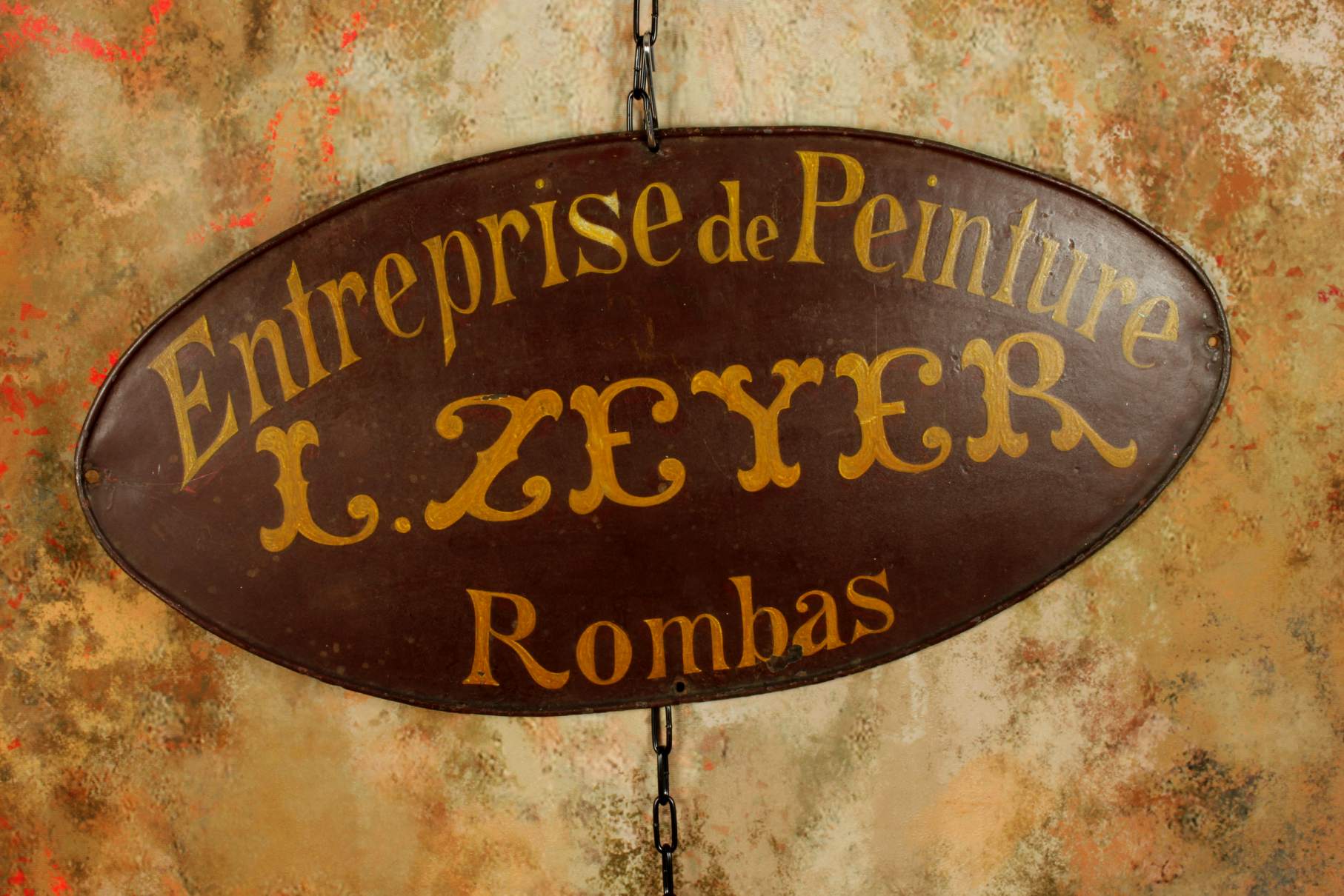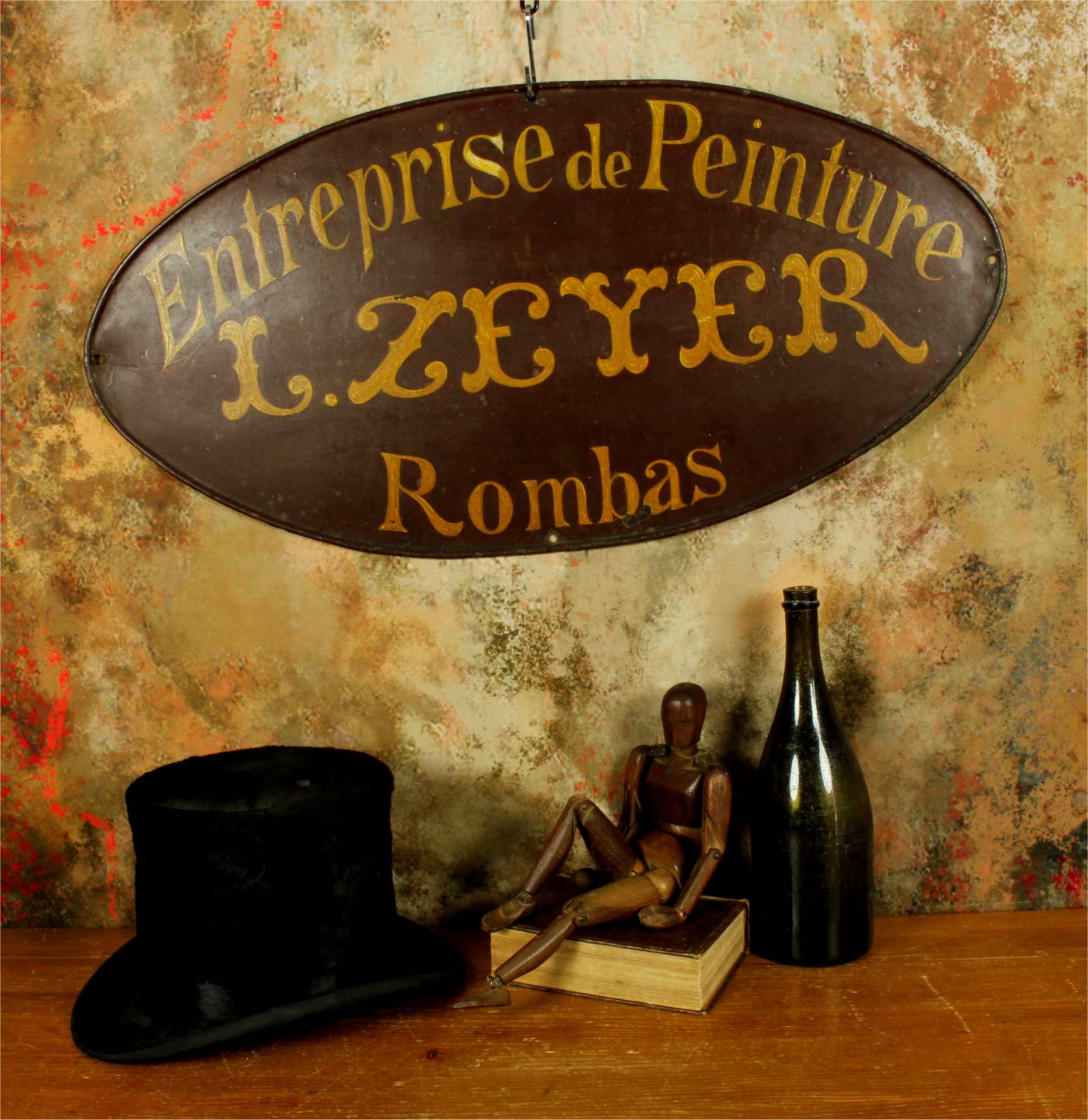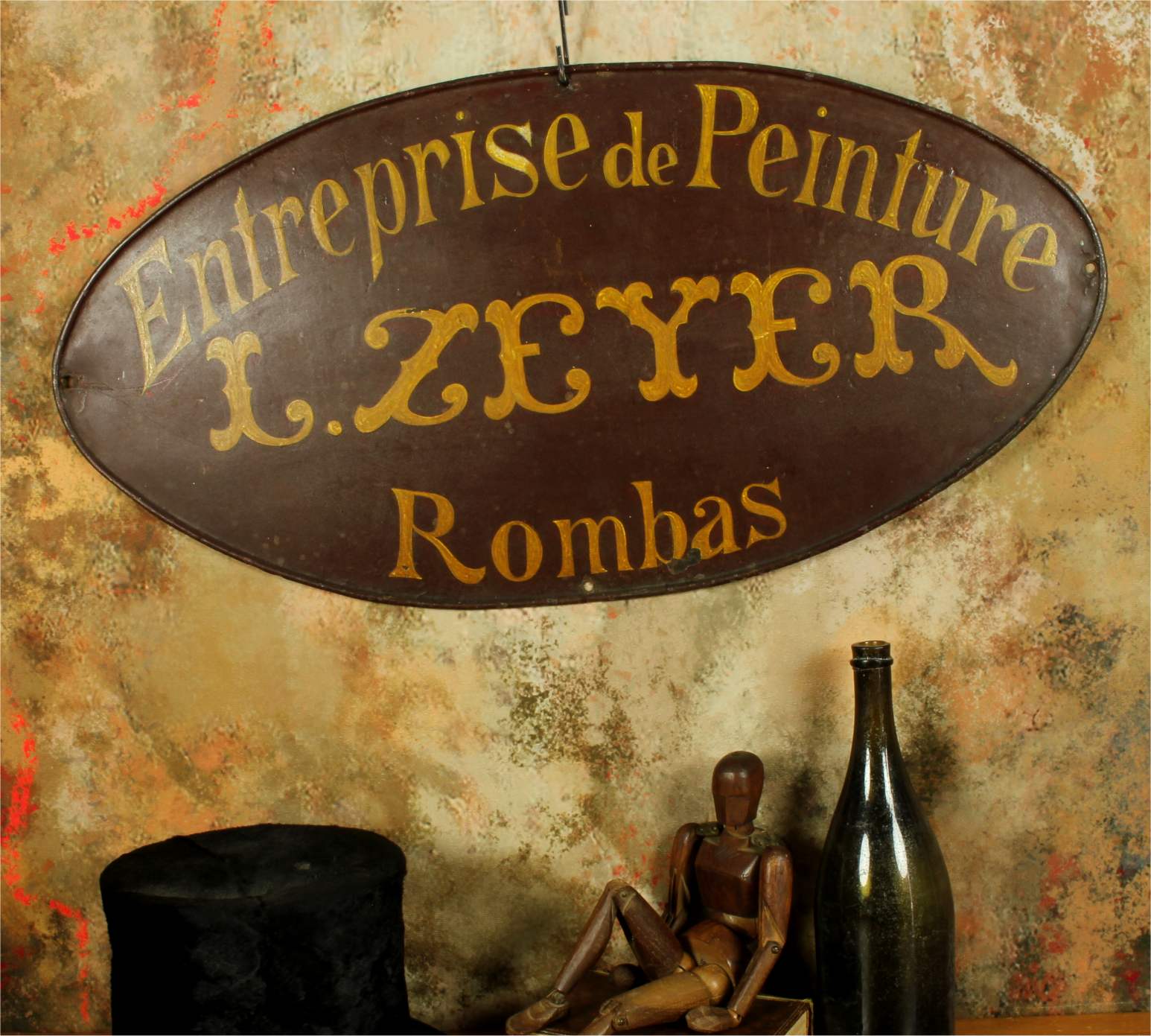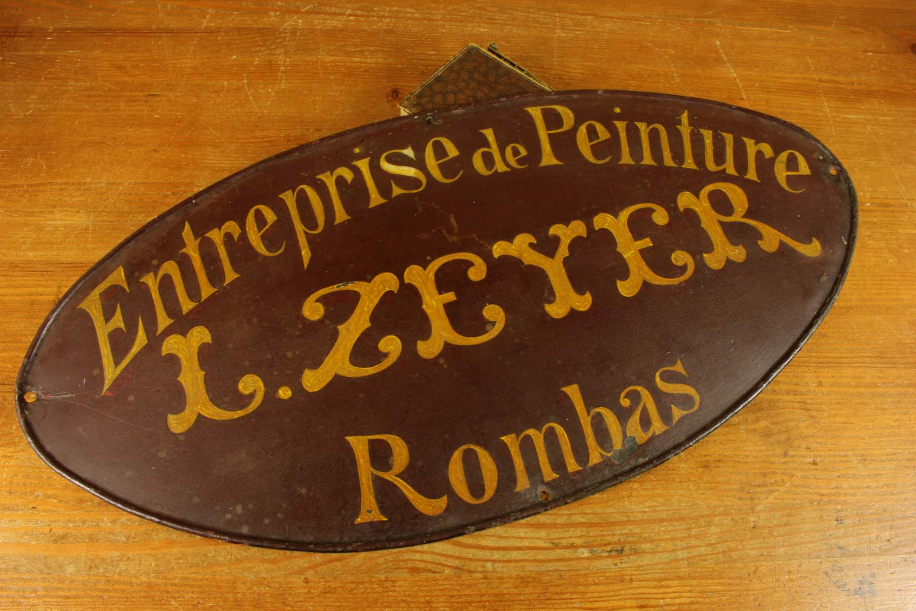 This fabulous highly decorative French tradesman's sign which is made of metal has a painted brown background with beautifully hand painted wording to the front in orange / brown that reads Entreprise de Peinture, L Zeyer, Rombas.