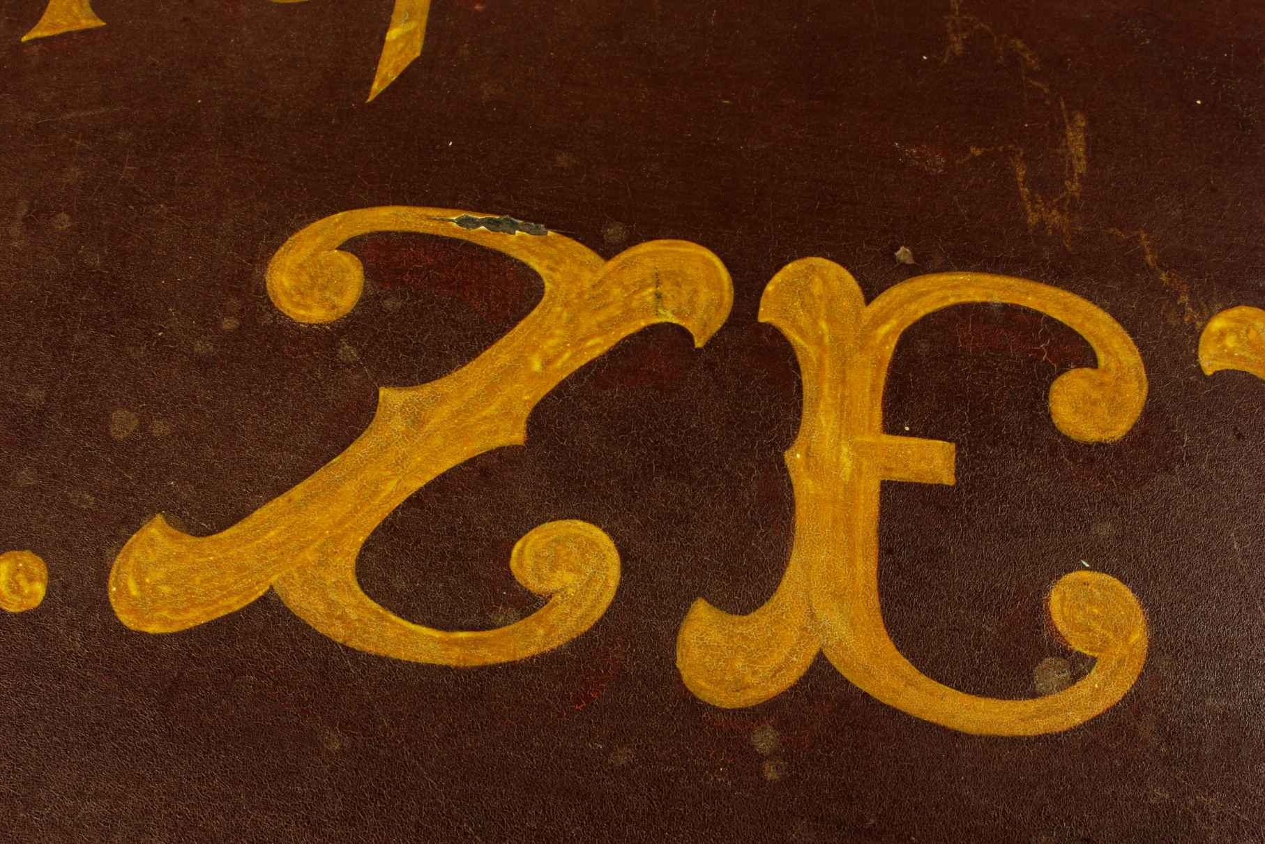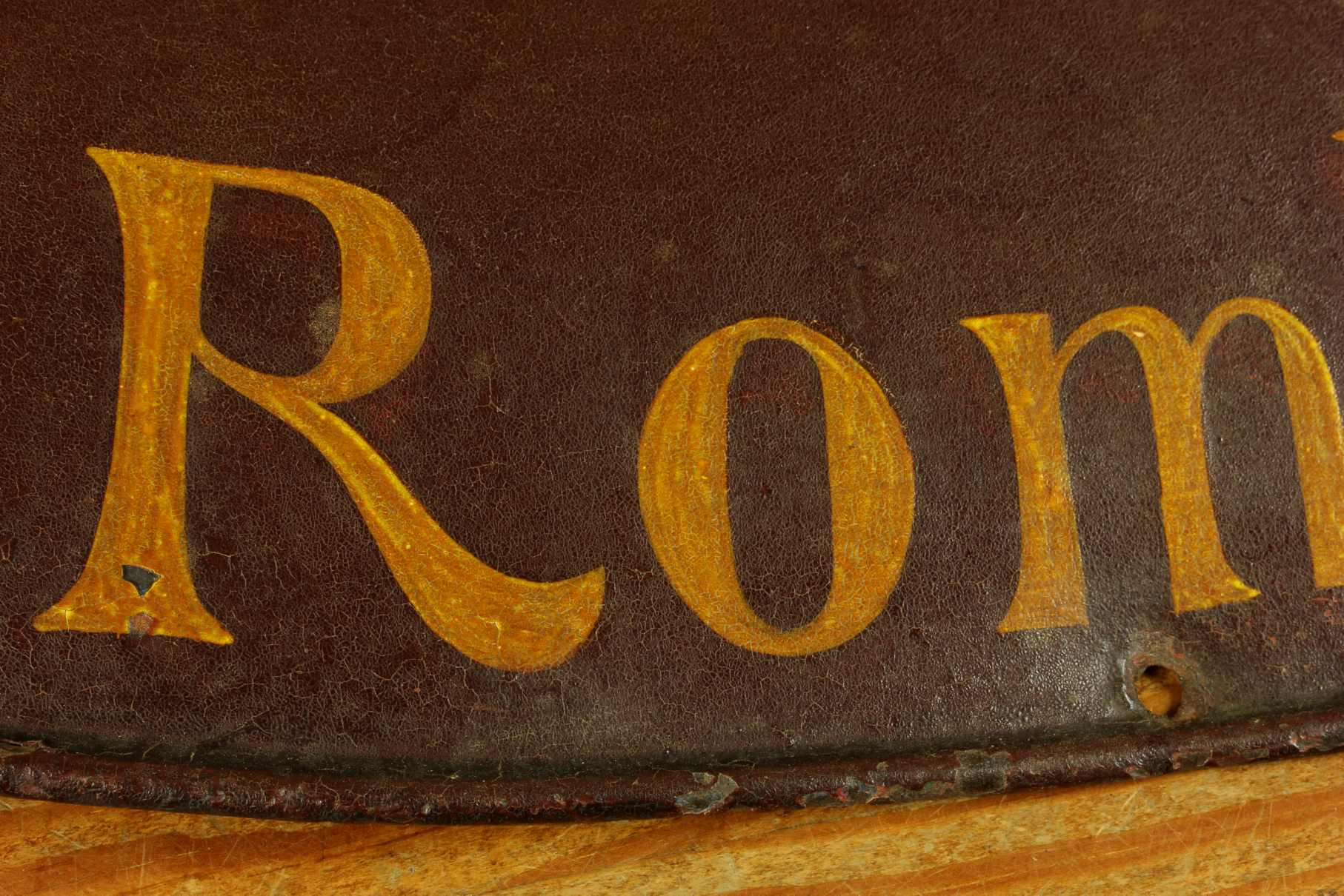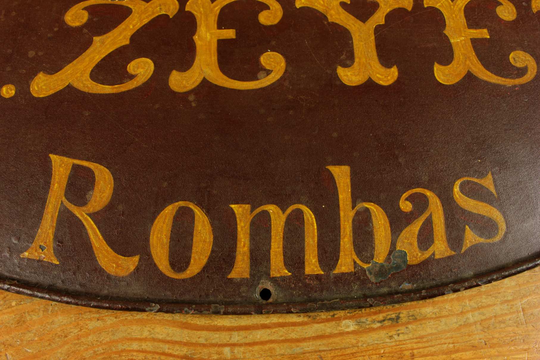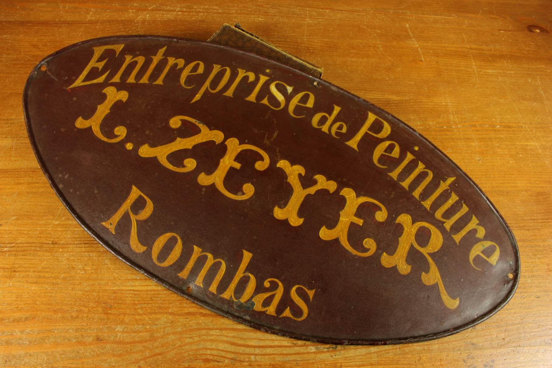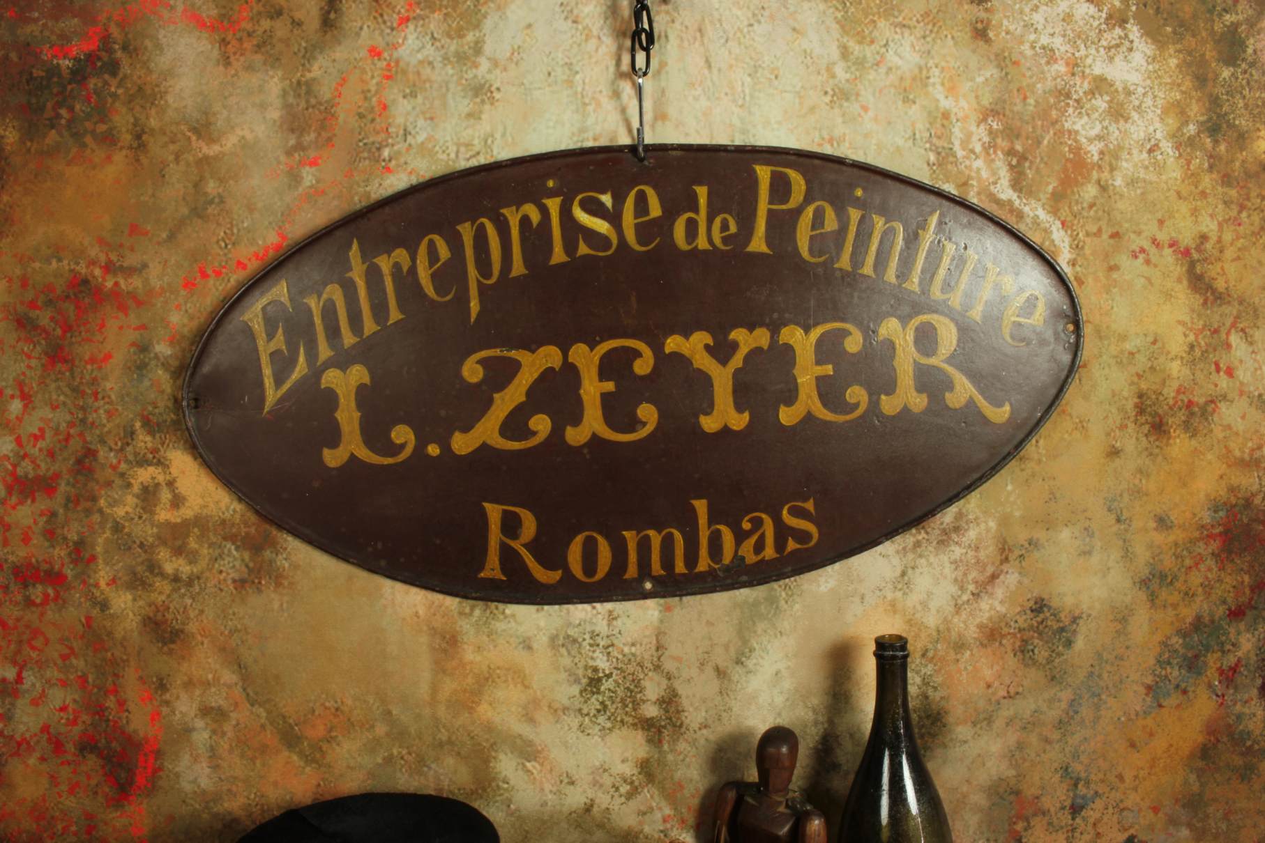 This fabulous highly decorative French tradesman's sign which is made of metal has a painted brown background with beautifully hand painted wording to the front in orange / brown that reads Entreprise de Peinture, L Zeyer, Rombas.