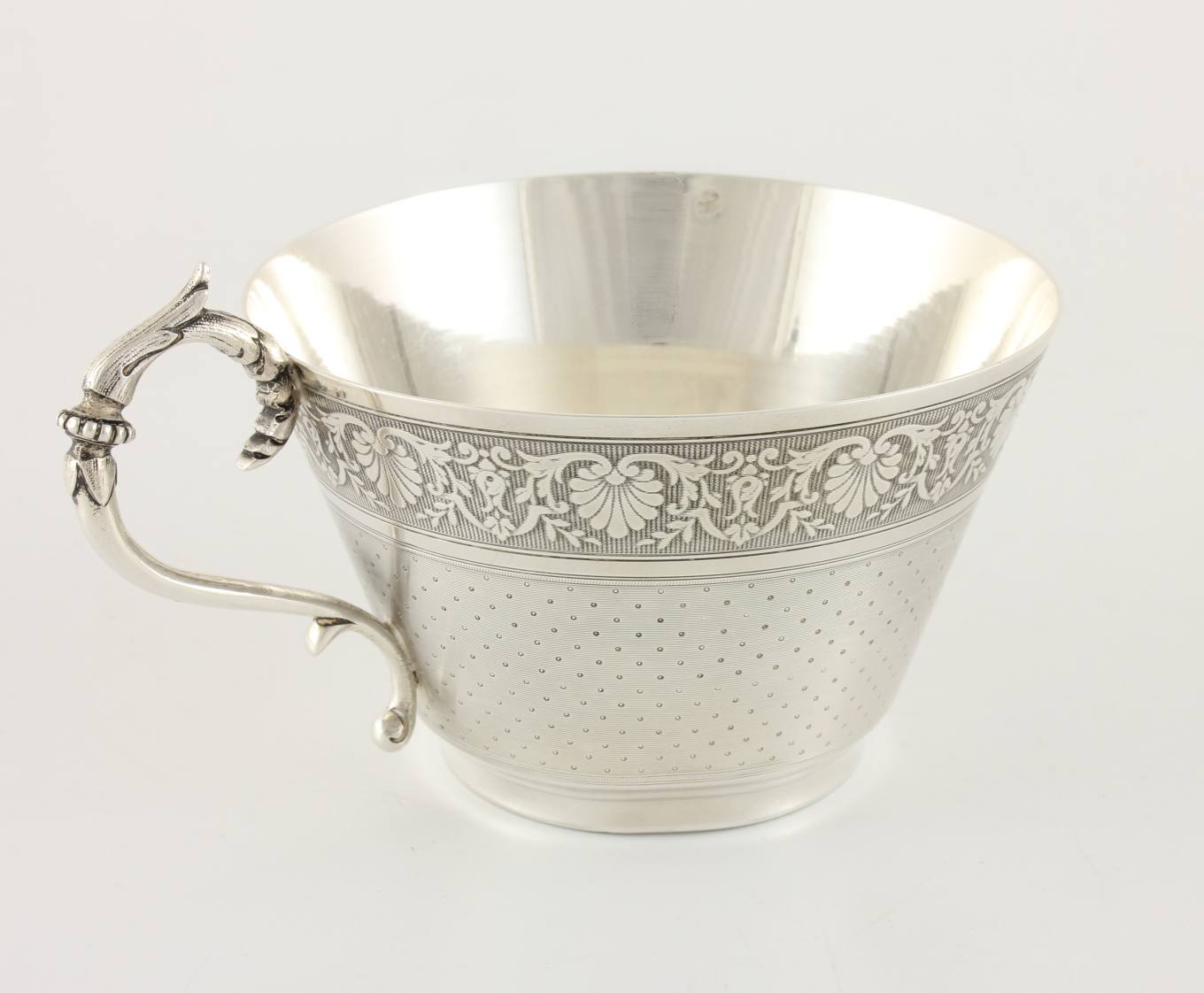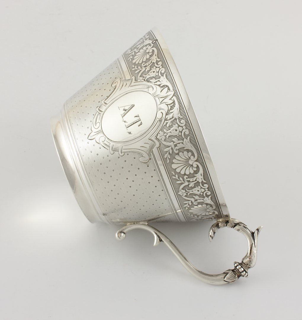 This French cup is monogrammed to the front with the letters A.T, has floral and engine turned decoration and a stylish handle.