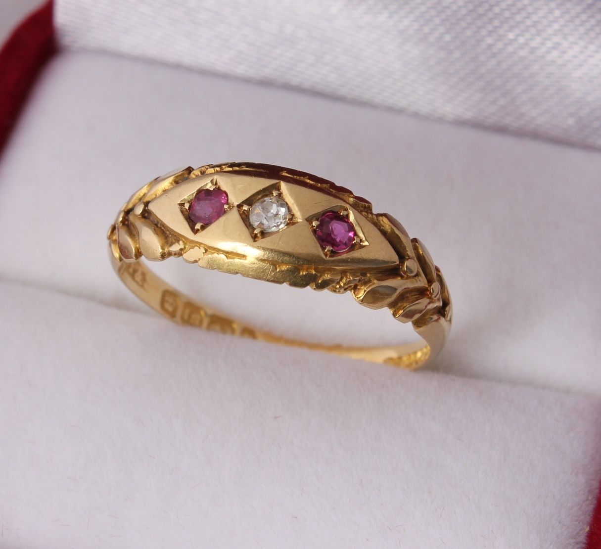 This beautiful antique Gypsy ring is crafted in 18ct gold and is set with a central Bright Natural Diamond with a ruby on either side. The ring is fully hallmarked for 18ct gold with the date letter for 1895.