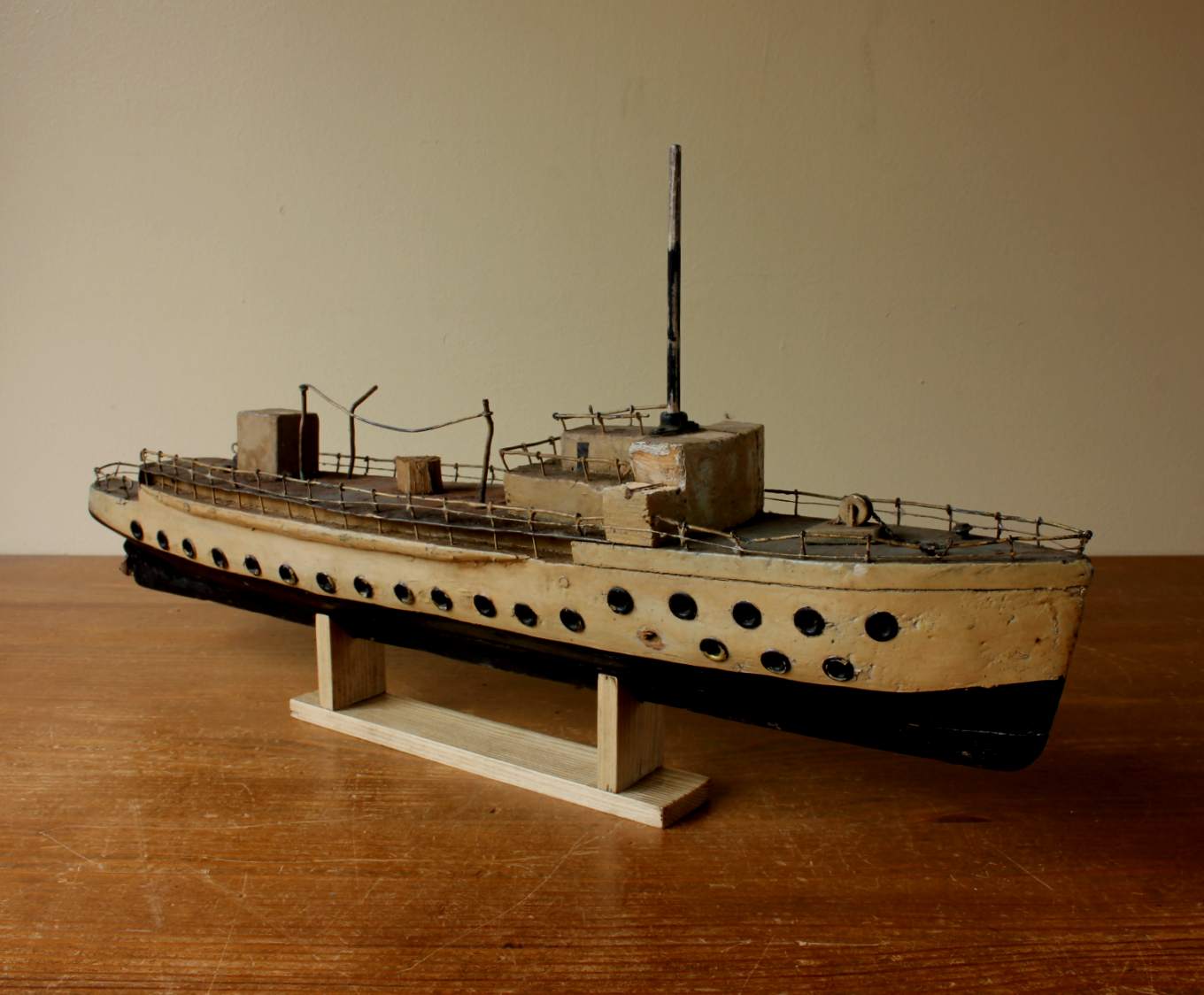 This handsome model boat which would have been lovingly made by hand using wood and metal has a cream and black painted hull, wirework to the deck and sits on a wooden display stand.