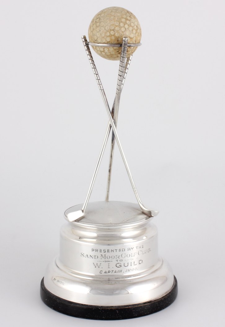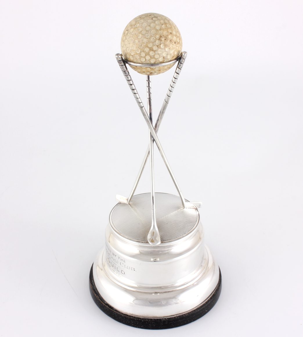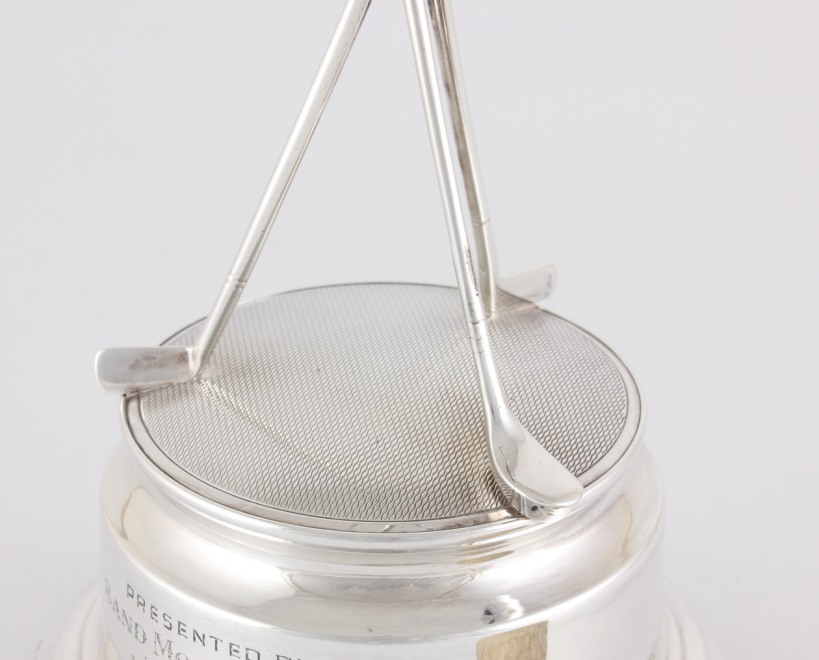 This hallmarked silver golf trophy which features three crossed golf clubs with a golf ball holder at the top is by Sanders & Mackenzie and is unusual as the base section is also made of silver with a wood bottom.