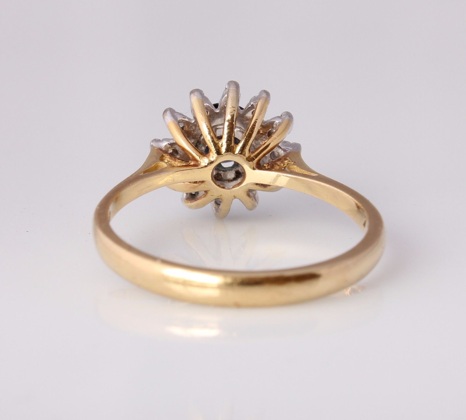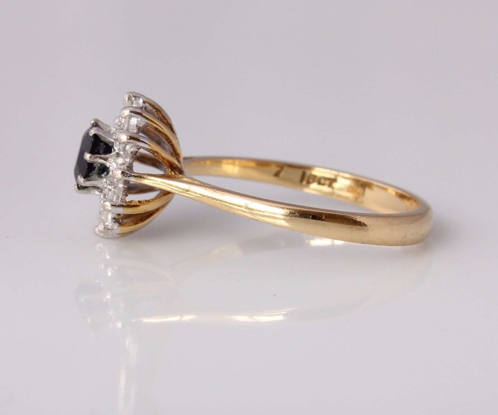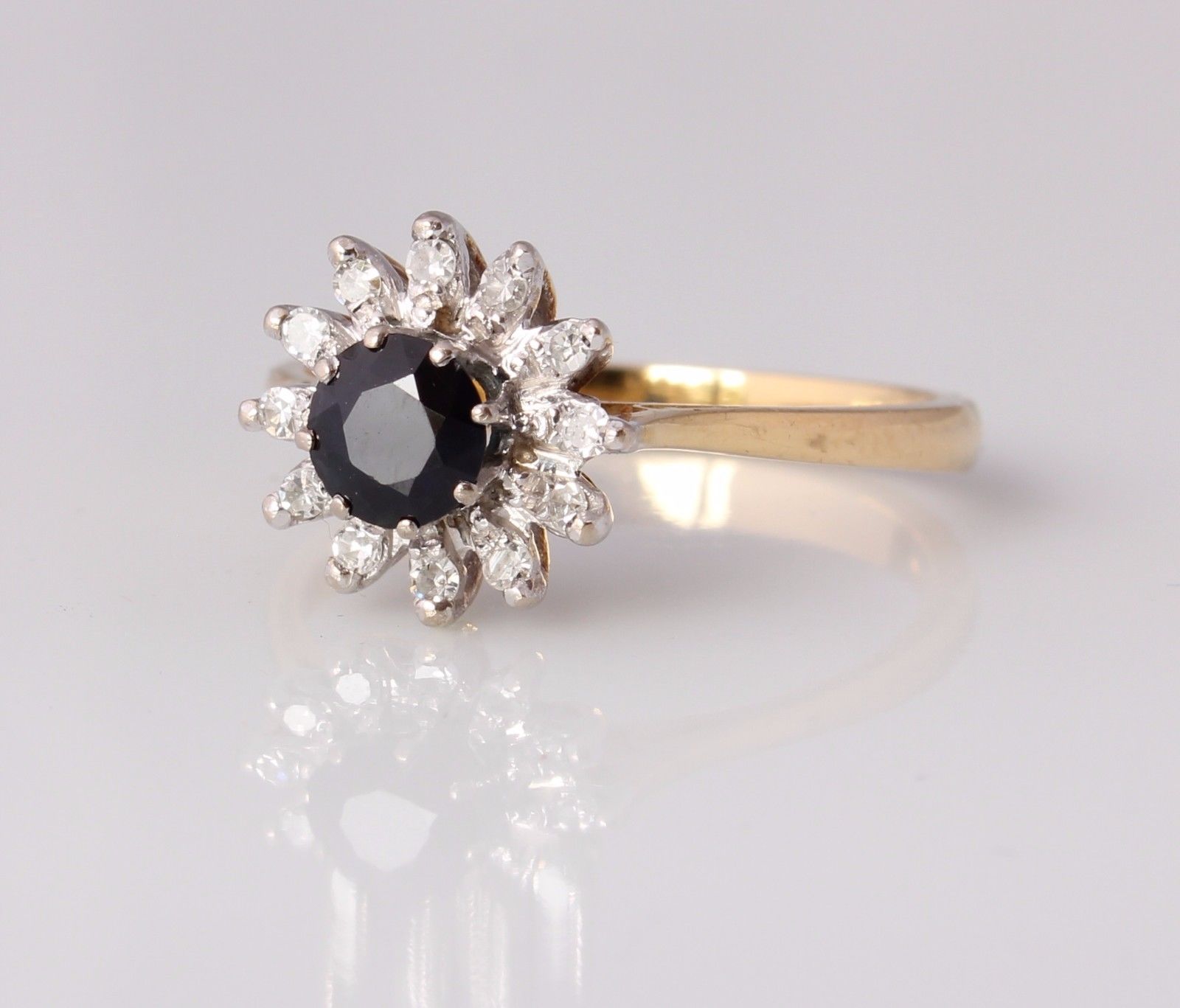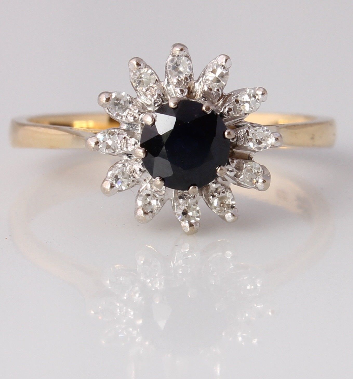This pretty 18ct yellow gold ring has a central circular sapphire with a single cut natural diamond surround.