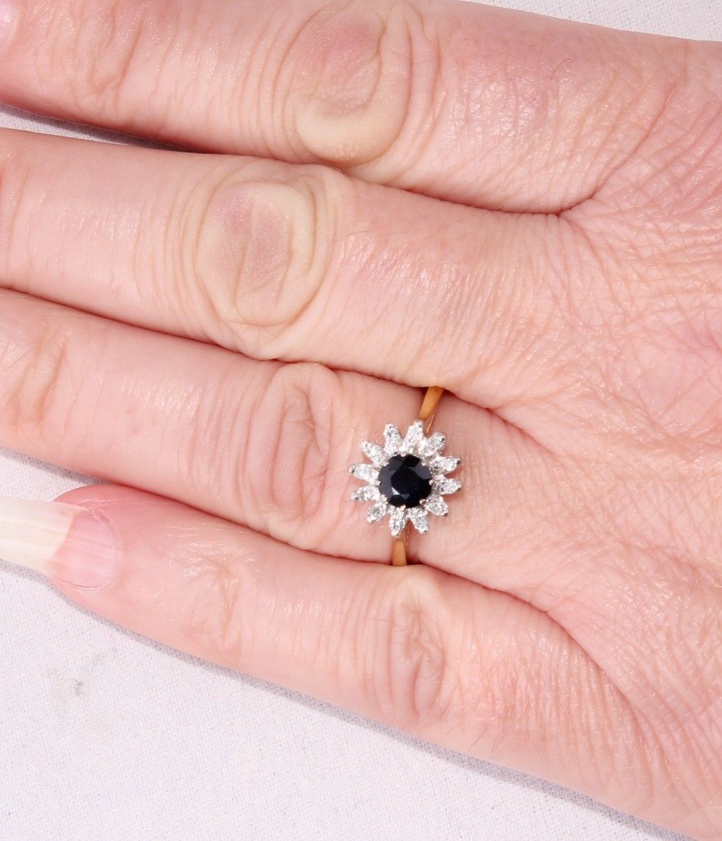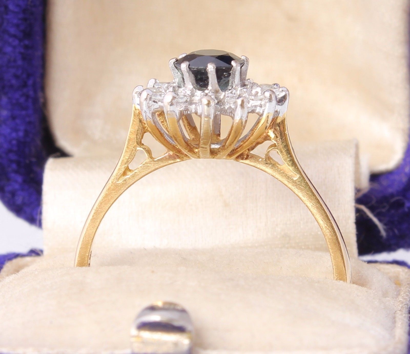 The sapphire is a lovely deep blue with good saturation and the diamonds are well matched and bright.