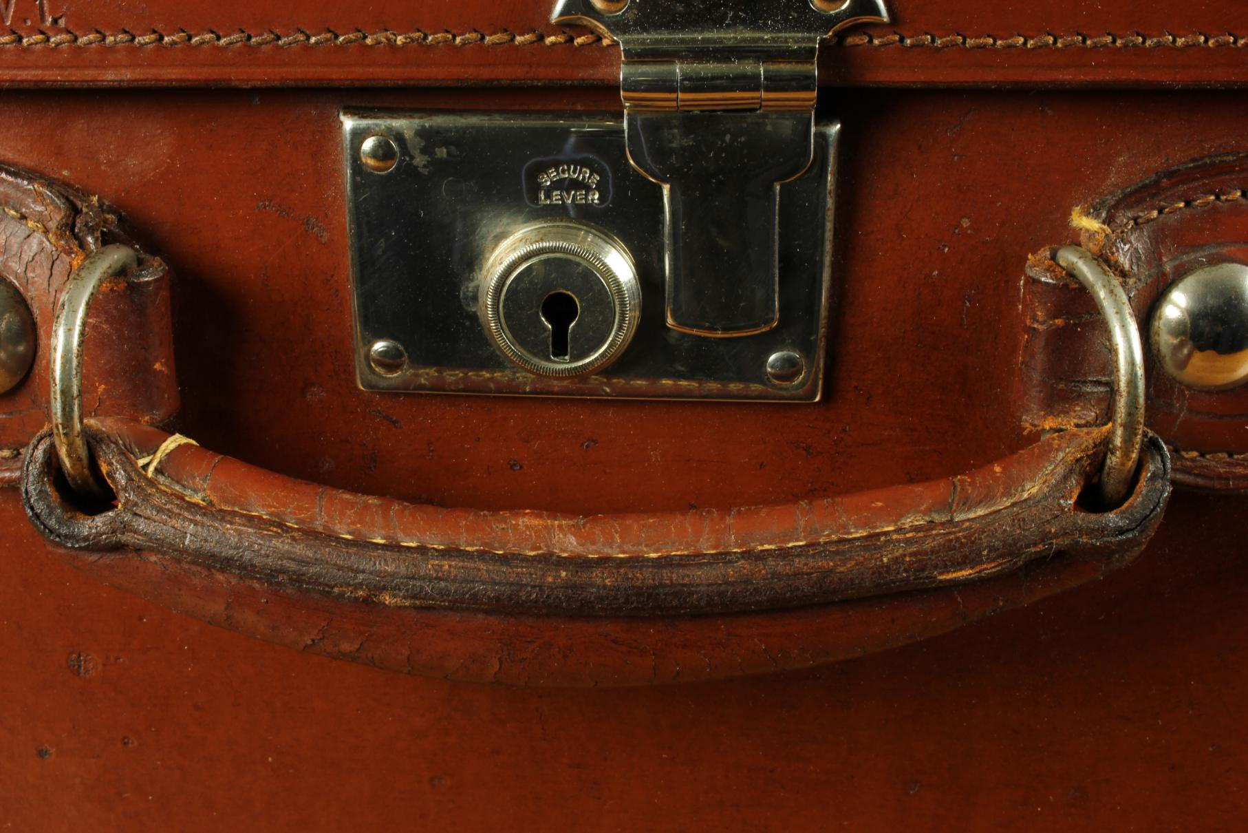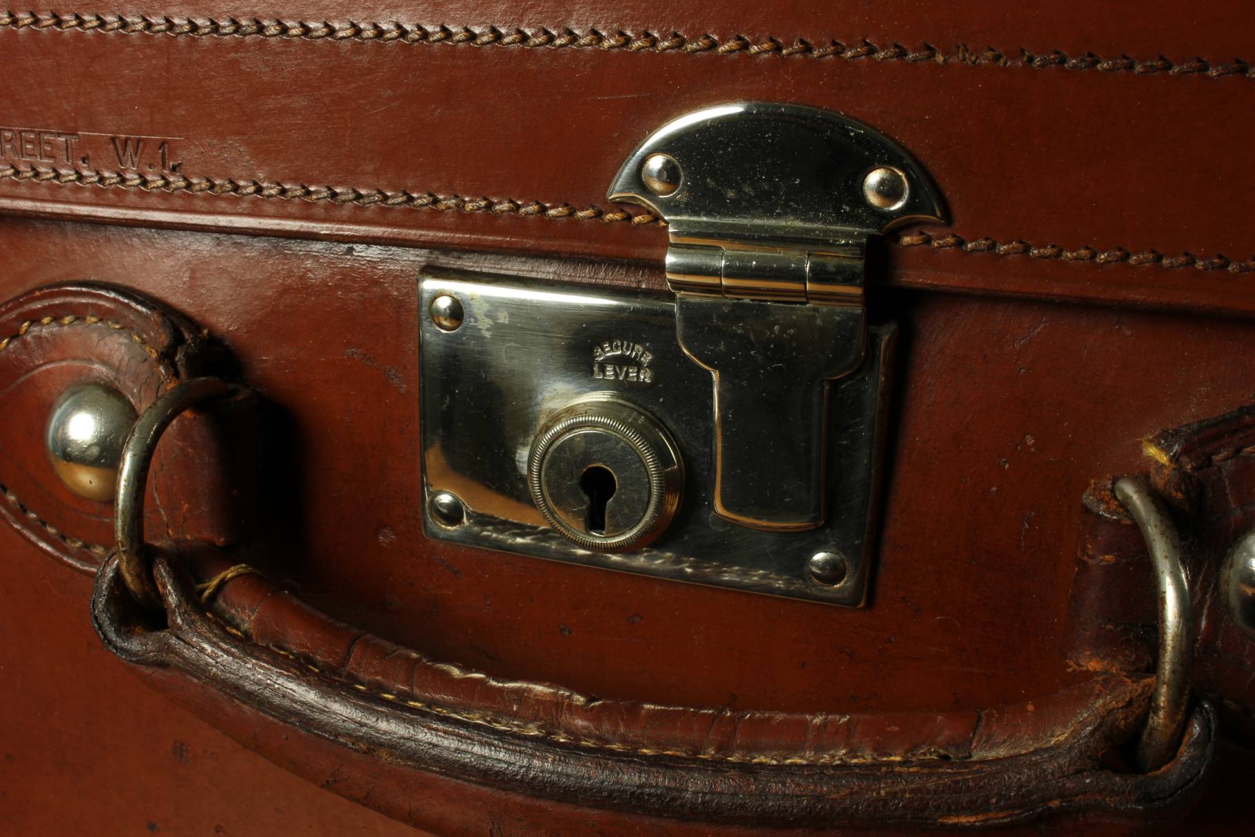 The beautiful case which has a wonderful patina has metal fittings, a metal lock which is marked Secure Lever, a leather carry handle, is nicely monogrammed W.A.A to the lid, stud feet to the underside, leather inner straps and is embossed with the maker's details. The lock works with the key.