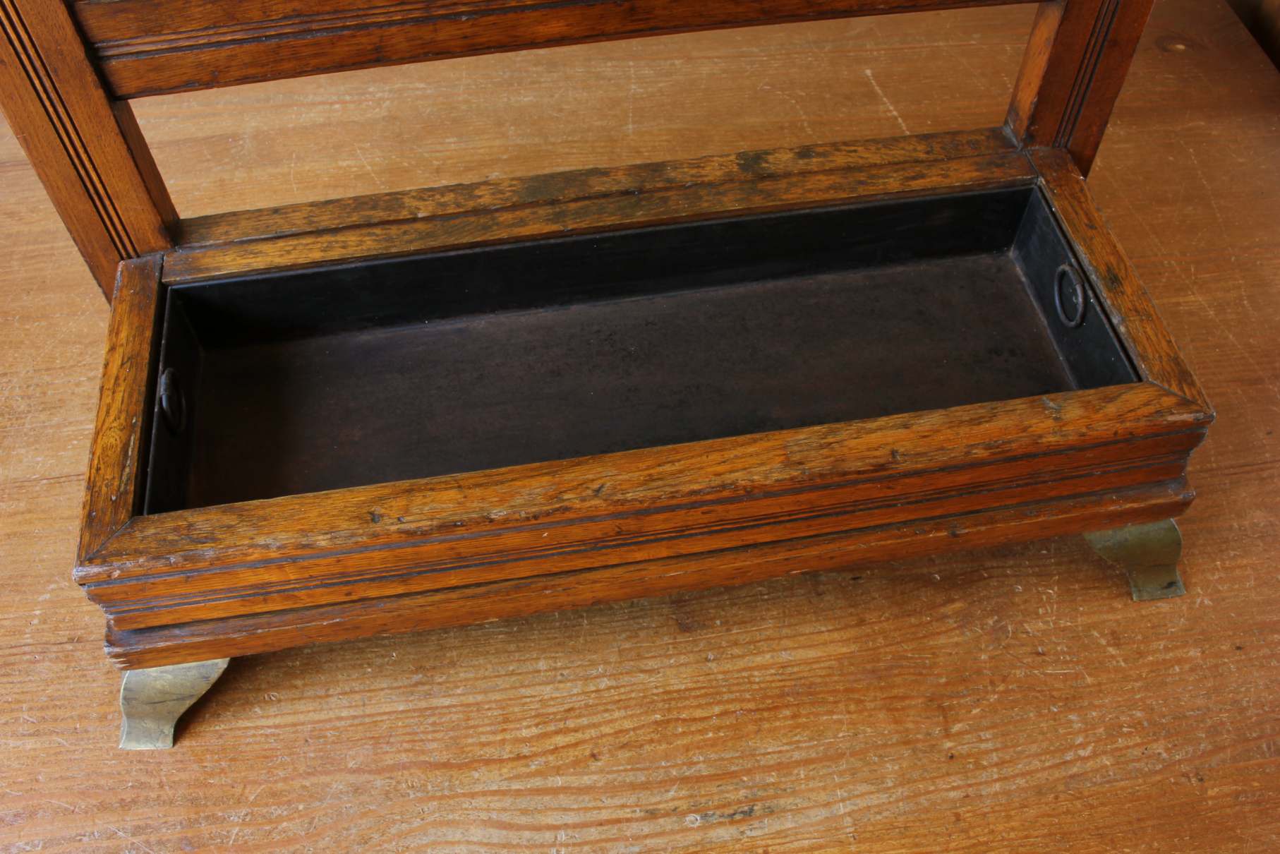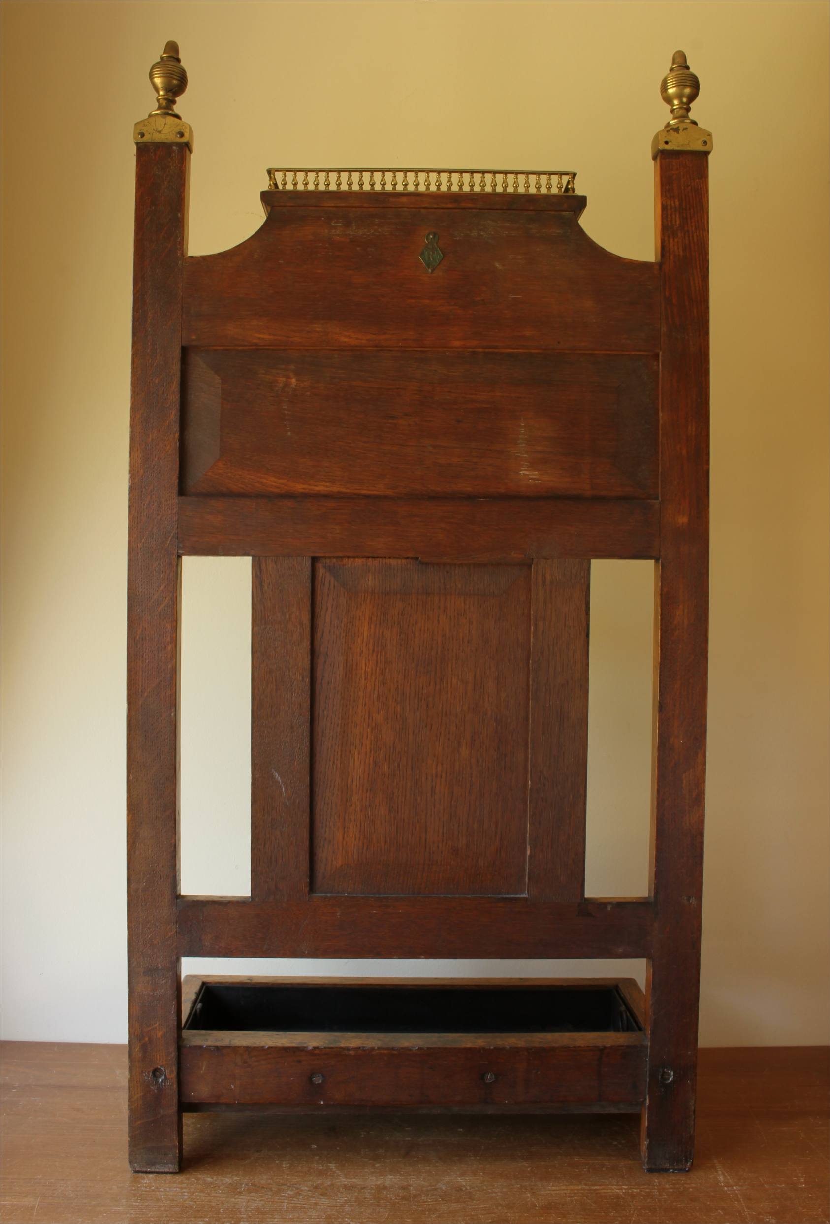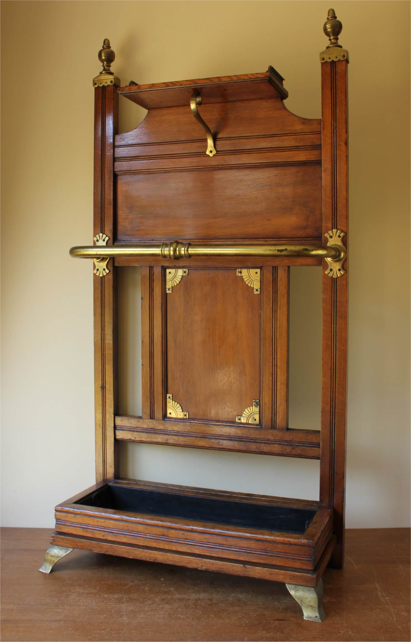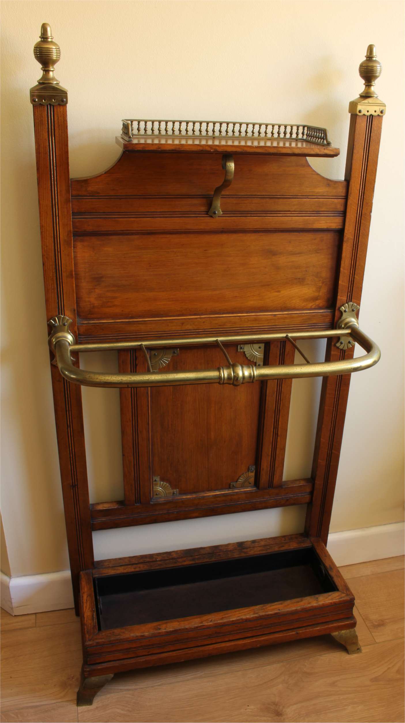 This fine quality Victorian hall stand which dates from the 19th century is well made of oak, has brass finials and fittings, a removable lower drip tray and has a wonderful rich patina.