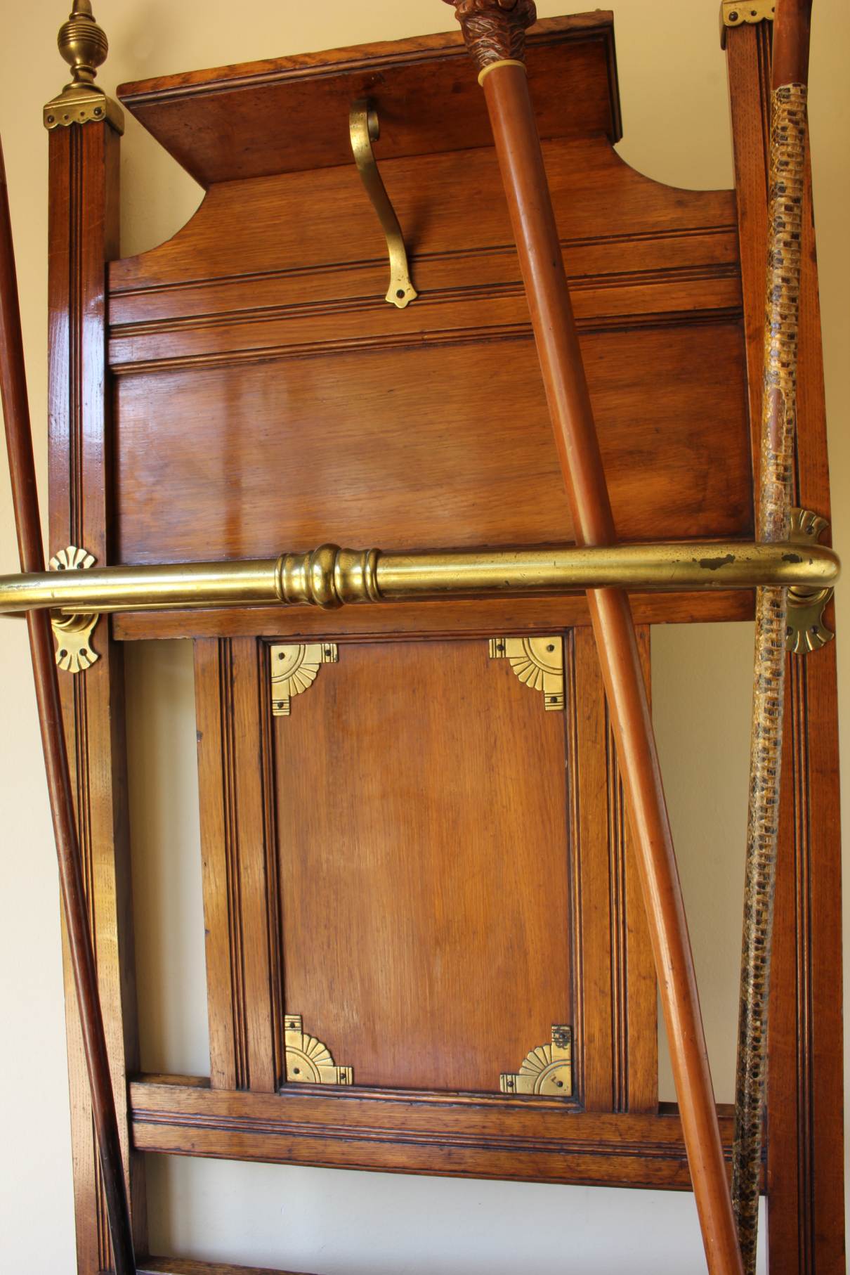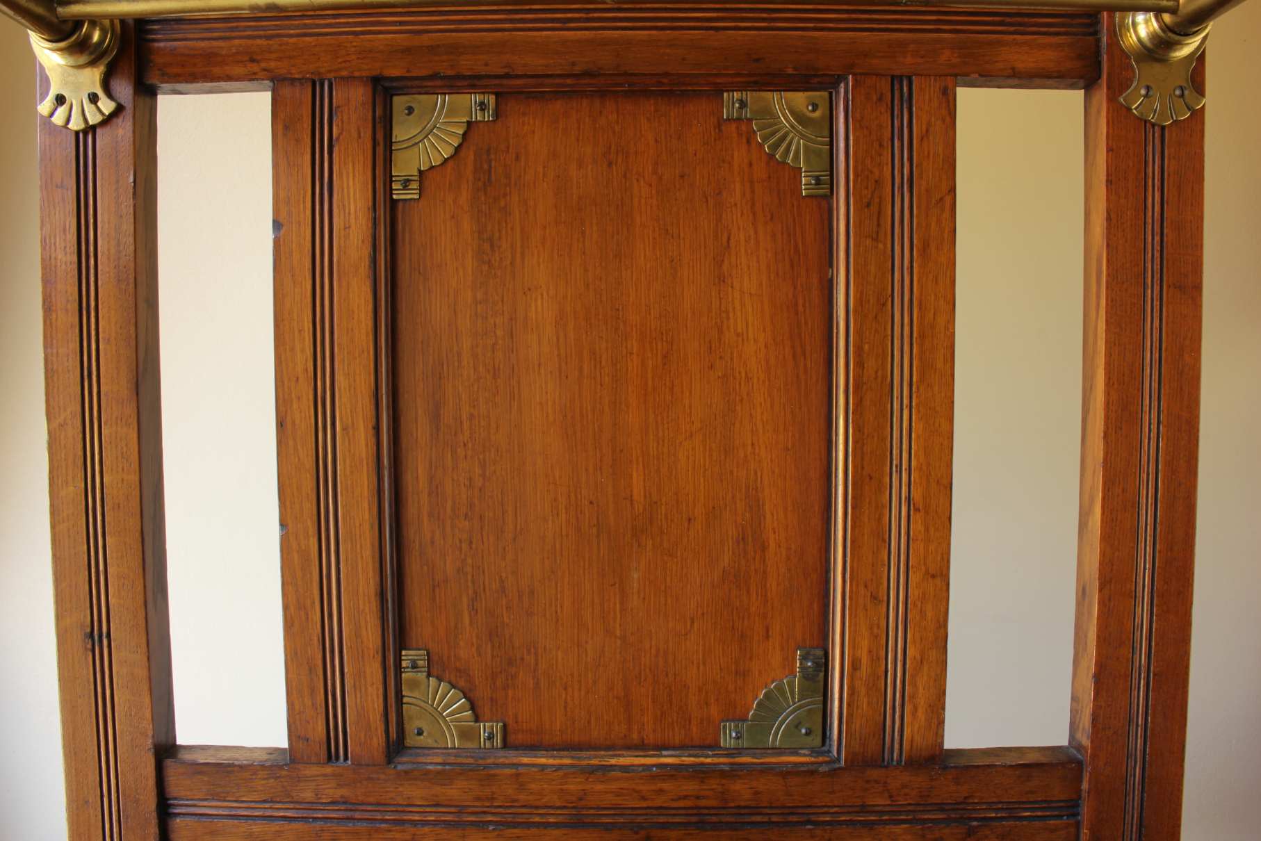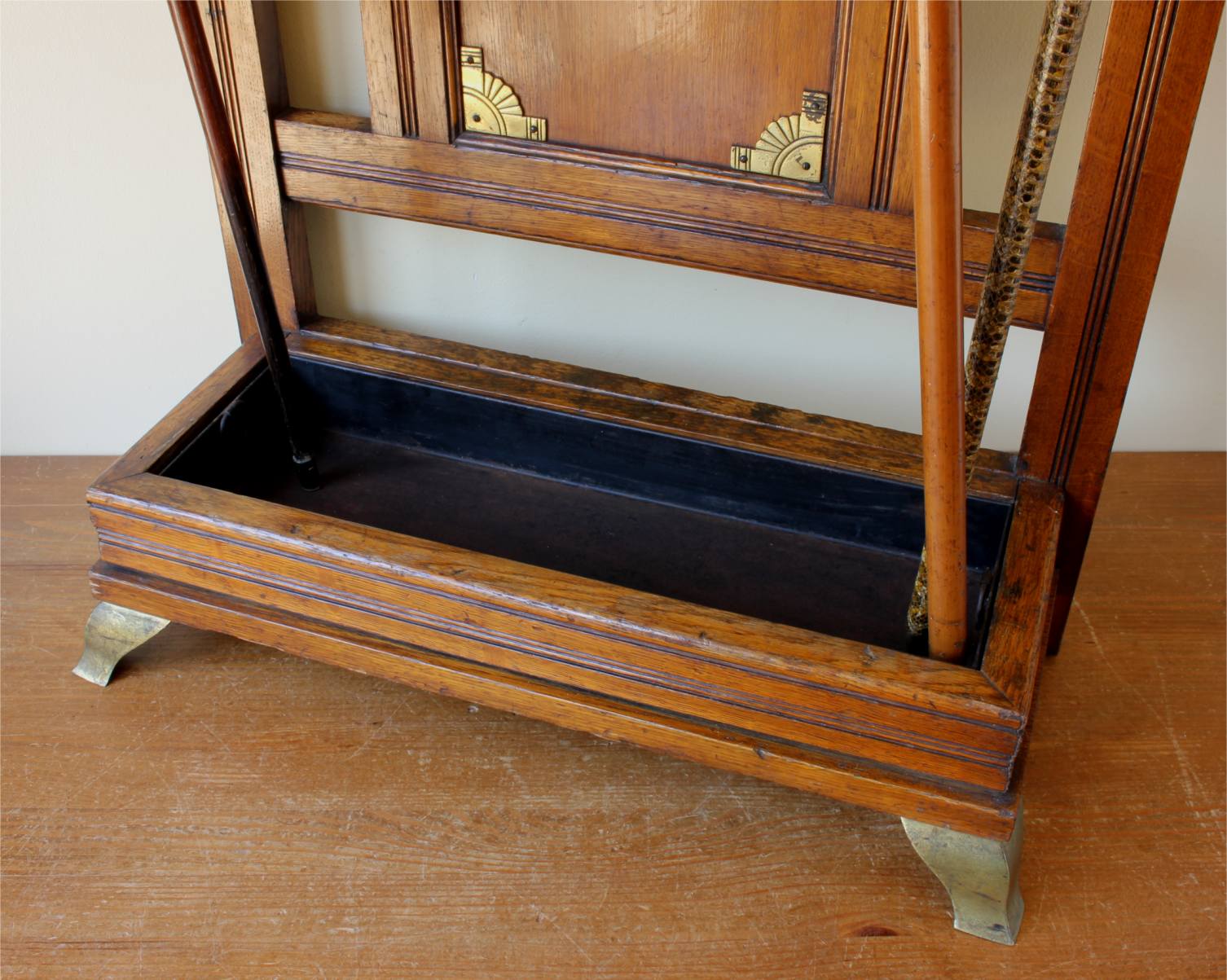 This fine quality Victorian hall stand which dates from the 19th century is well made of oak, has brass finials and fittings, a removable lower drip tray and has a wonderful rich patina.