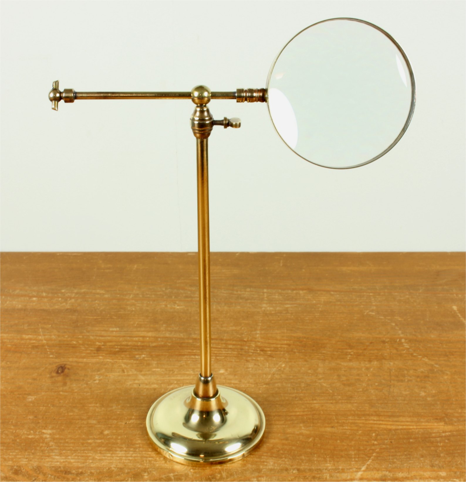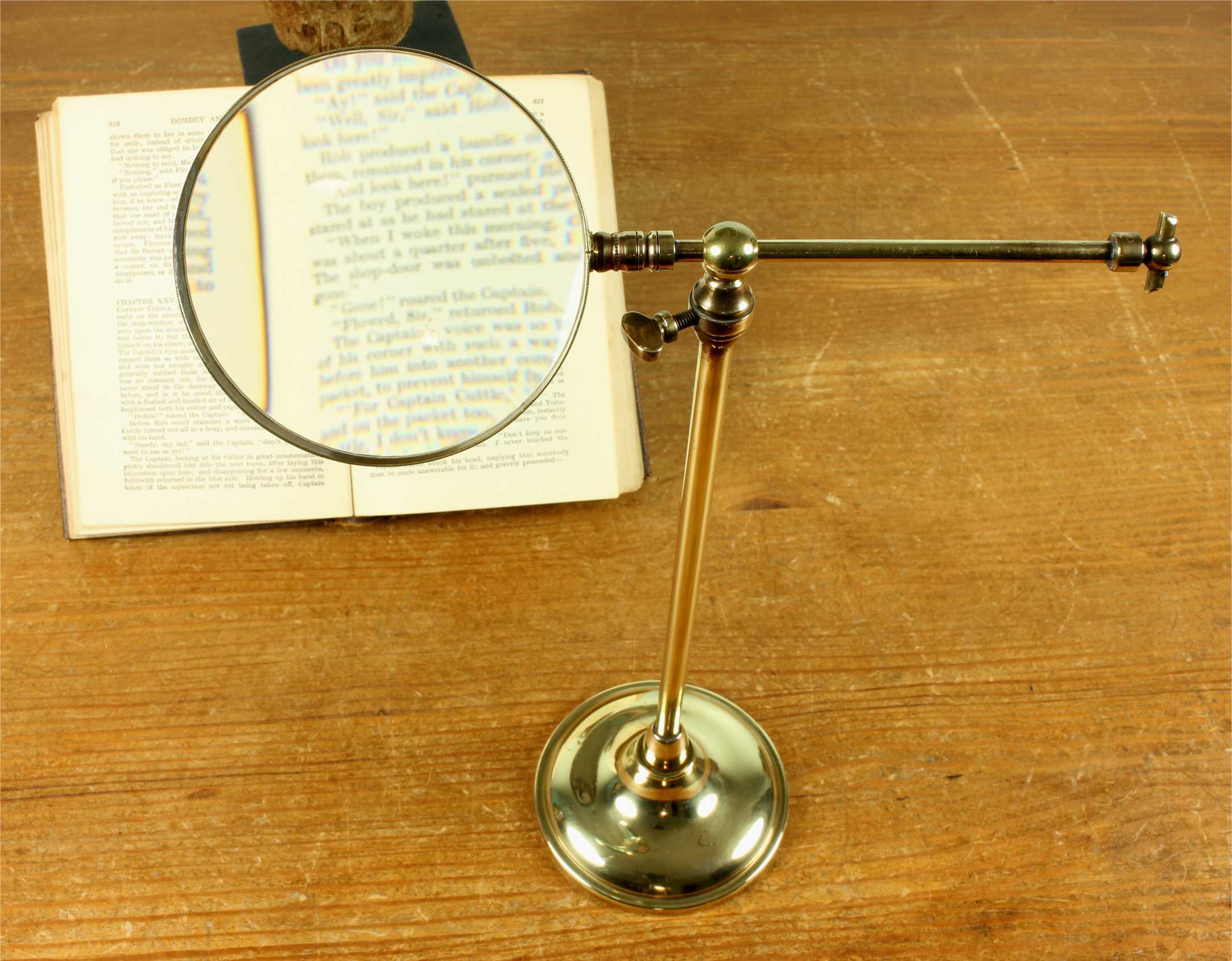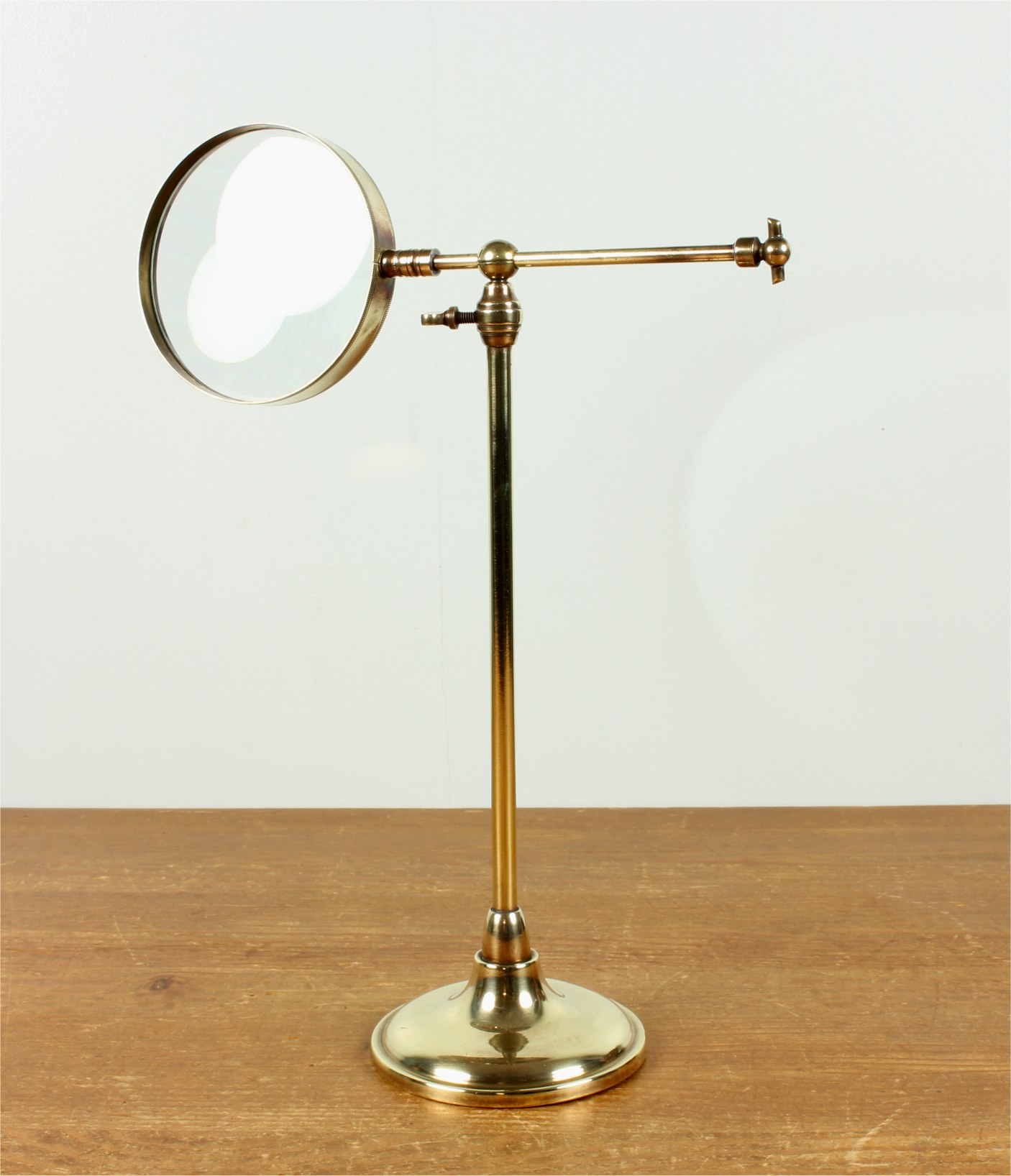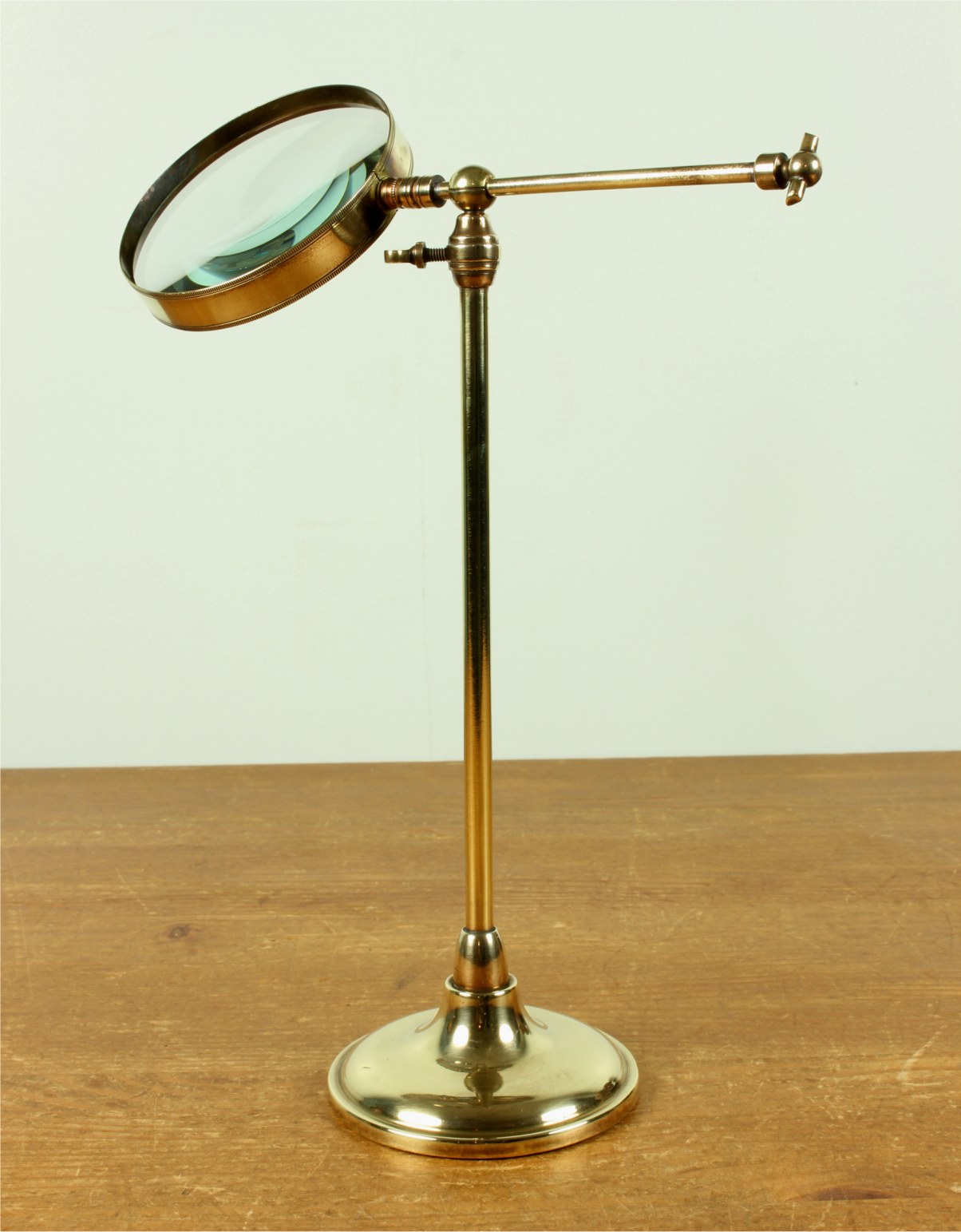 This brass stand which sits on a table top can have it's height adjusted by loosening the central screw and sliding and swivelling the arm to your required height and position.