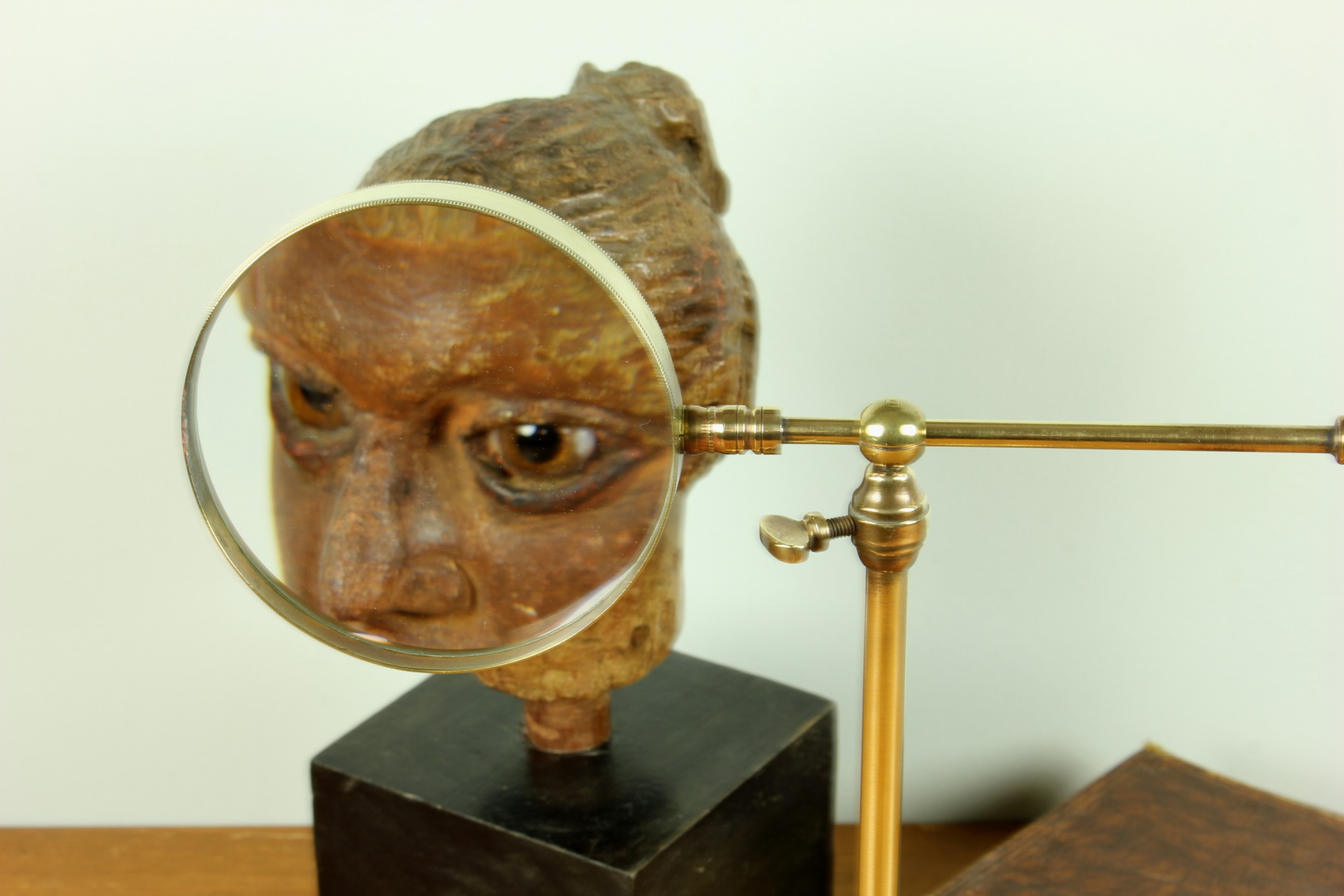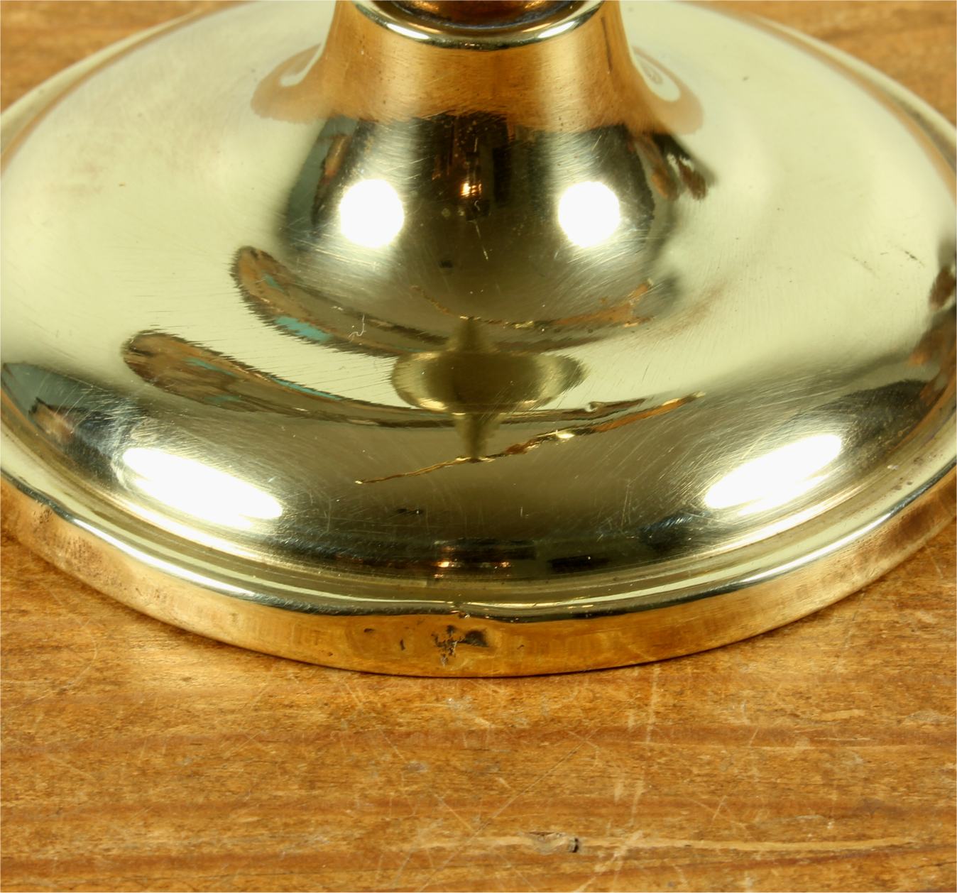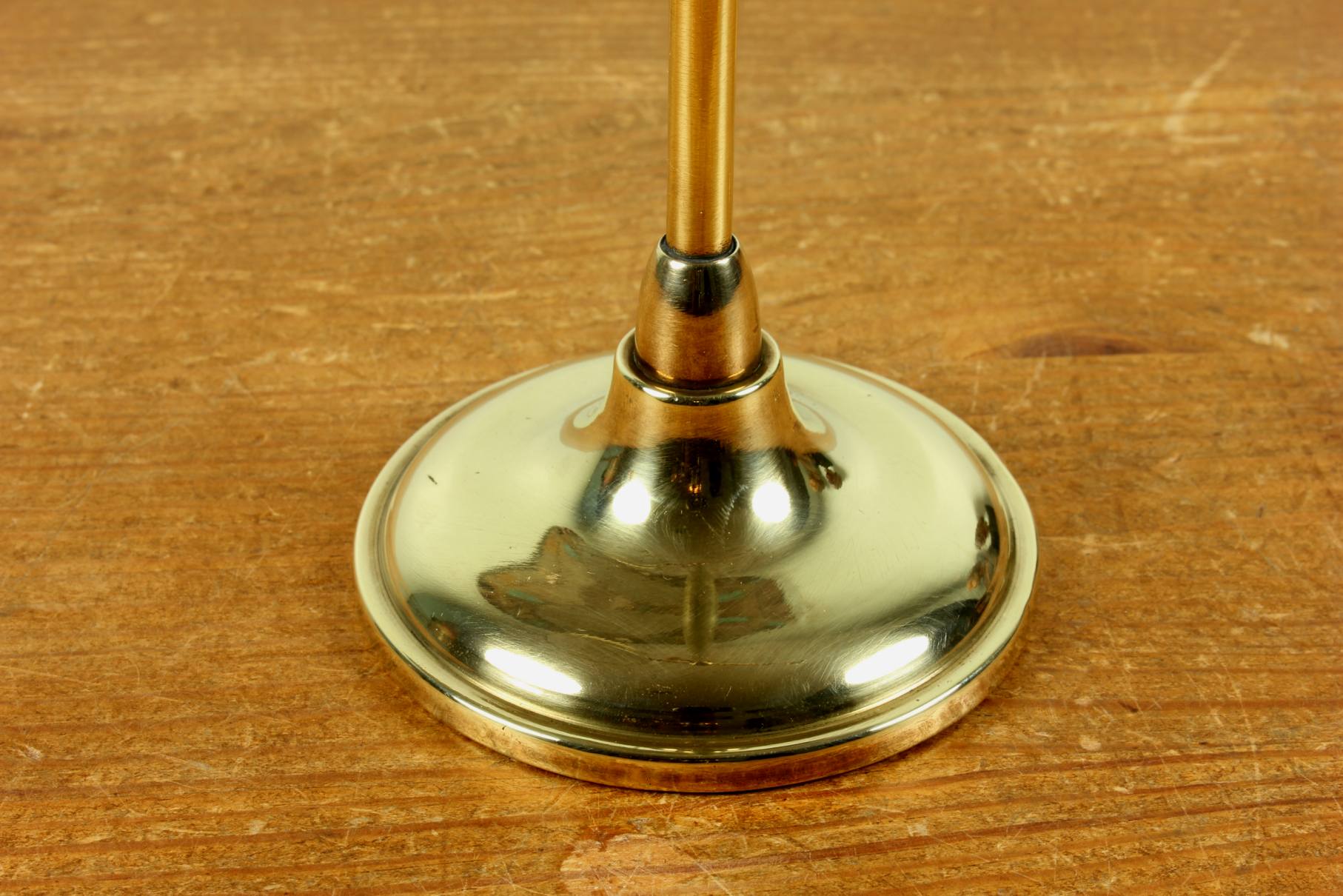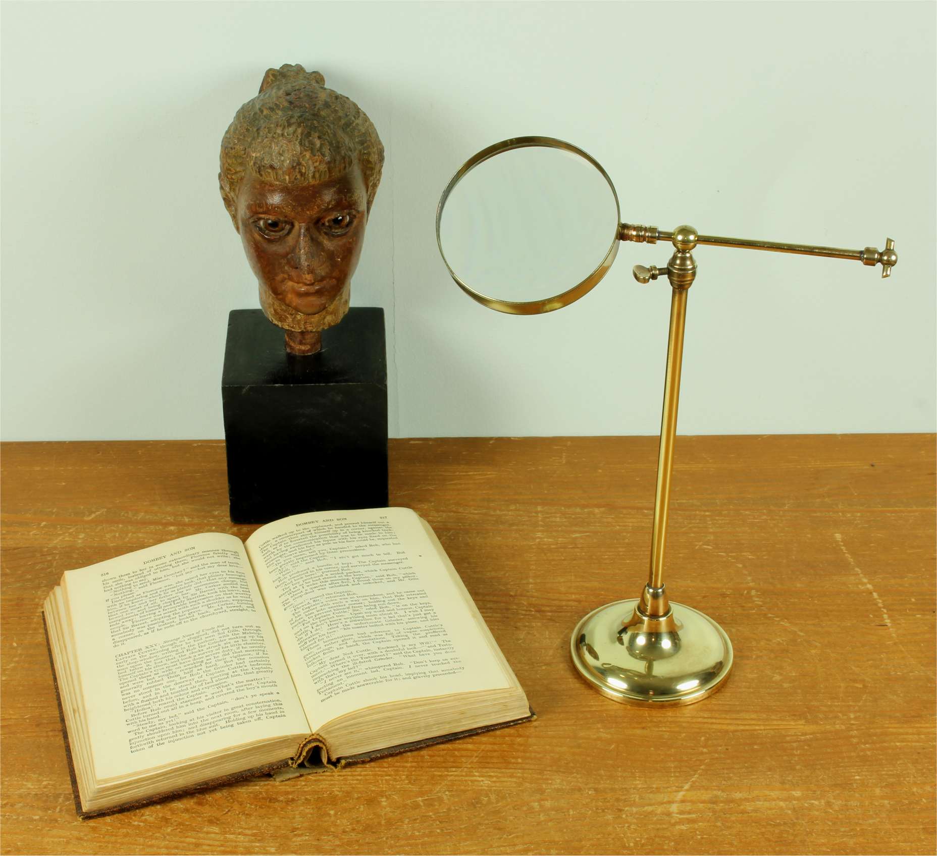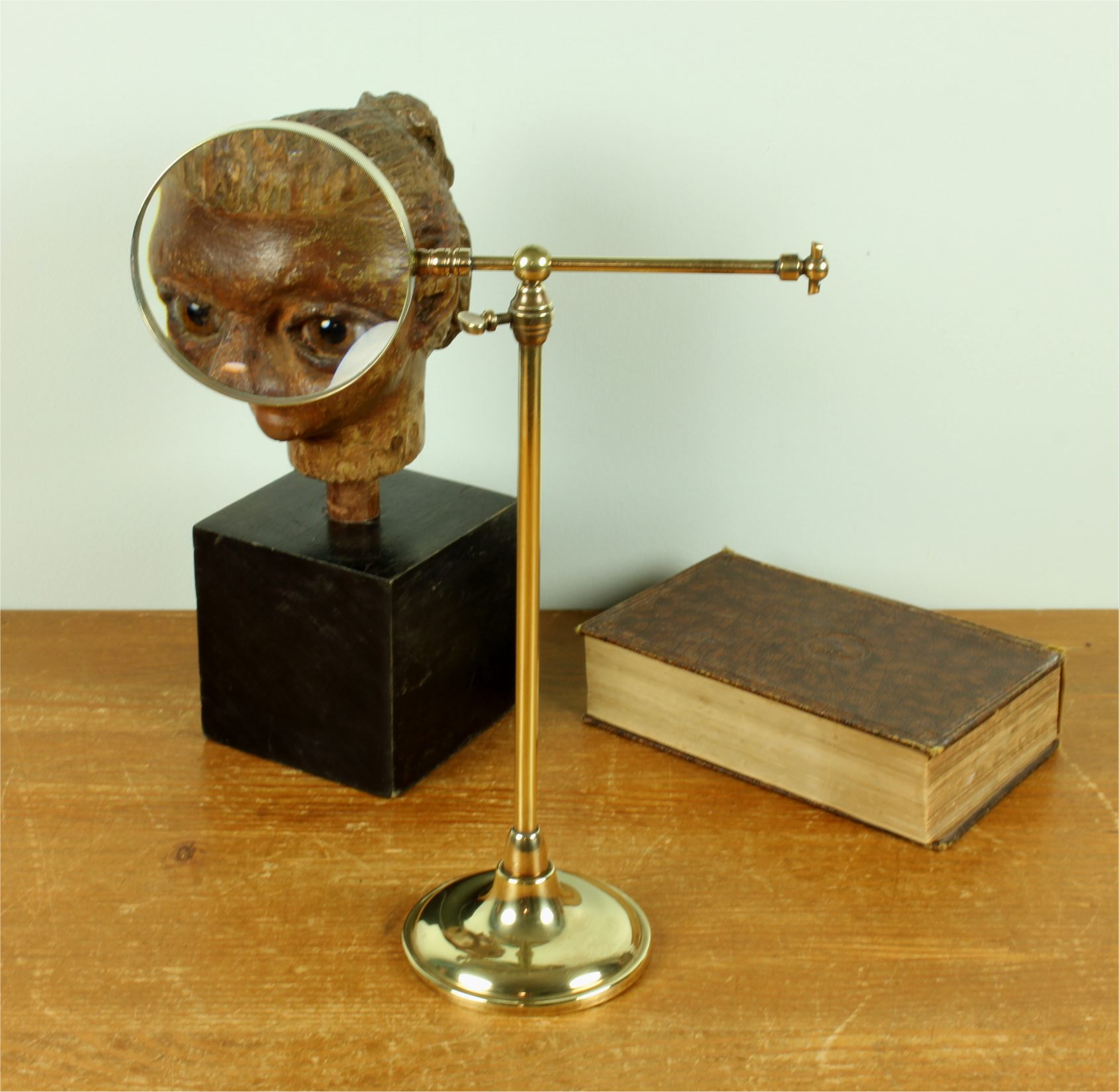 This brass stand which sits on a table top can have it's height adjusted by loosening the central screw and sliding and swivelling the arm to your required height and position.