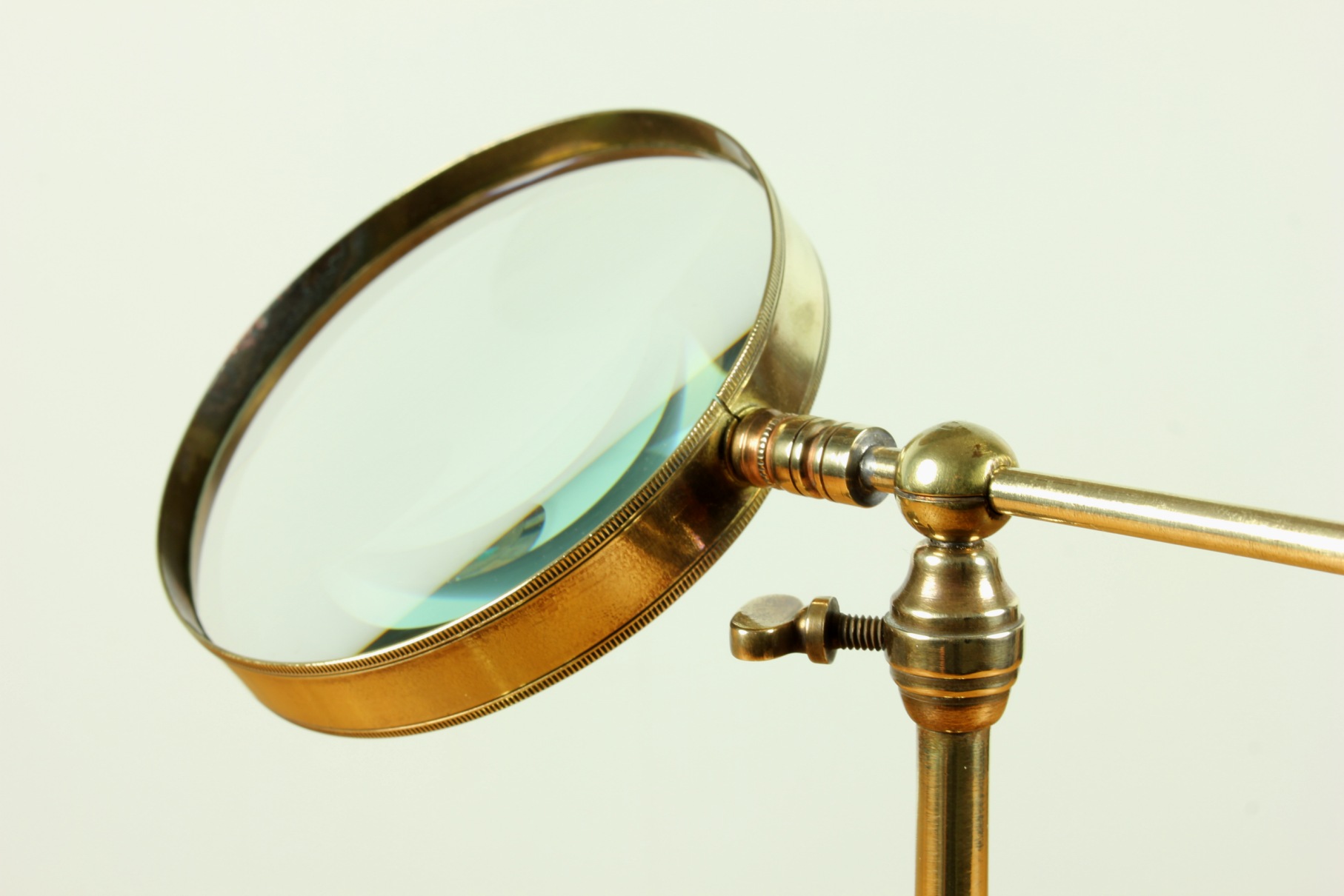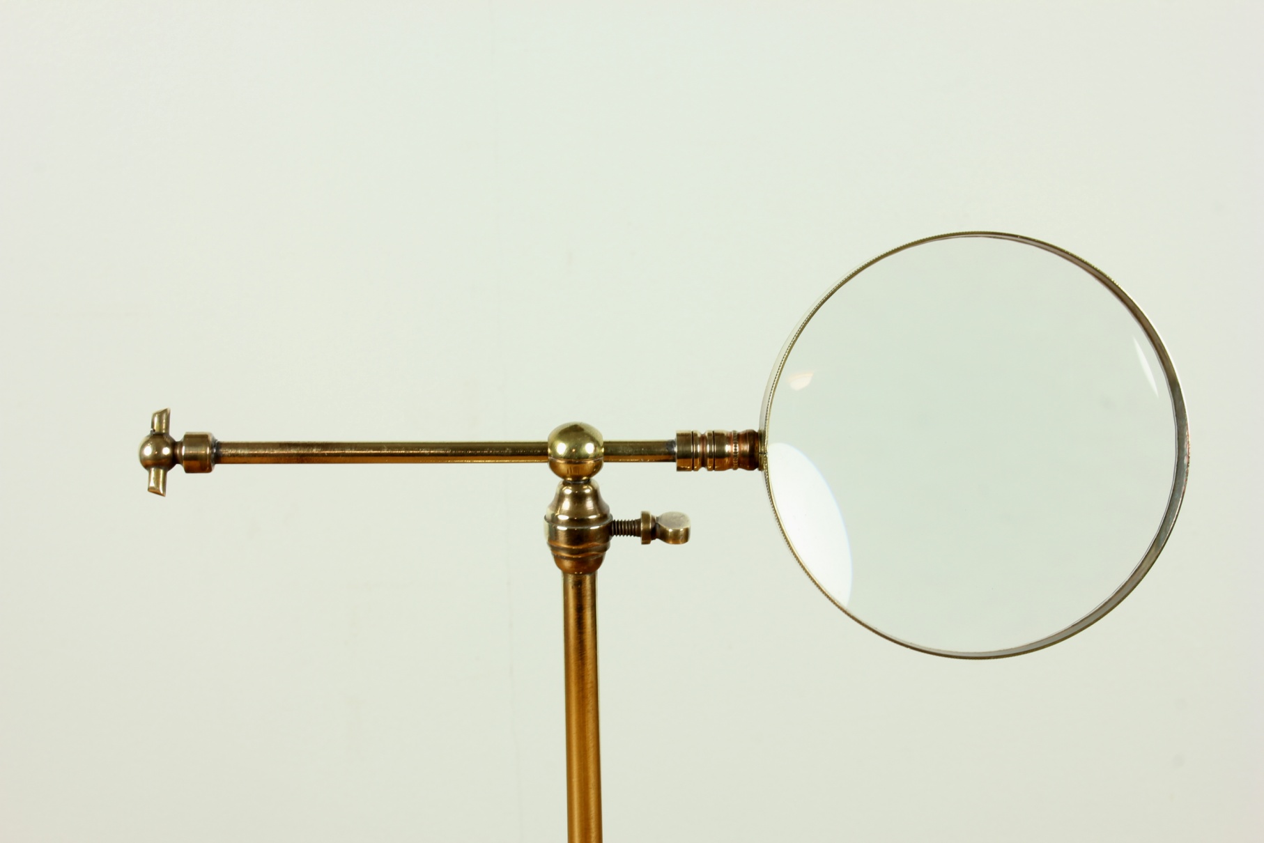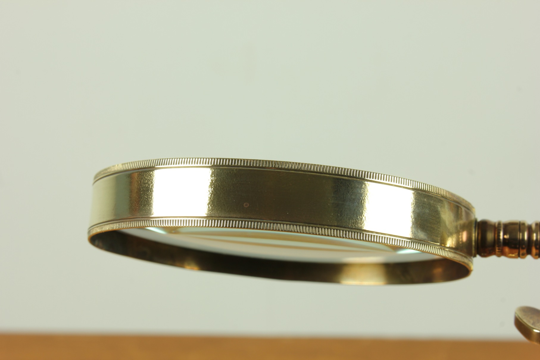 This fine quality antique French magnifying glass which is made of brass dates from the early 1900's has a round weighted base which is embossed to the underside with Siegel. 9. 19 Rue Reaumur Paris and has an extendable arm which holds a circular magnifying lens.