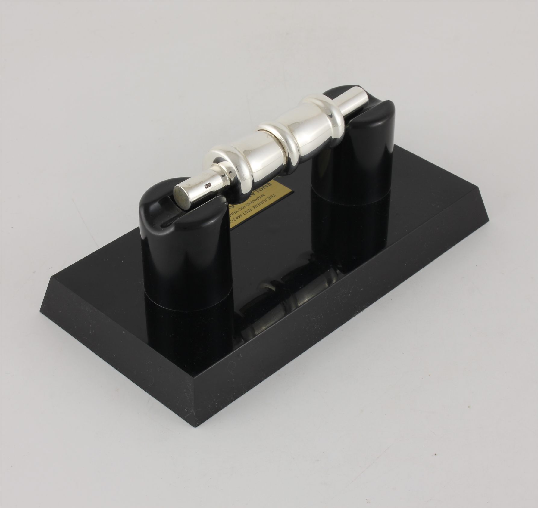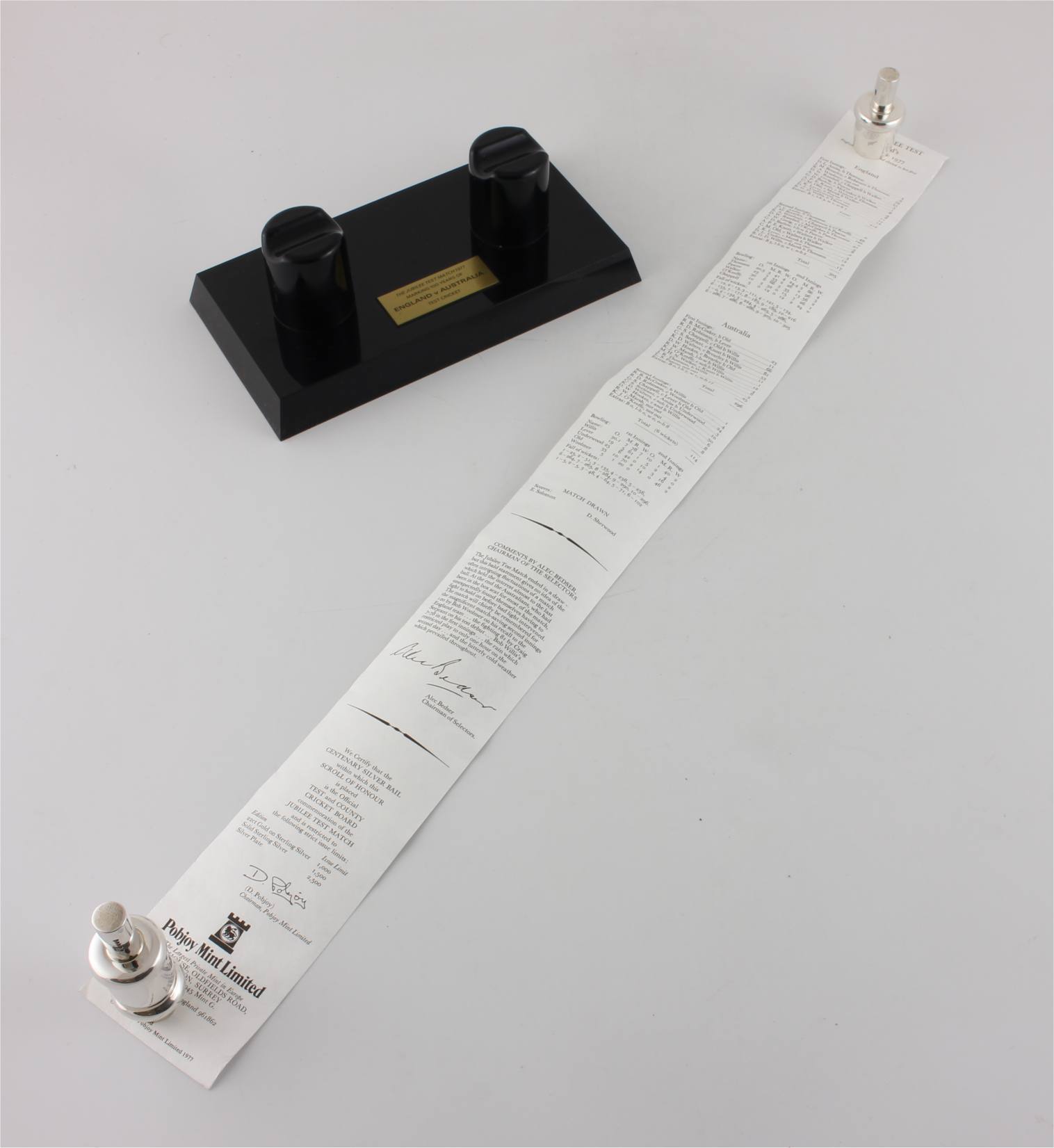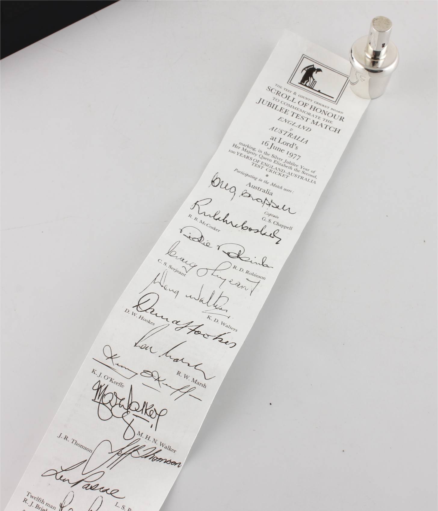 This silver bail unscrews to reveal a paper scroll recording the scores of the Centenary Test Match at Lord's along with the player's names and facsimile signatures.