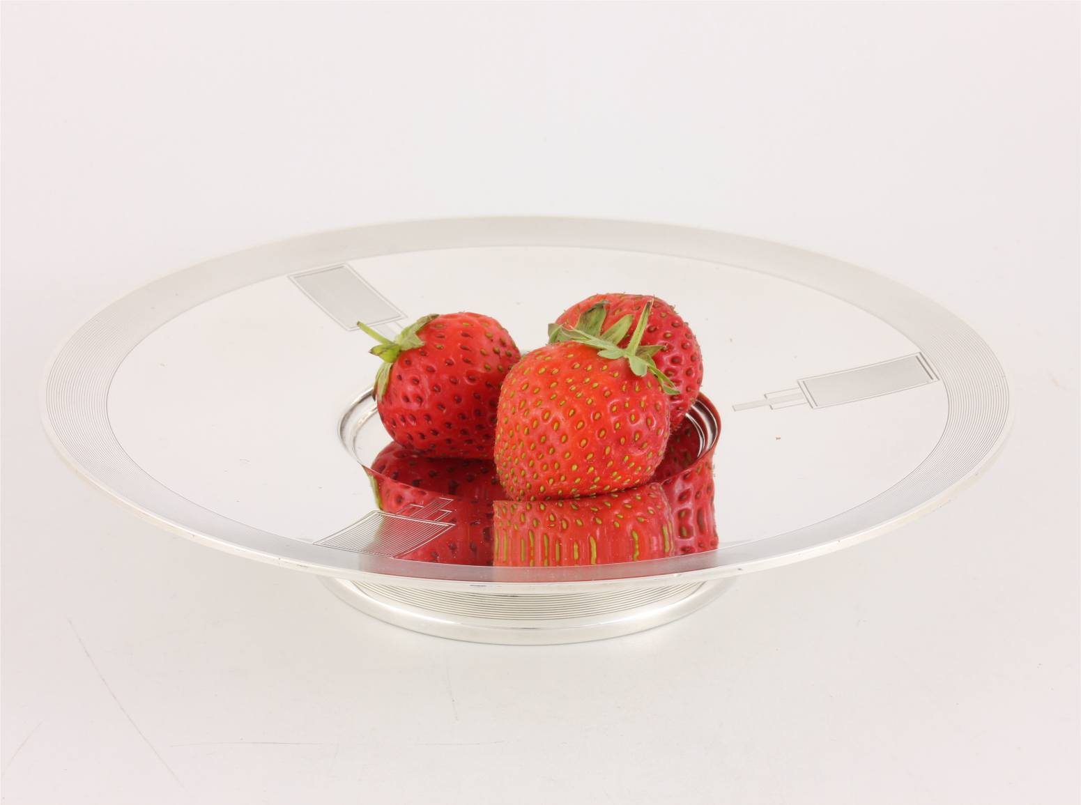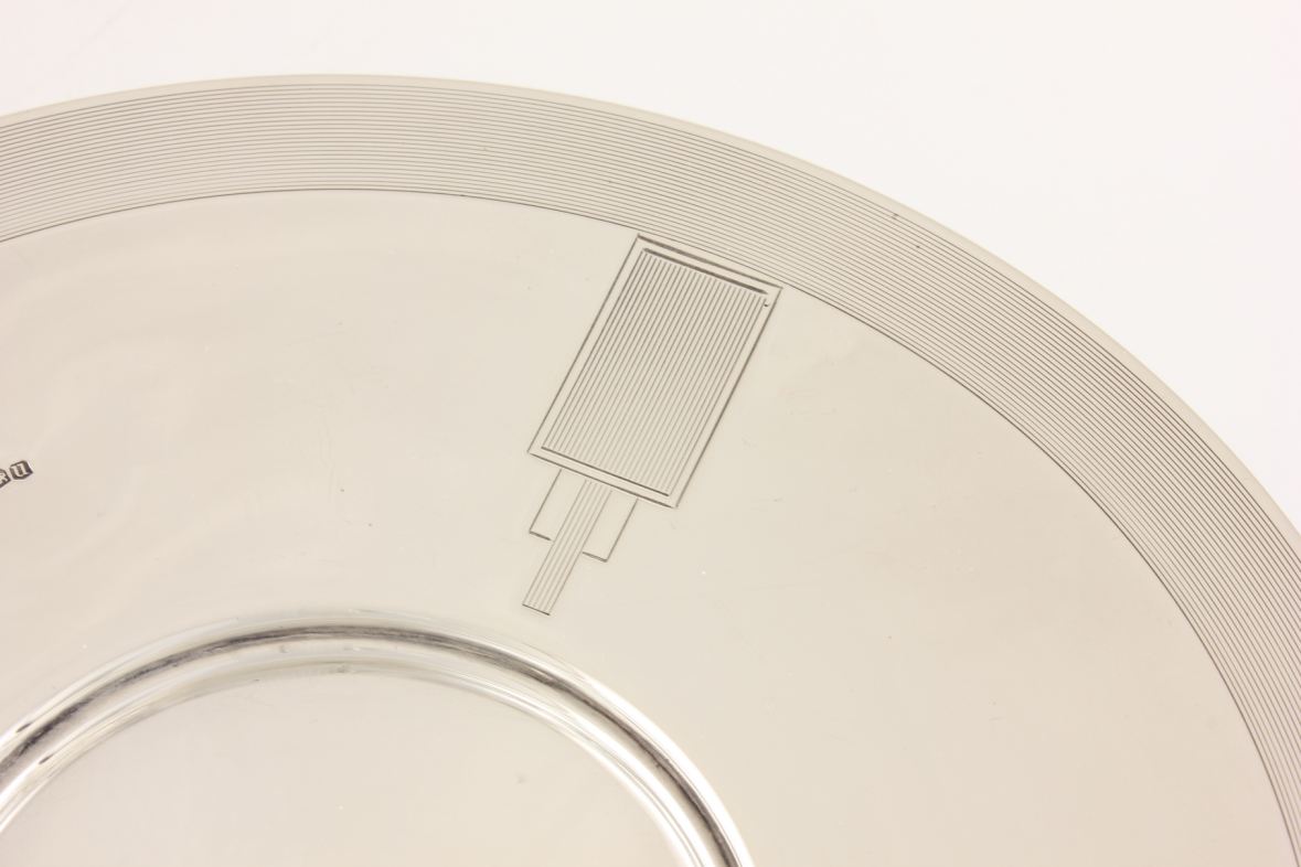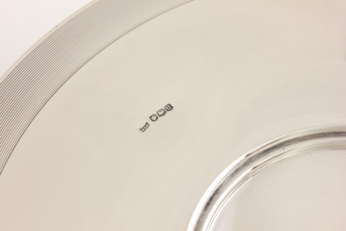 This handsome dish has a fabulous look and sits on it's raised central pedestal foot which has engine turning decoration and is also marked to the underside for Walker & Hall, Sheffield.