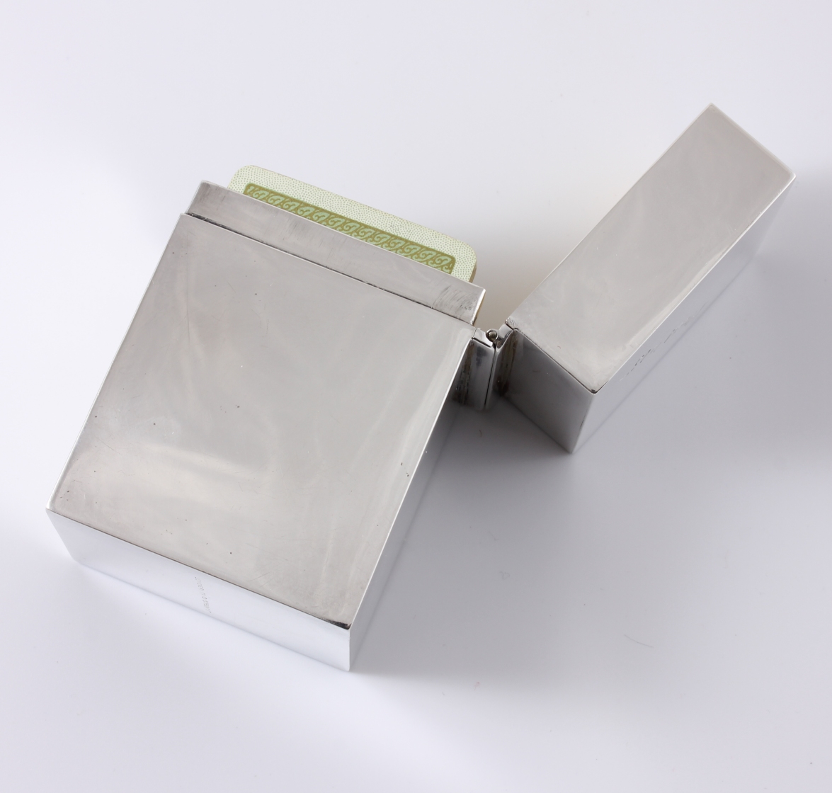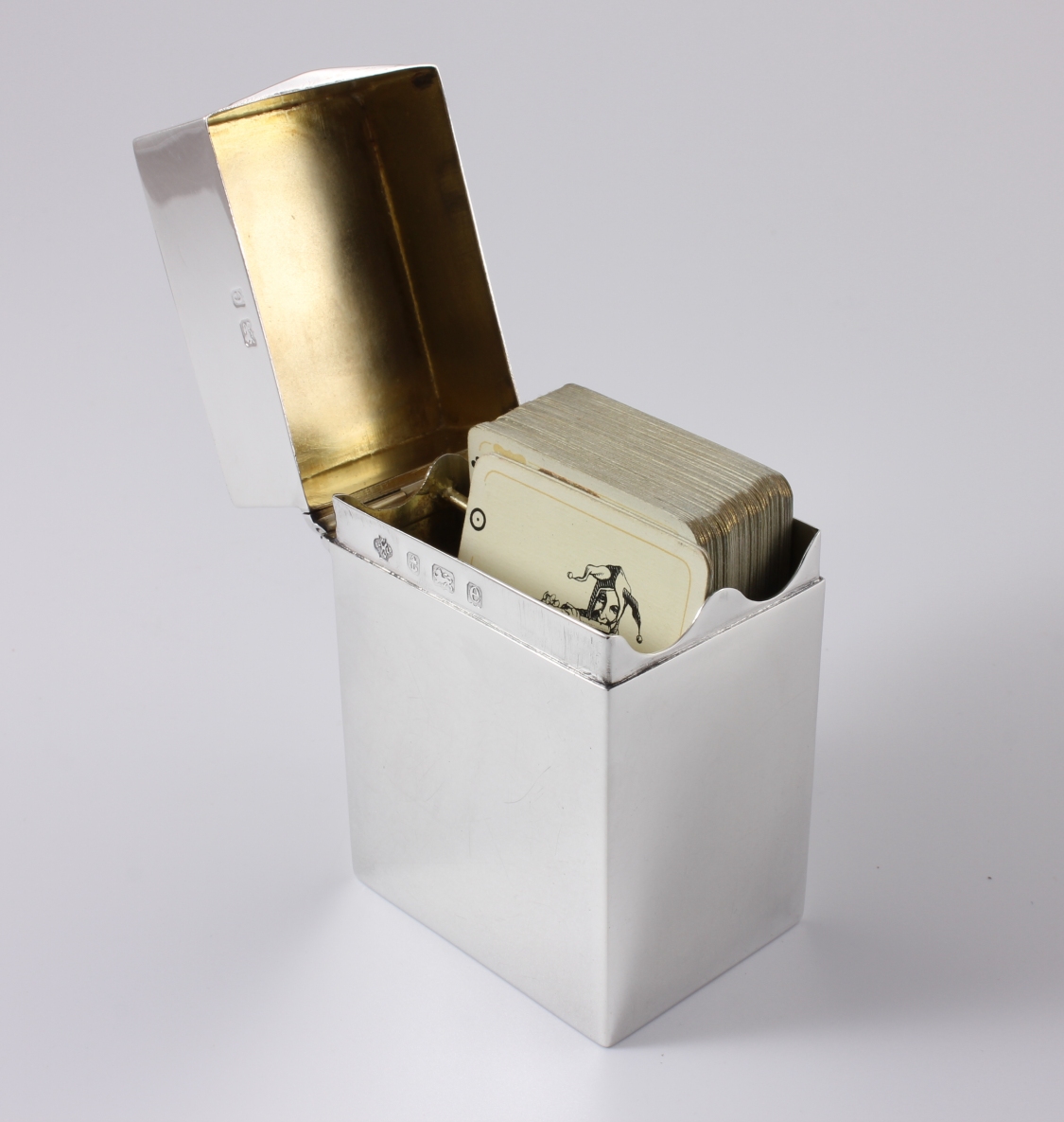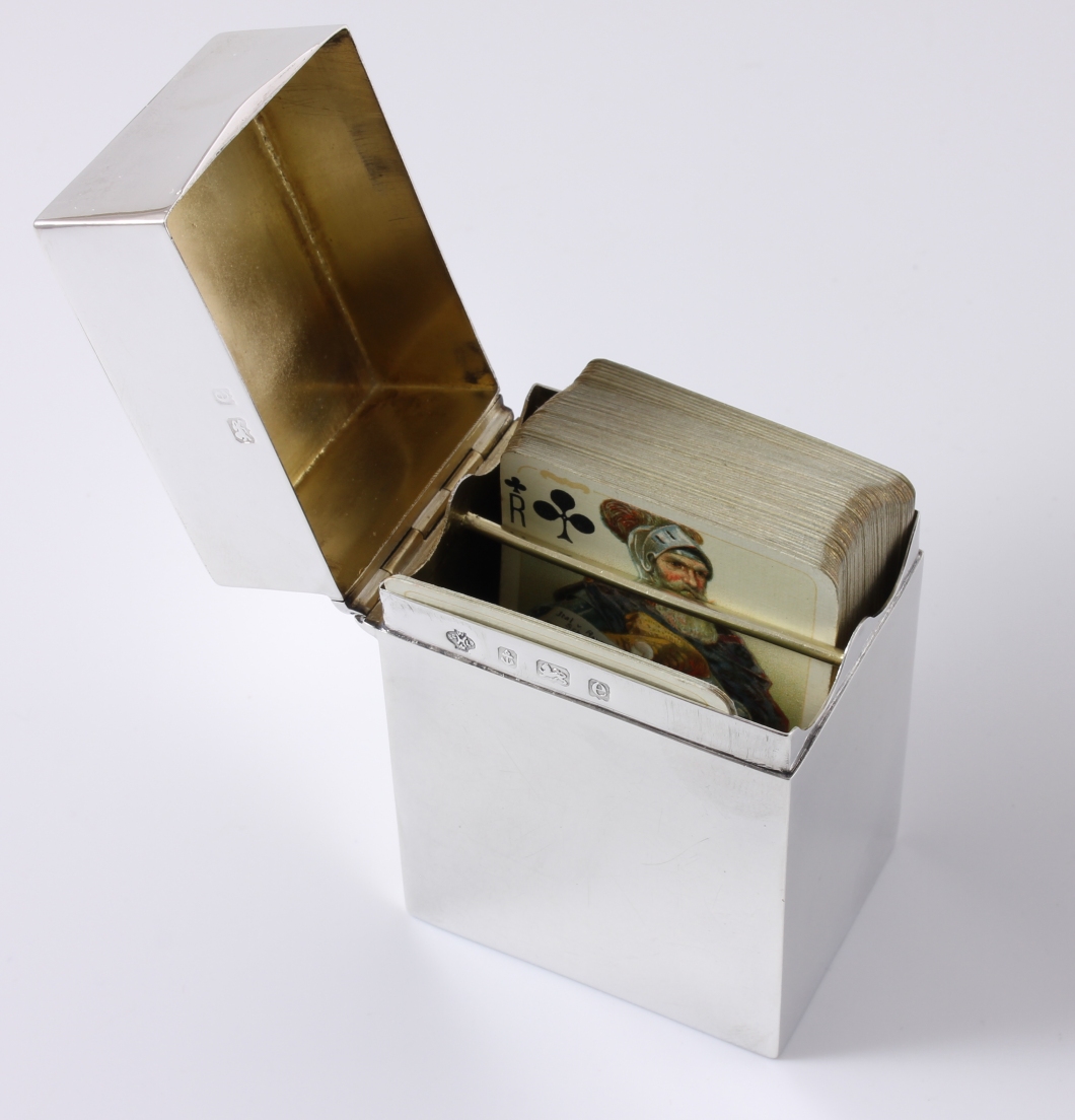 This fine miniature playing card box which is in wonderful condition is made of silver, is by William Hutton & Sons Ltd and is fully hallmarked for 1904.