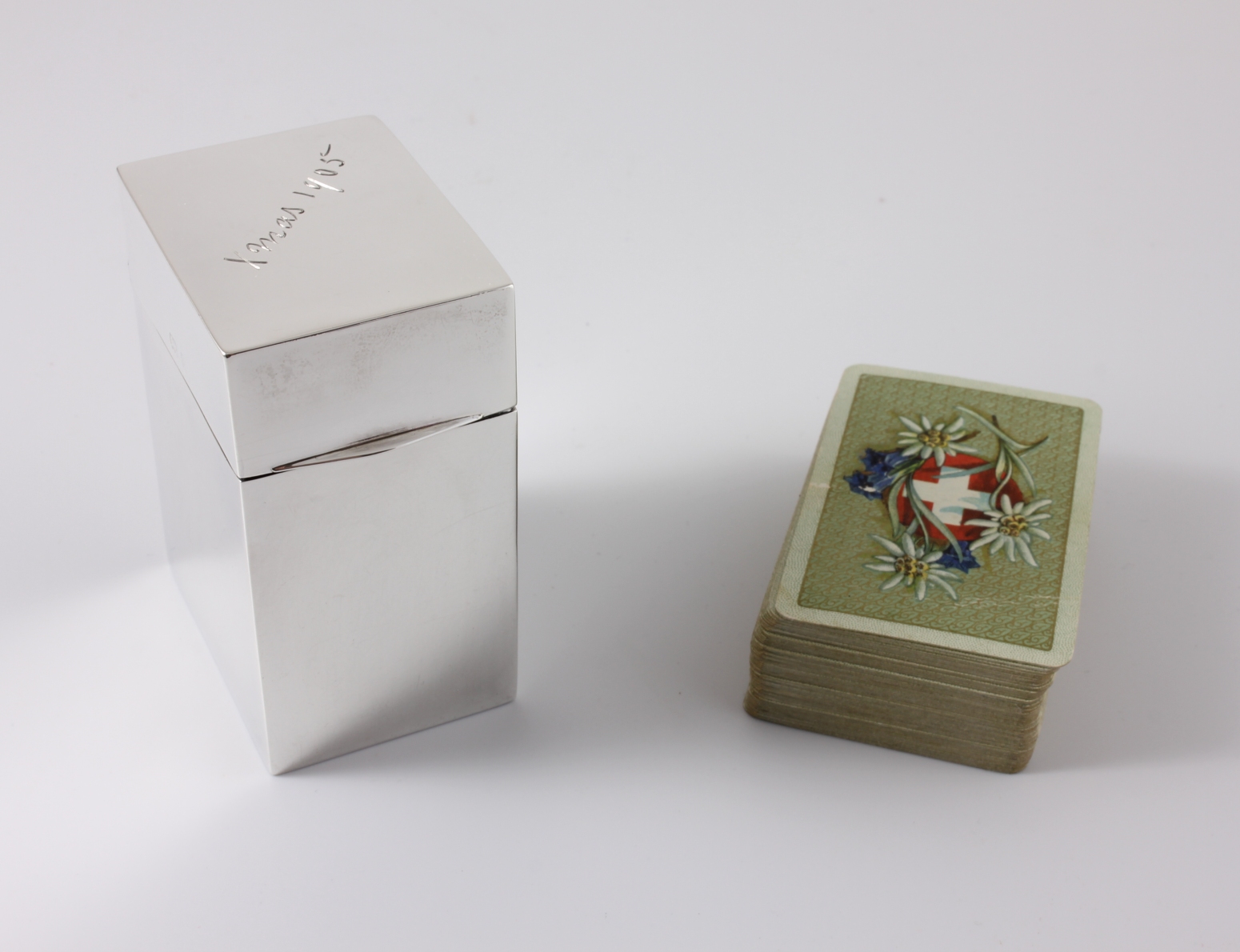The handsome case is designed to hold 2 packs of miniature playing cards and this one comes with one full pack of Swiss cards. The lid has been lovingly inscribed with the inscription Xmas 1905 and the underside is marked with the retailer's details which are JC Vickery. 179 181 183 Regent St.