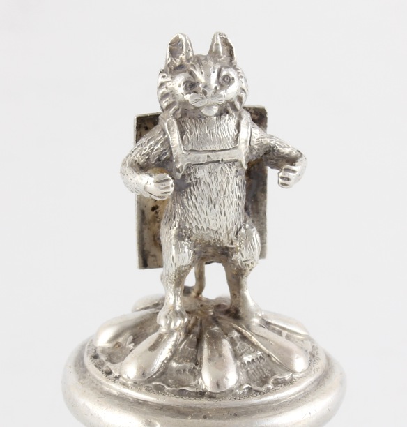 This novelty Victorian stopper of a cat figure proudly wearing an advertising sandwich board is a charming piece and the reverse board is blank so could be engraved if you so wished.