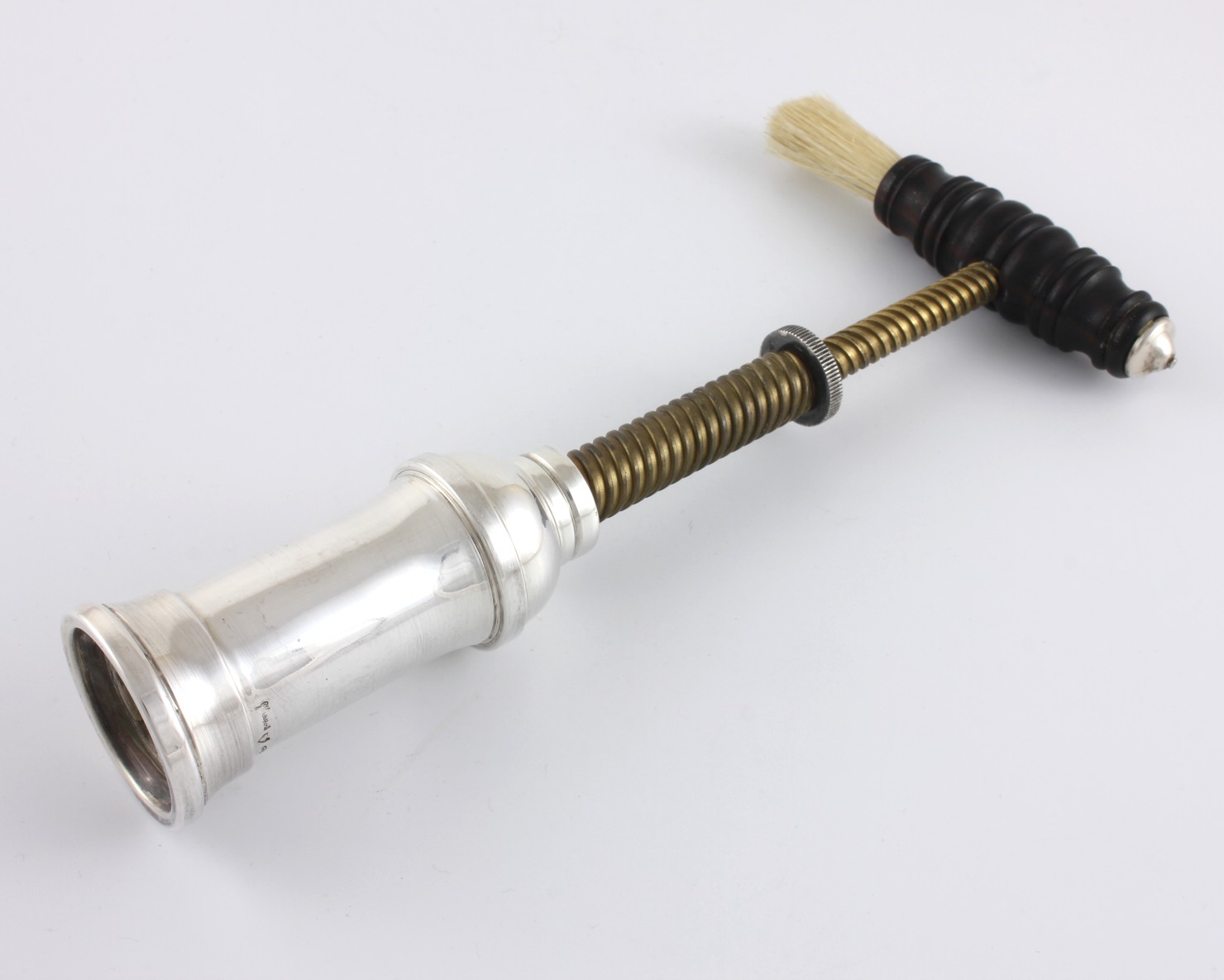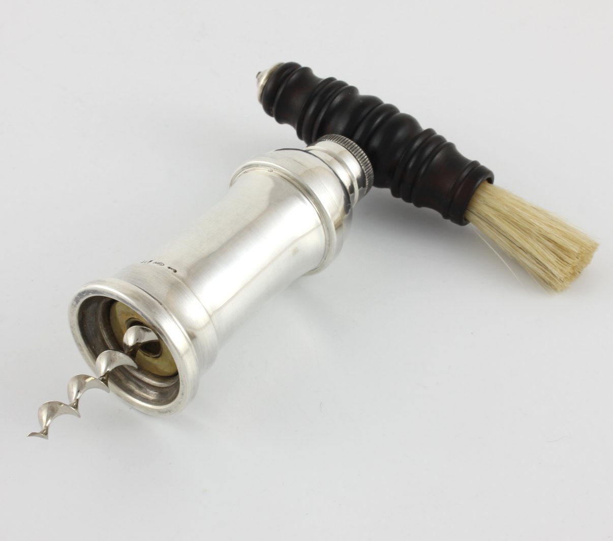 This mechanical corkscrew has a nice plain design to the body which is made of Italian silver. The screw mechanism which works well is made of steel and the ebony handle has a bristle brush.