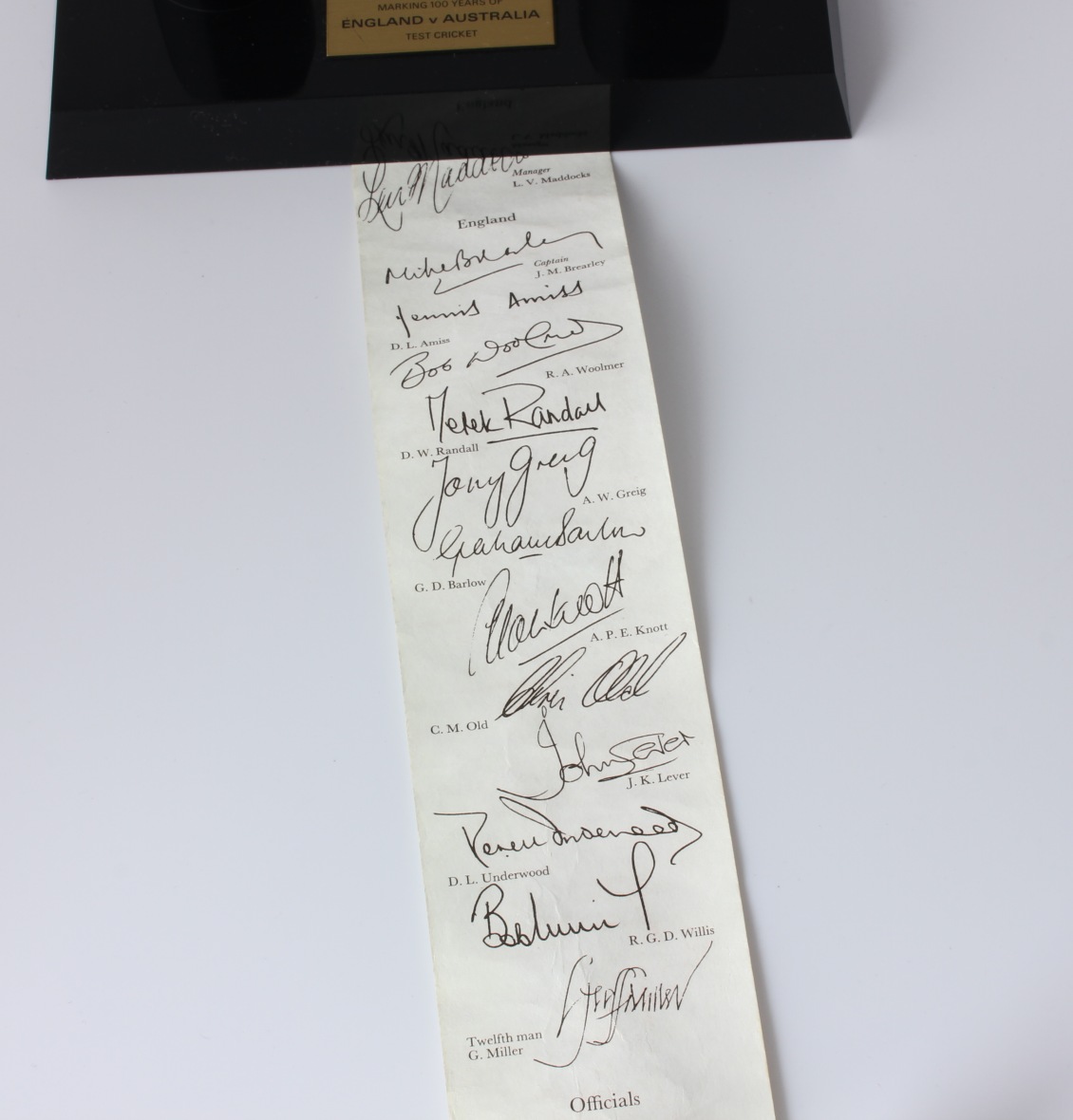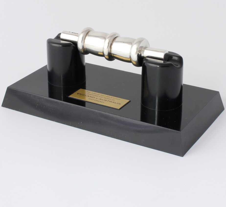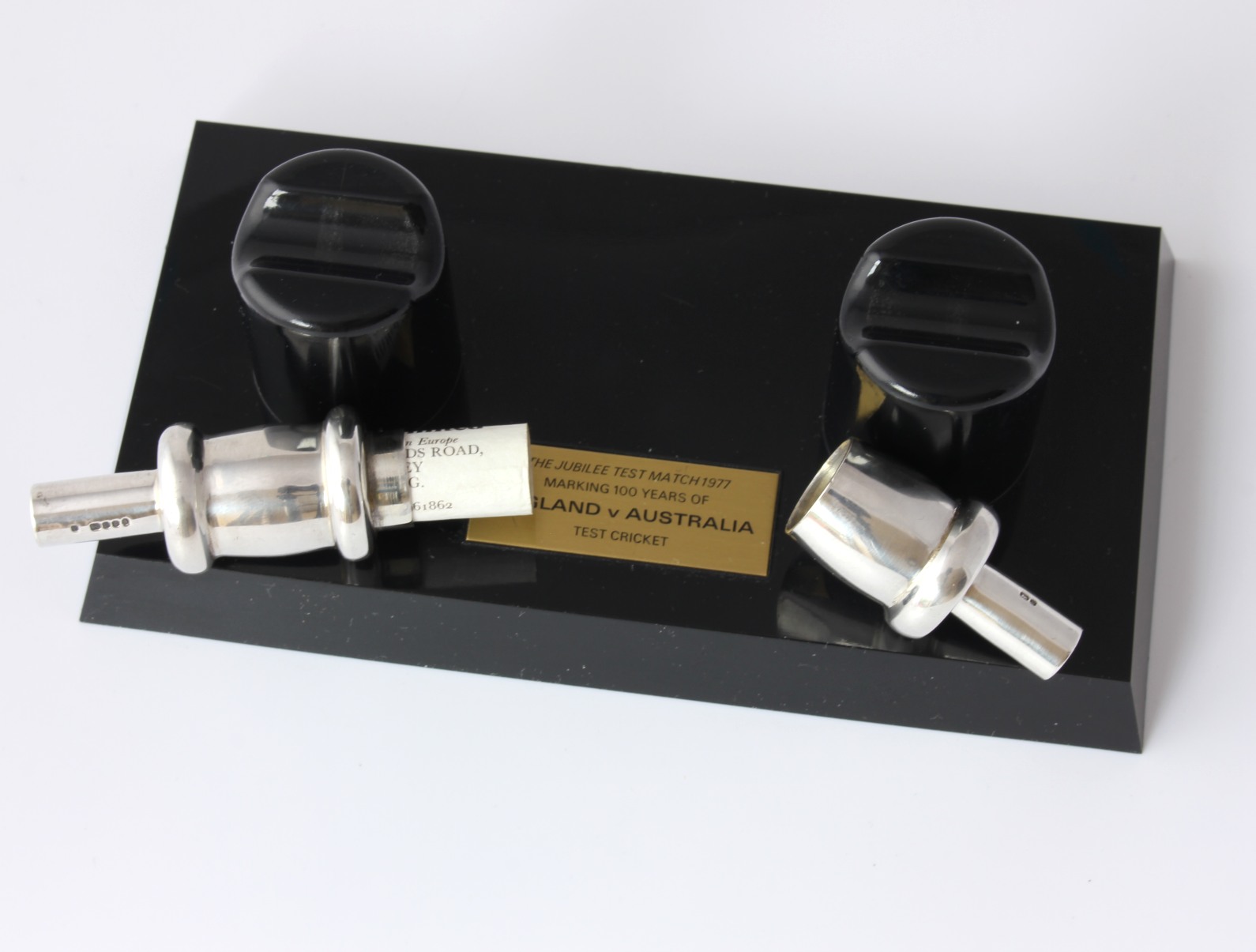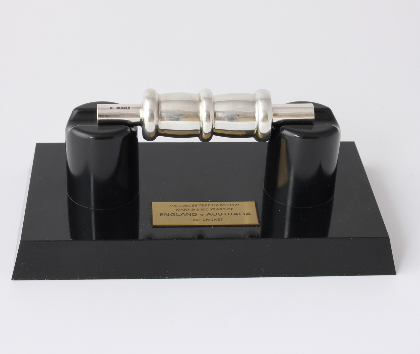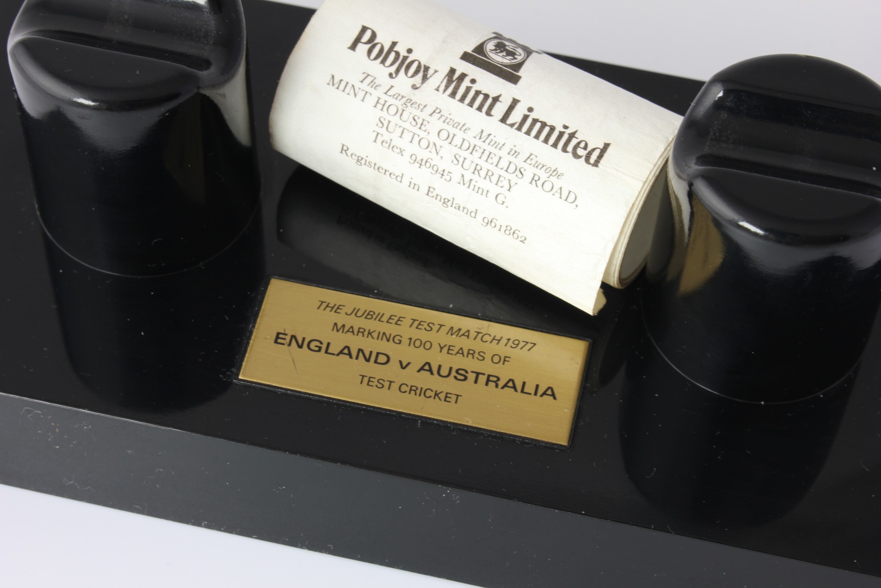 This one comes with the black plastic presentation plinth which features an engraved plaque that reads - The Jubilee Test Match 1977. Marking 100 years of England V Australia Test Cricket.