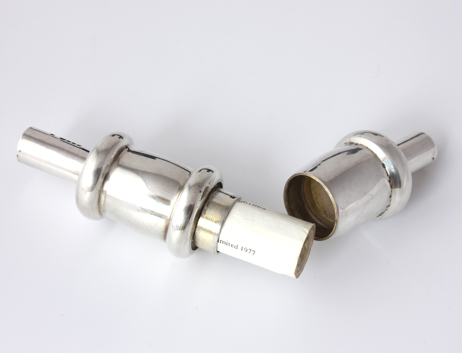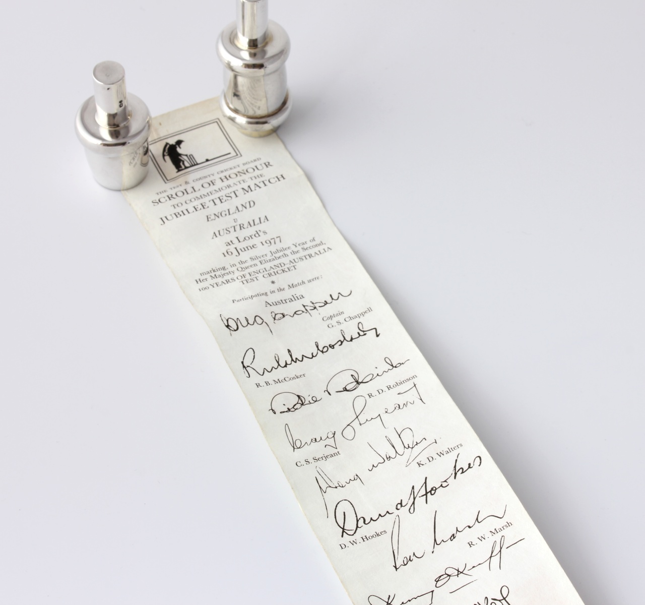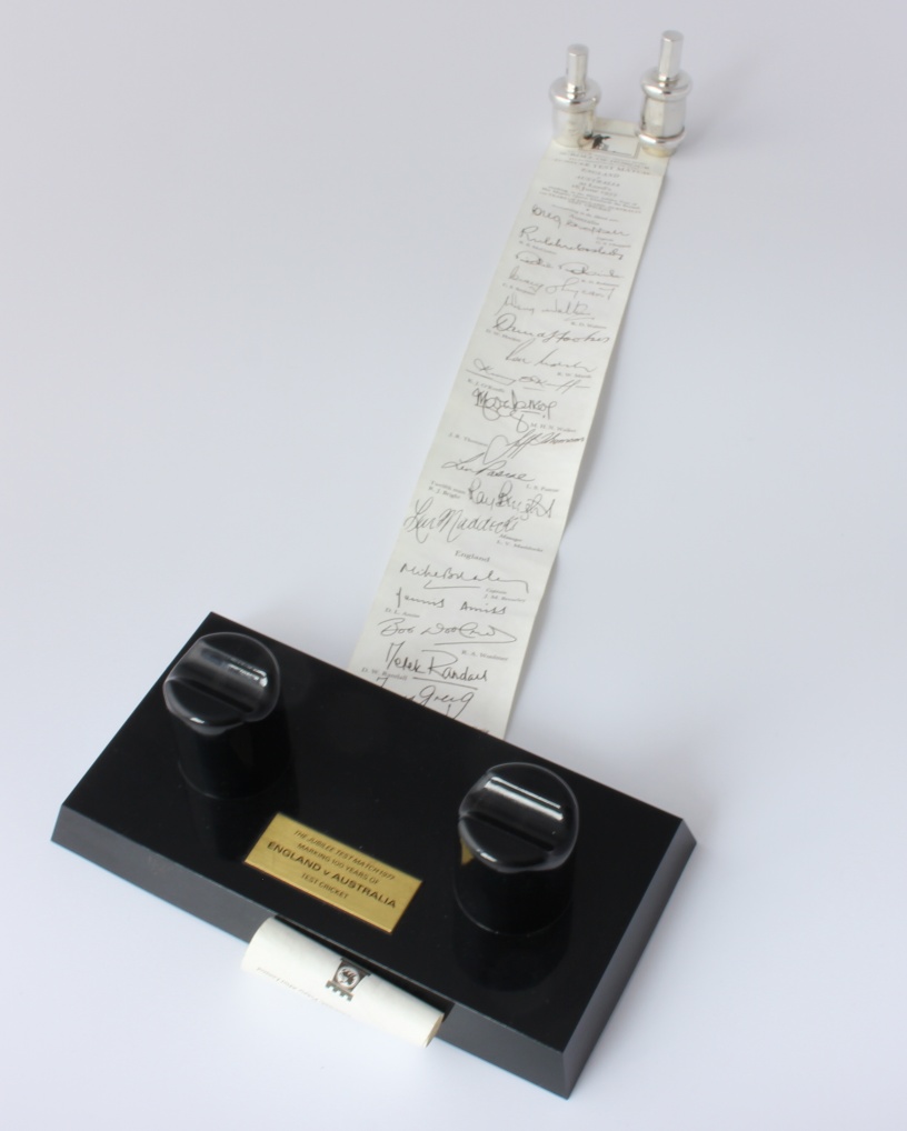 The silver model of a cricket bail unscrews to reveal a paper scroll recording the player's names with facsimile signatures and scores of the Centenary Test Match at Lord's.