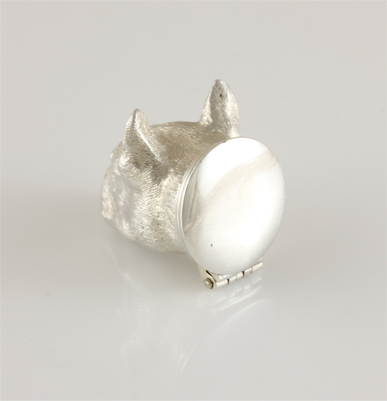 This beautiful box which has a hinged lid is realistically modelled as a French Bulldog's head with wonderful detail, the inside is gilded, feels heavy in the hand and is in excellent condition.