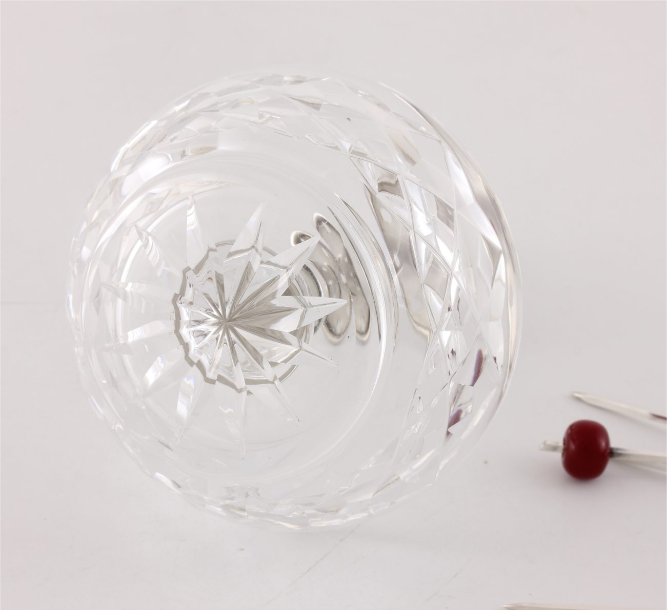 This stylish Art Deco cocktail accessory which dates from the first half of the 20th century comprises of a sterlng silver & cut glass cocktail pick holder bowl with a cherry finial and is by Roberts Dore Ltd of Hatton Garden, London.