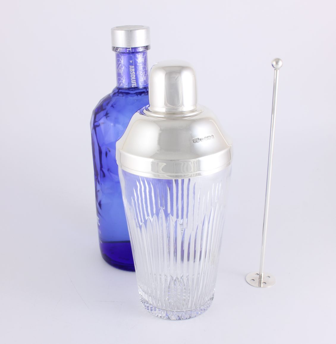 This handsome solid silver and cut glass cocktail shaker which is in the Art Deco style comes complete with a matching solid silver muddler to crush your fruit and stir your cocktail.
