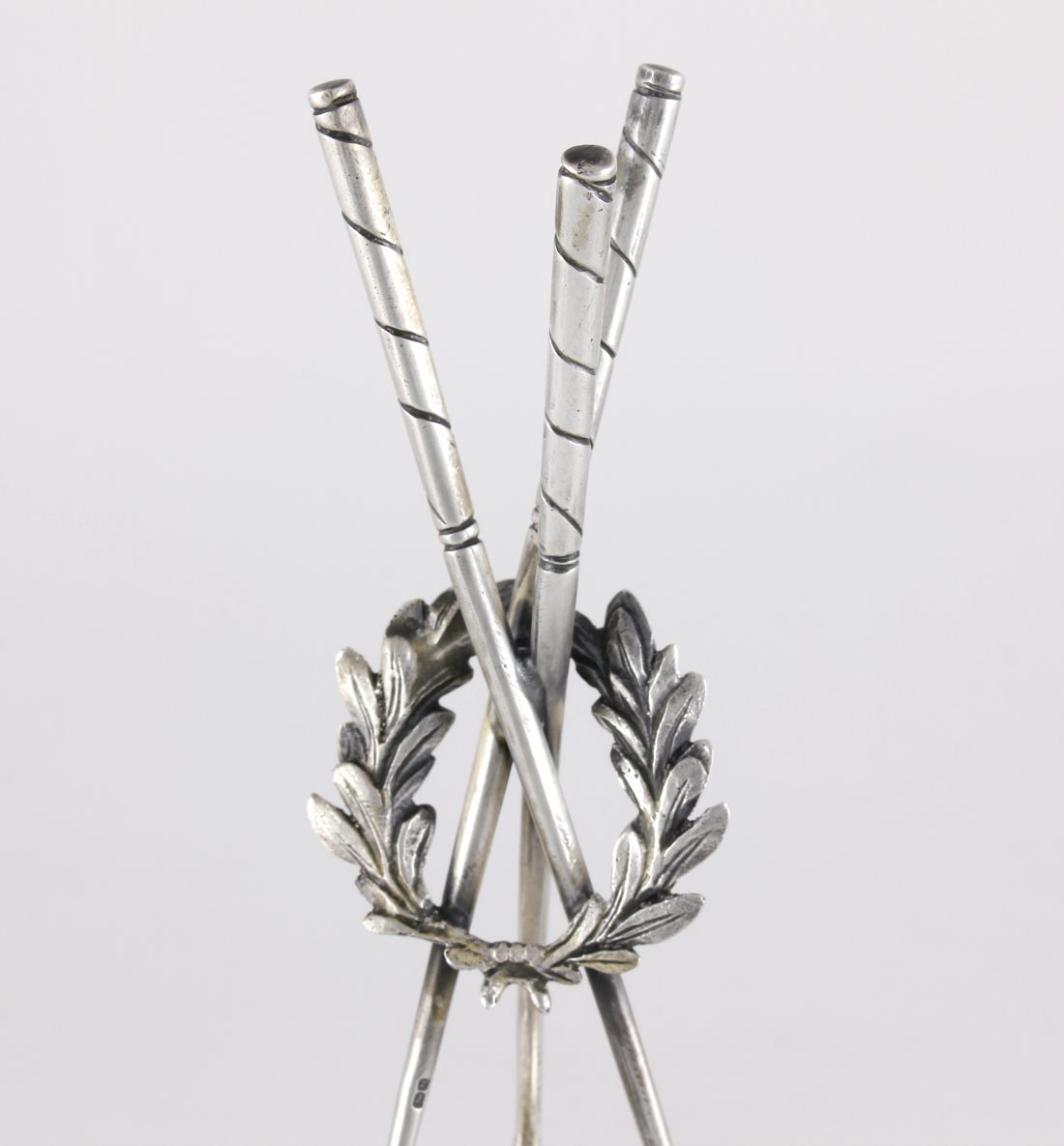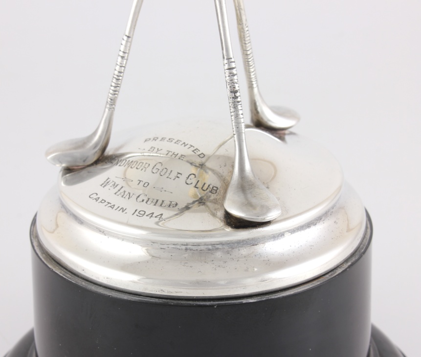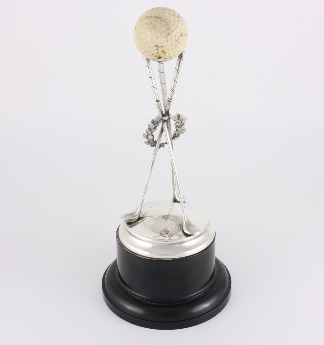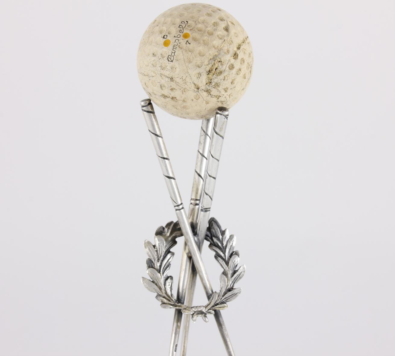 This vintage golf trophy which features three crossed solid silver golf clubs with a laurel wreath entwined has a golf ball holder at the top and rests on a silver base section.