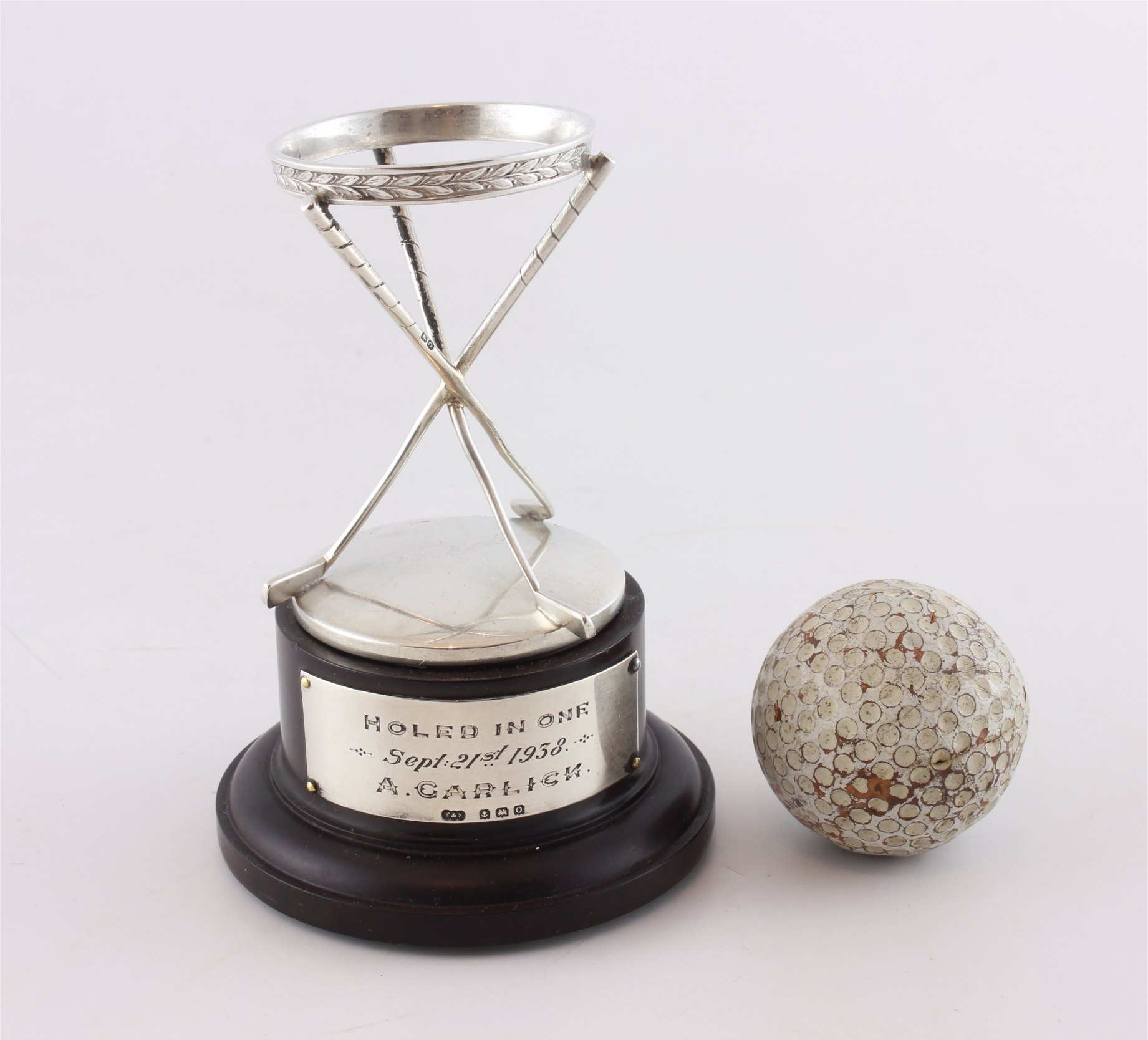 This antique Hole In One trophy which is made of solid silver is fully hallmarked for 1938 and features three crossed golf clubs with a ringed top that holds a Silver King Plus 3 golf ball.