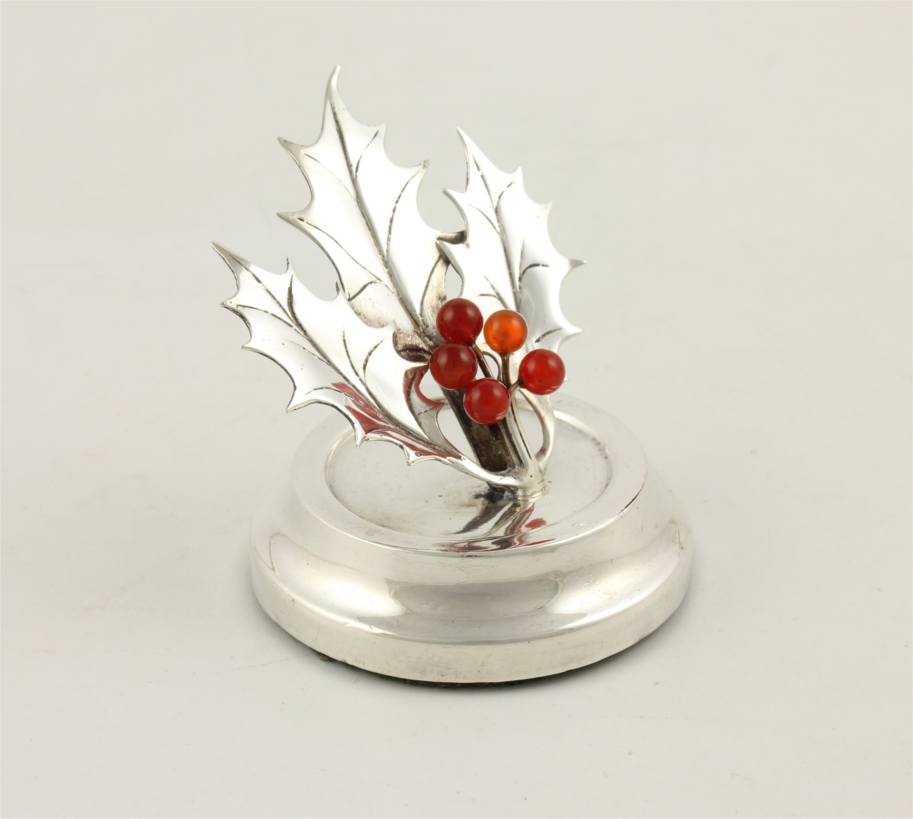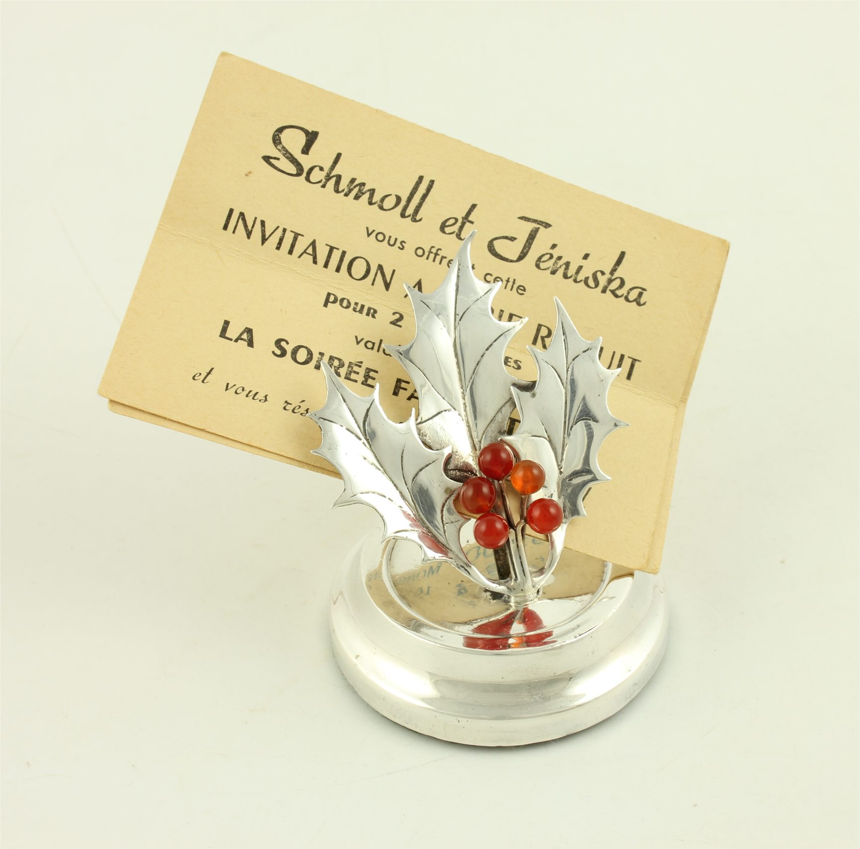 This stylish antique menu holder which is designed as a sprig of holly has good detail including holly berries and sits on it's hallmarked silver base.