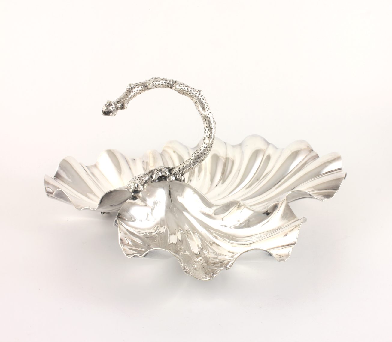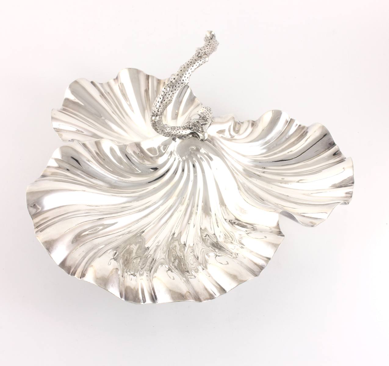 This dish has a triple scallop shell design, a carrying handle which is in the form of a piece of coral with a starfish and sits on three small shell feet.
