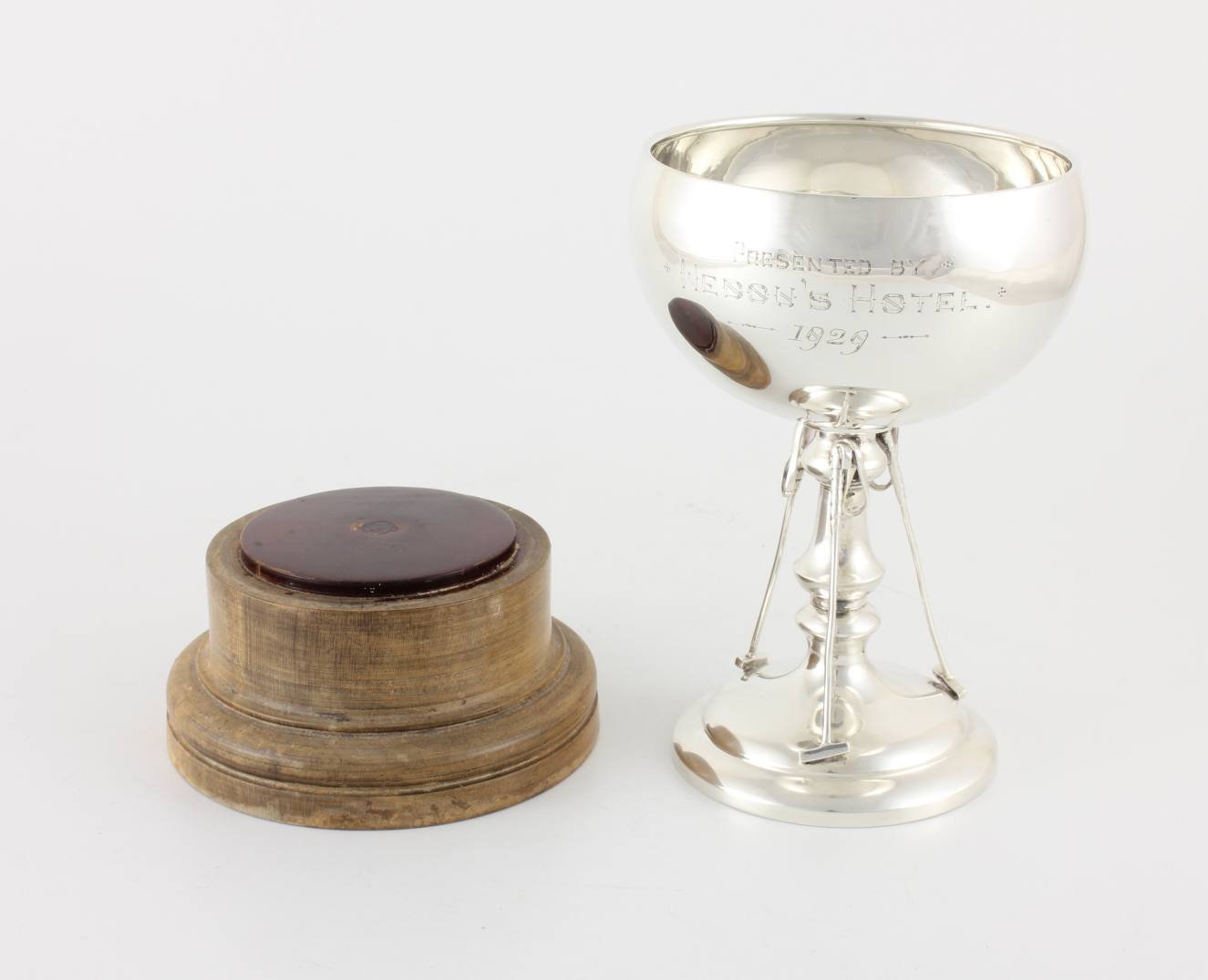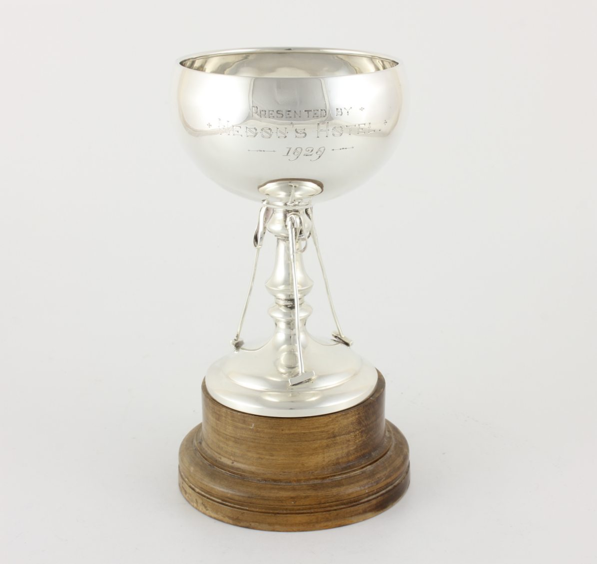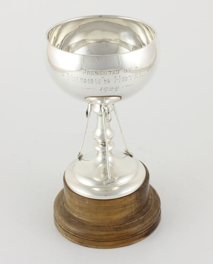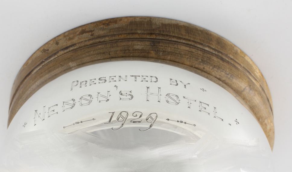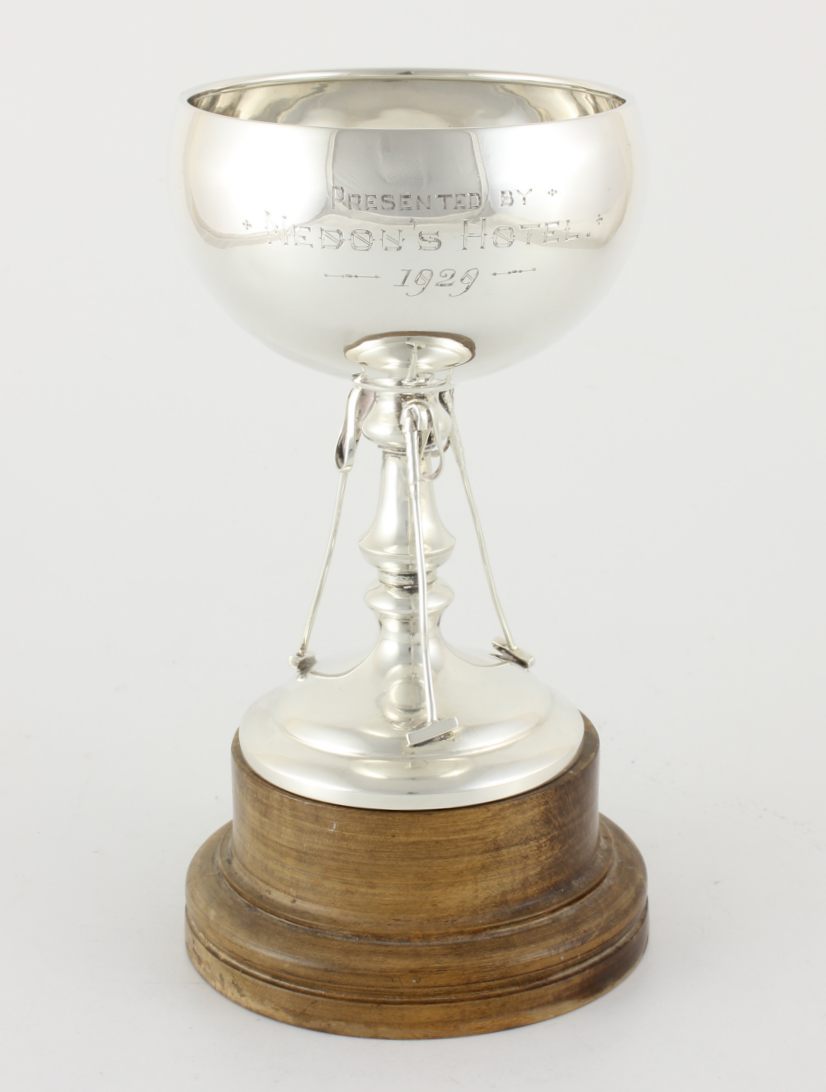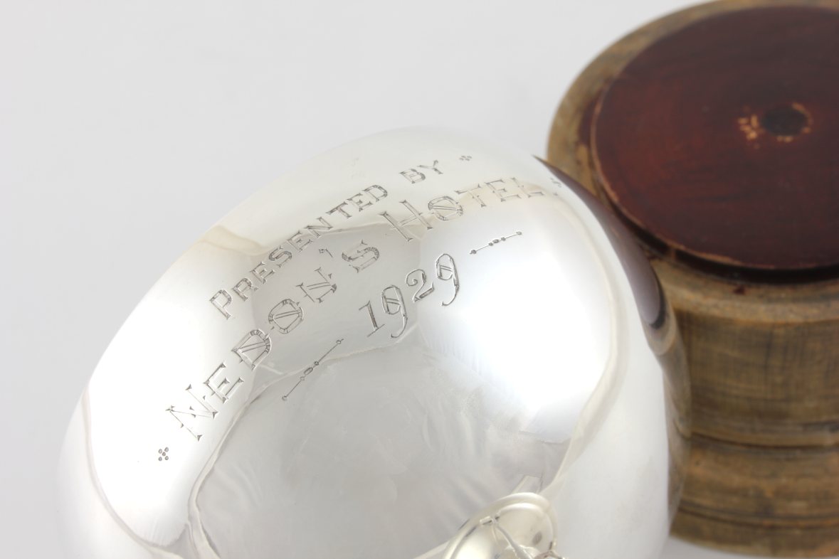 This handsome cup has an interesting inscription that reads Presented by Nedou's Hotel 1929 and would have been a polo trophy awarded for a polo tournament by the hotel in 1929.