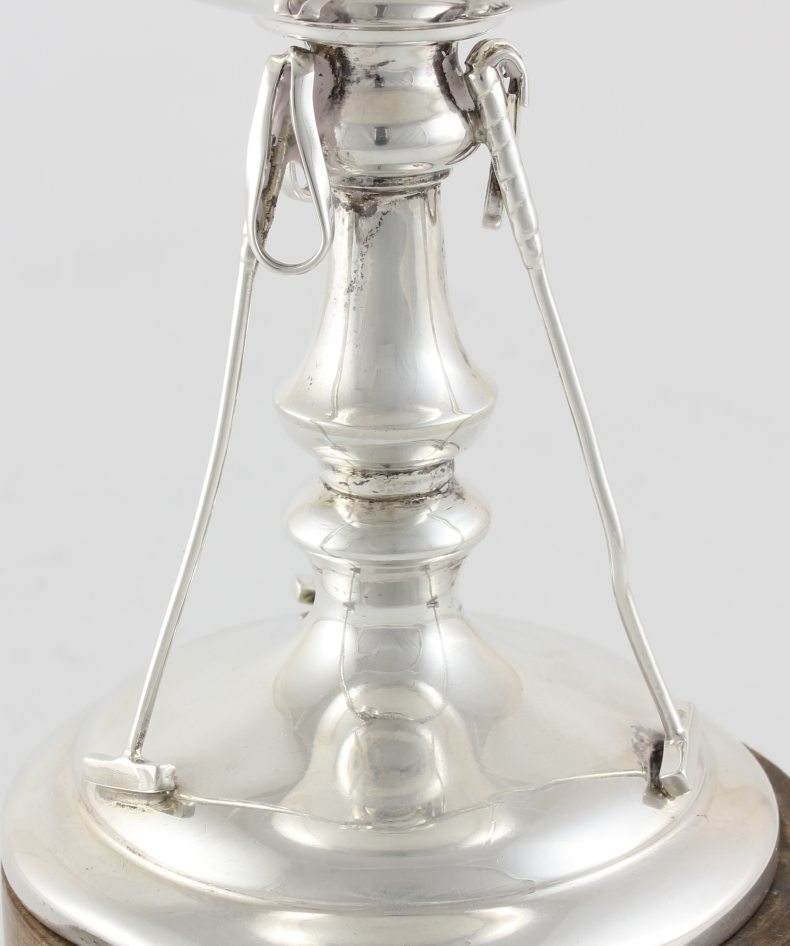 This interesting Sterling Silver Polo trophy cup which has three Polo clubs surrounding the central stem is made by silversmith William Devenport and is fully hallmarked for 1928.