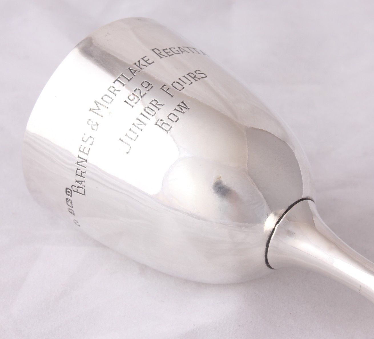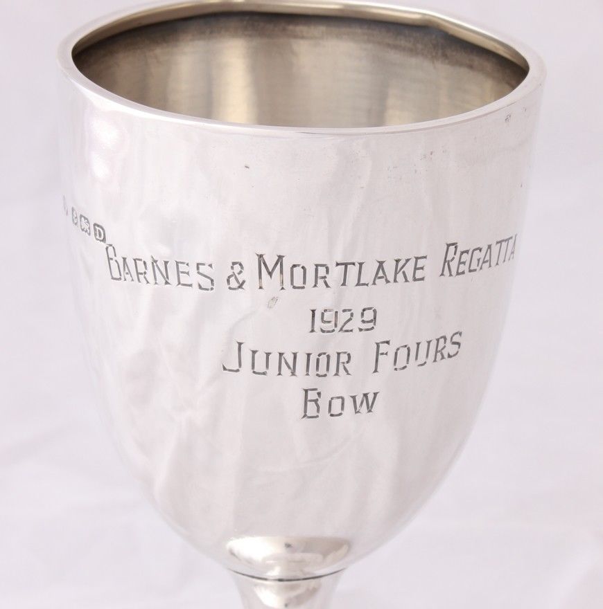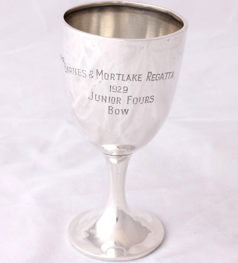 This lovely Sterling Silver rowing trophy cup is hallmarked for Birmingham 1928 and has an interesting inscription that reads "Barnes & Mortlake Regatta. 1929. Junior Fours. Bow".