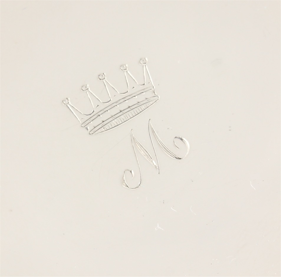 This matching set of four solid silver pin dishes which are by Adie Brothers Ltd have a Royal Crown M Monogram to each of the centres and are fully hallmarked to the undersides for 1954.