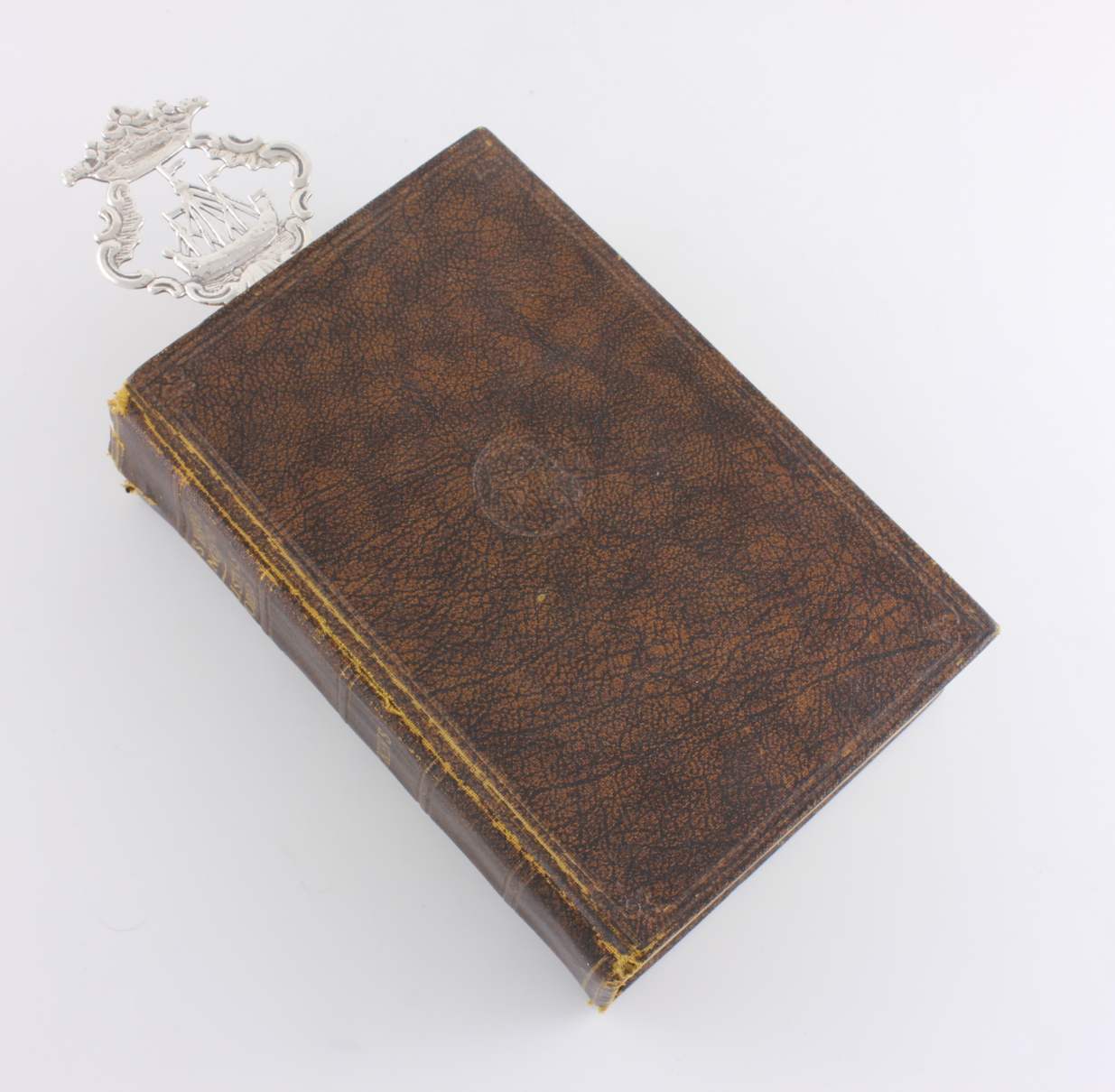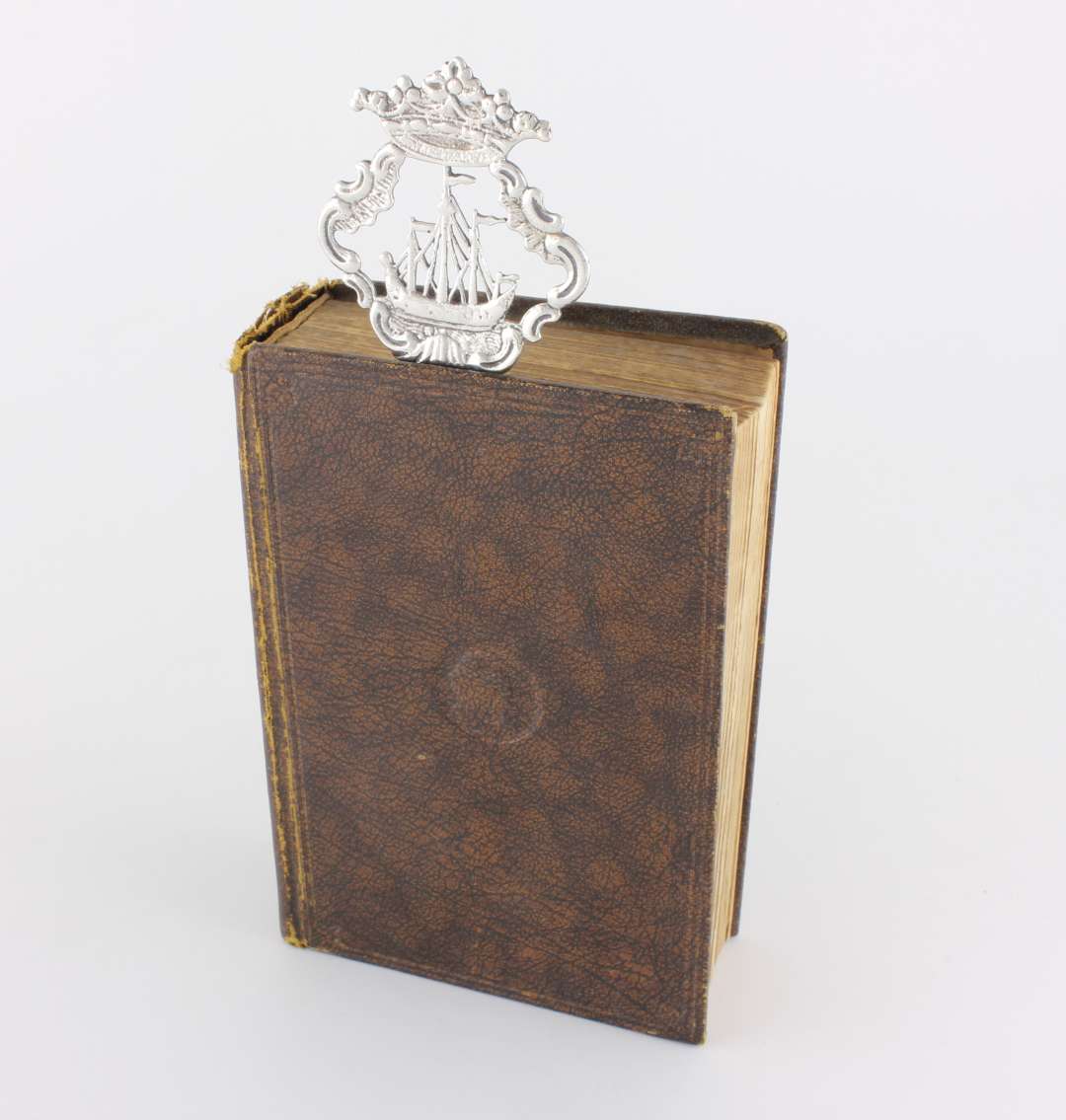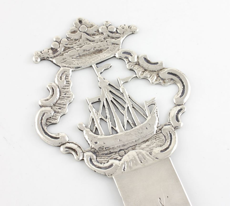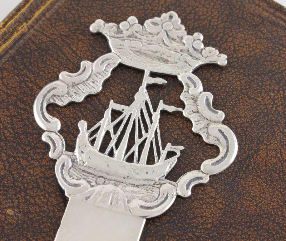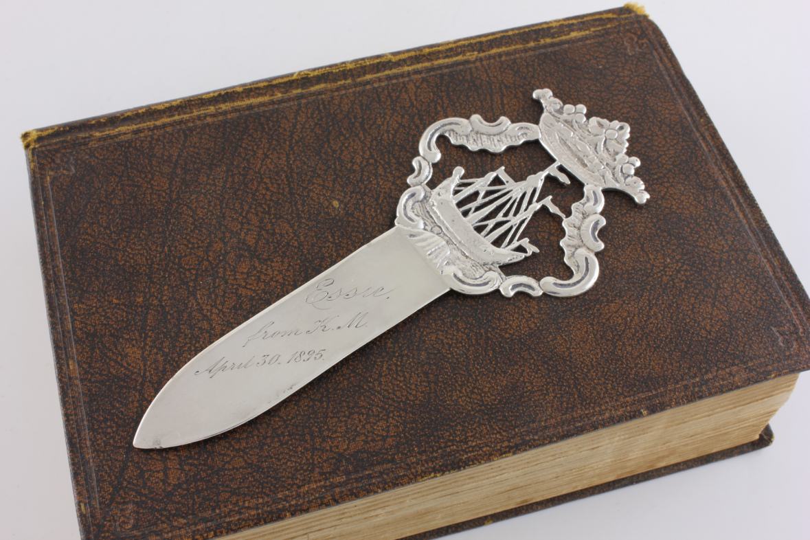 This nice quality page marker has a coronet and ship design to the top half and bears a charming inscription to the lower half that reads: Essie. From KM. April 30 1895. This antique bookmark is also marked with the retailer's name of J. Dudley, Southsea to the back.