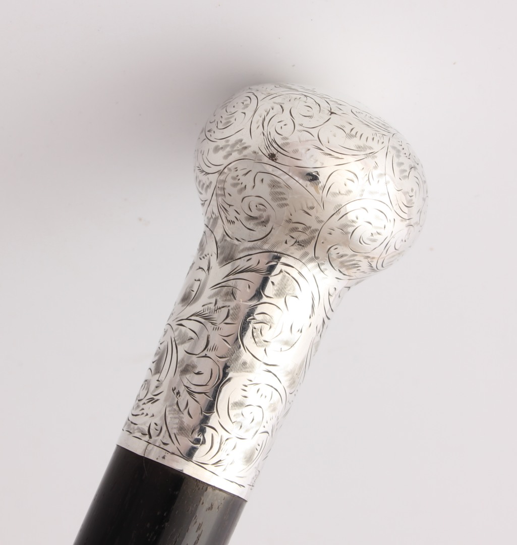 This fine antique walking cane which dates from 1921 has an ornately decorated silver top with a beautiful ebony shaft and is a nice heavy weight.