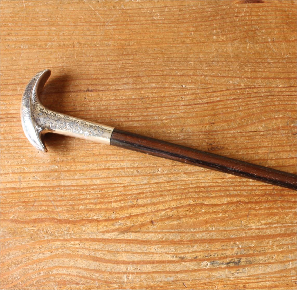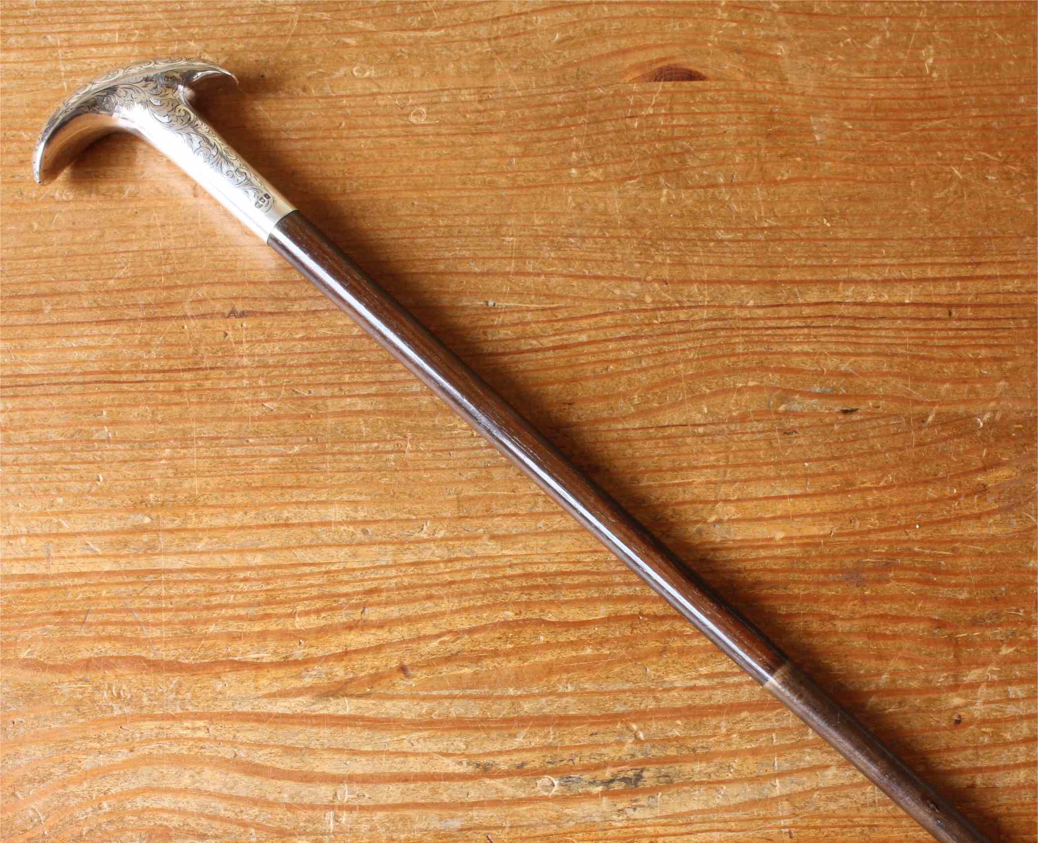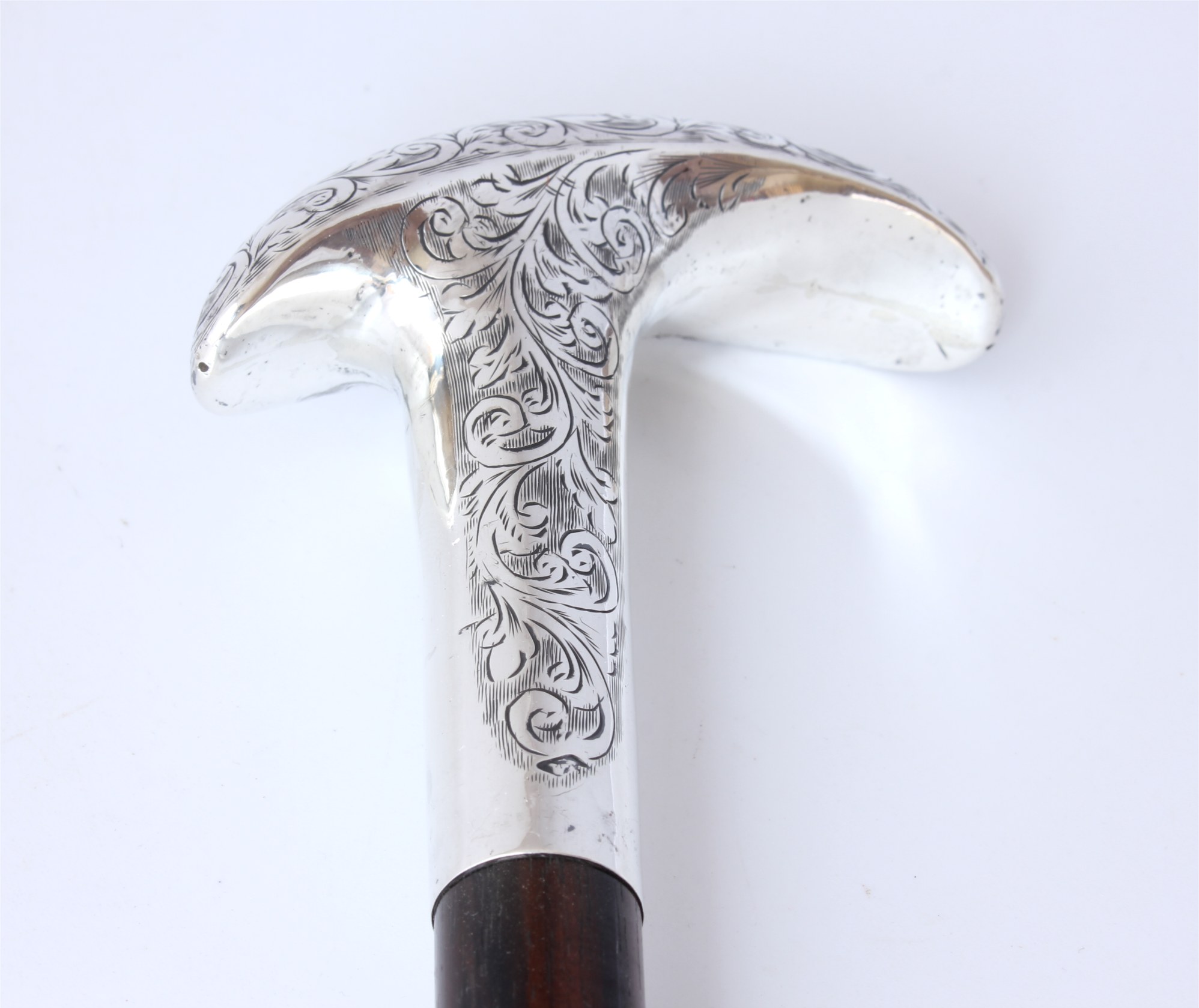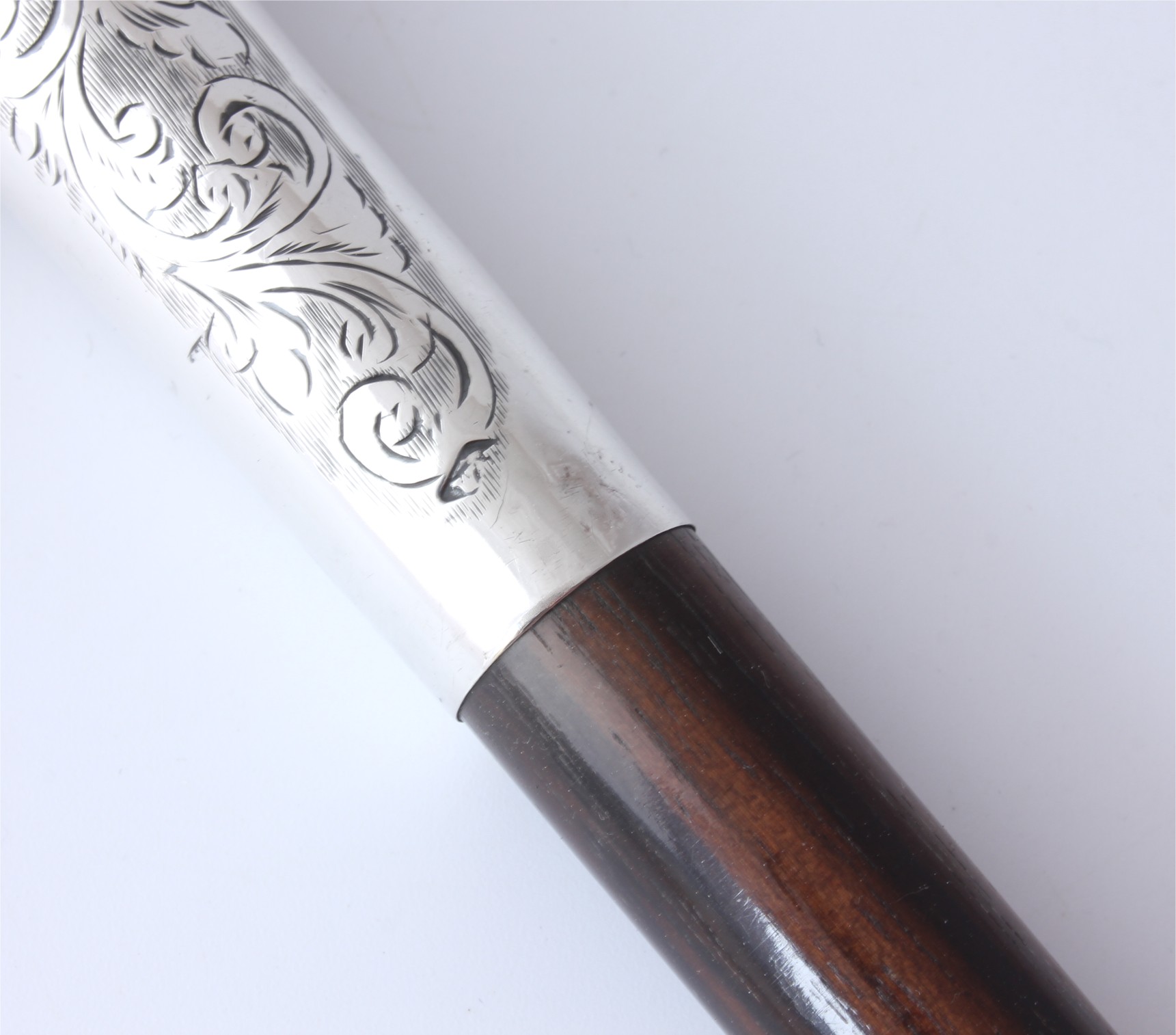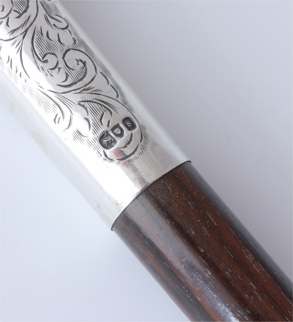 This fine quality antique stick which has a wooden shaft has a brass ferrule and a beautifully engraved decorative silver handle.