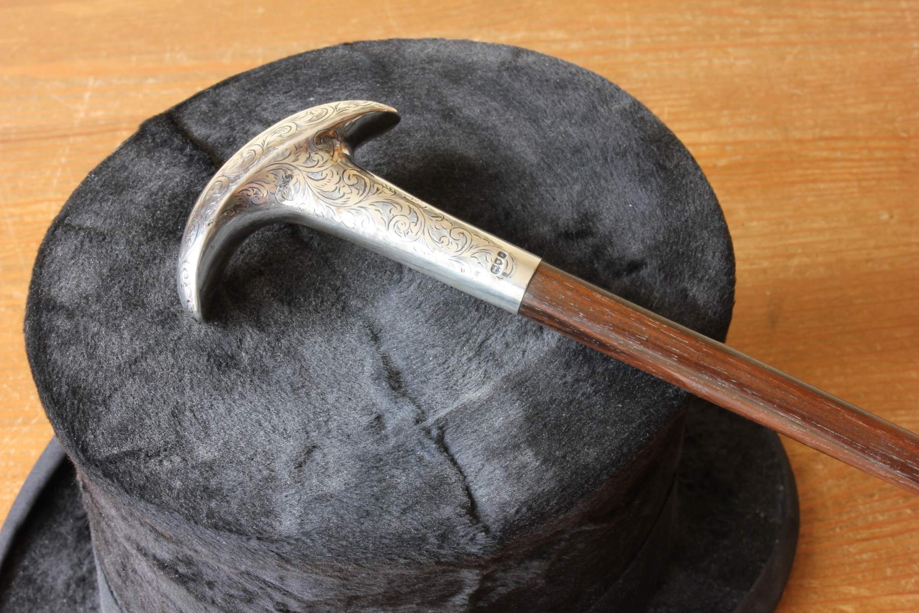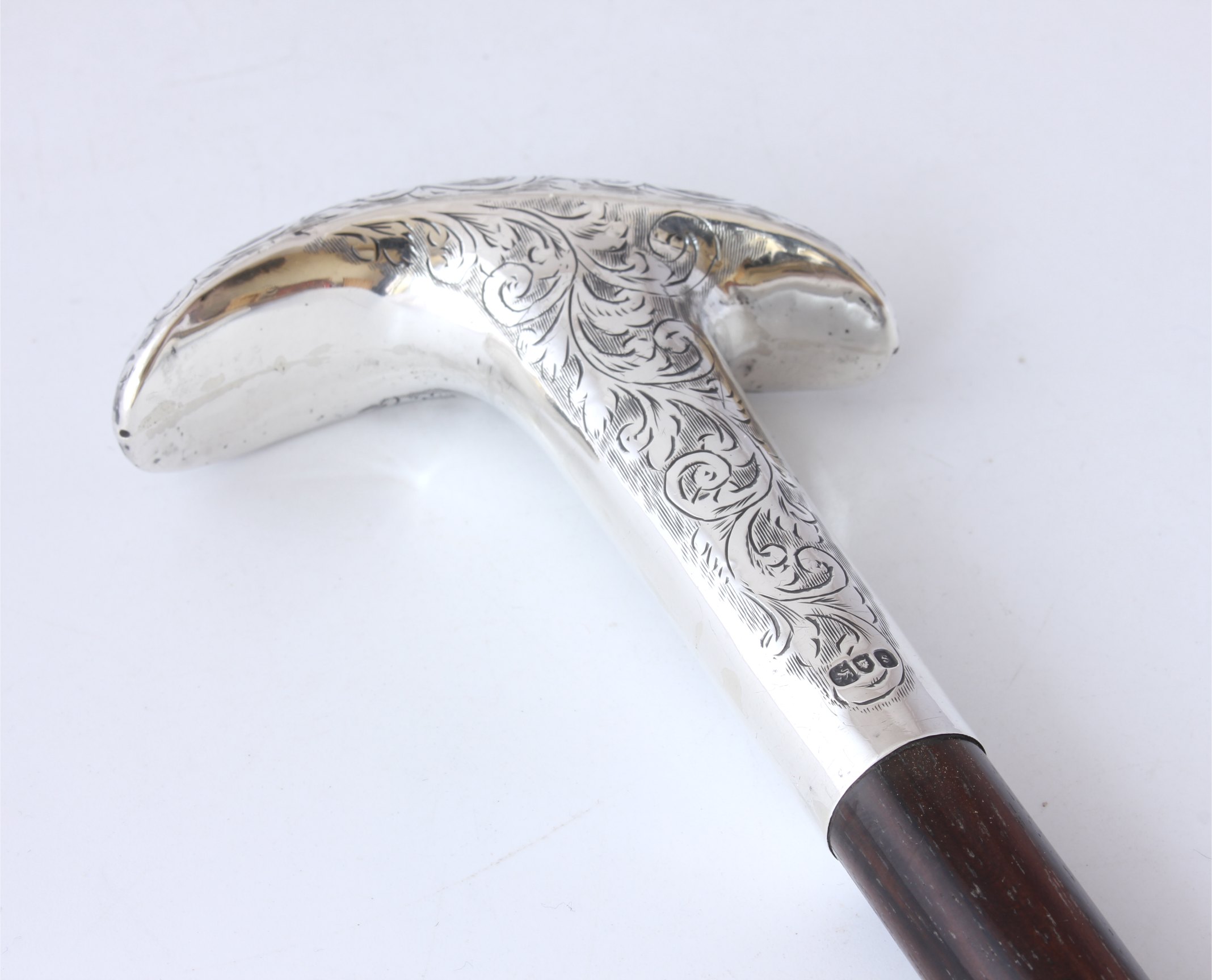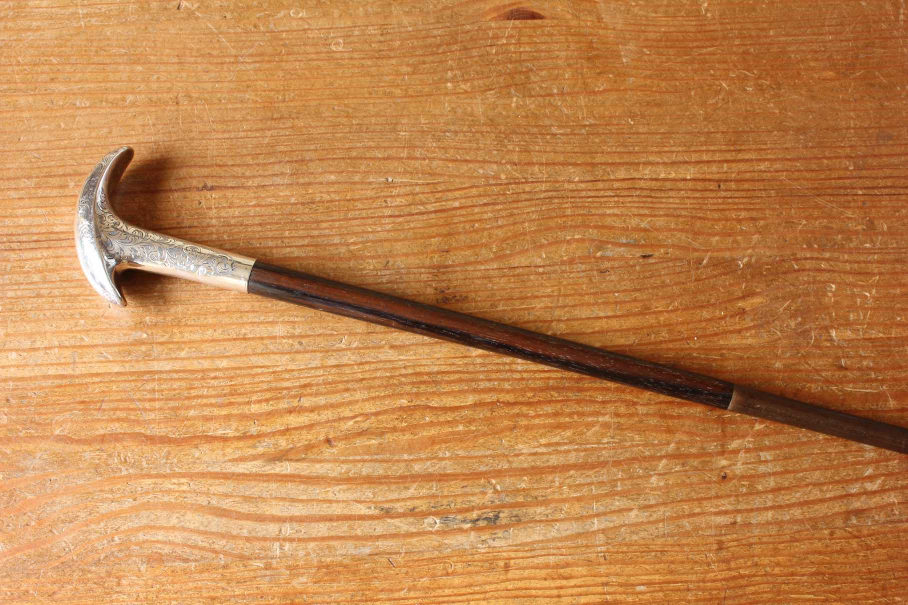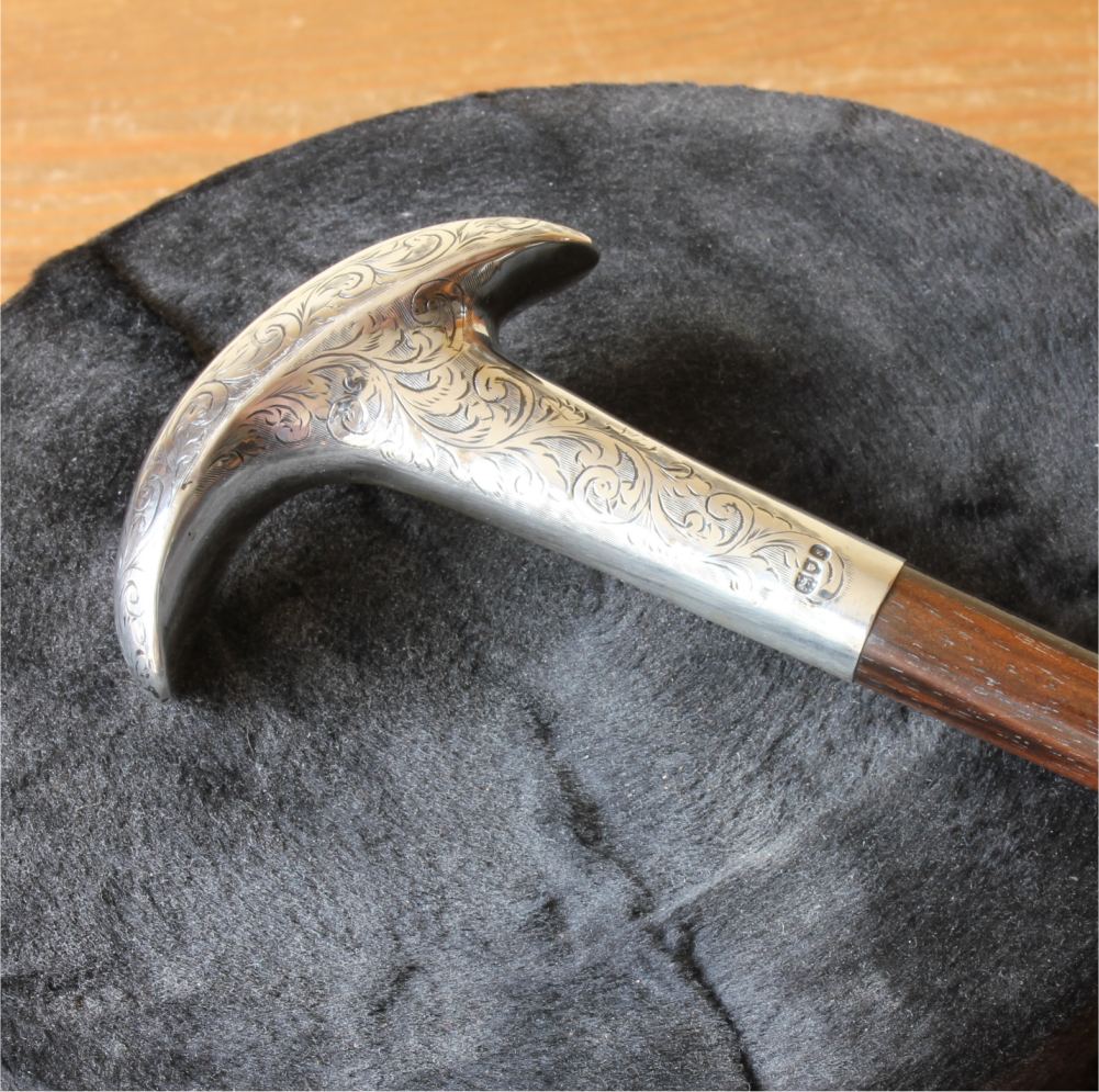 This fine quality antique stick which has a wooden shaft has a brass ferrule and a beautifully engraved decorative silver handle.