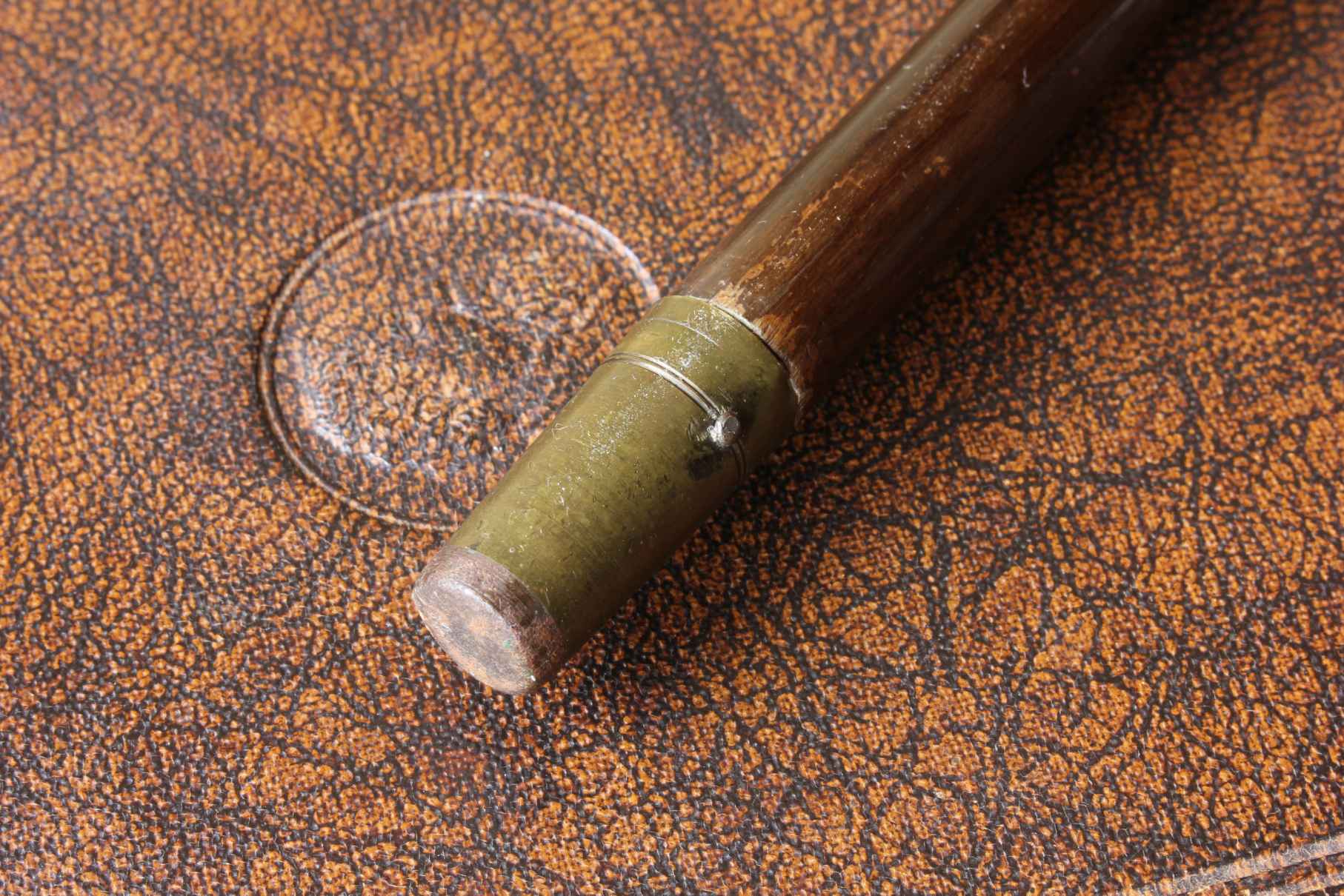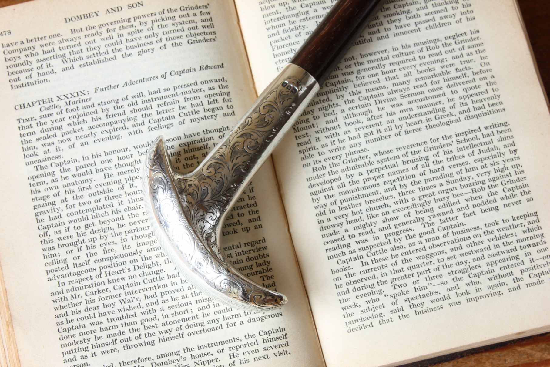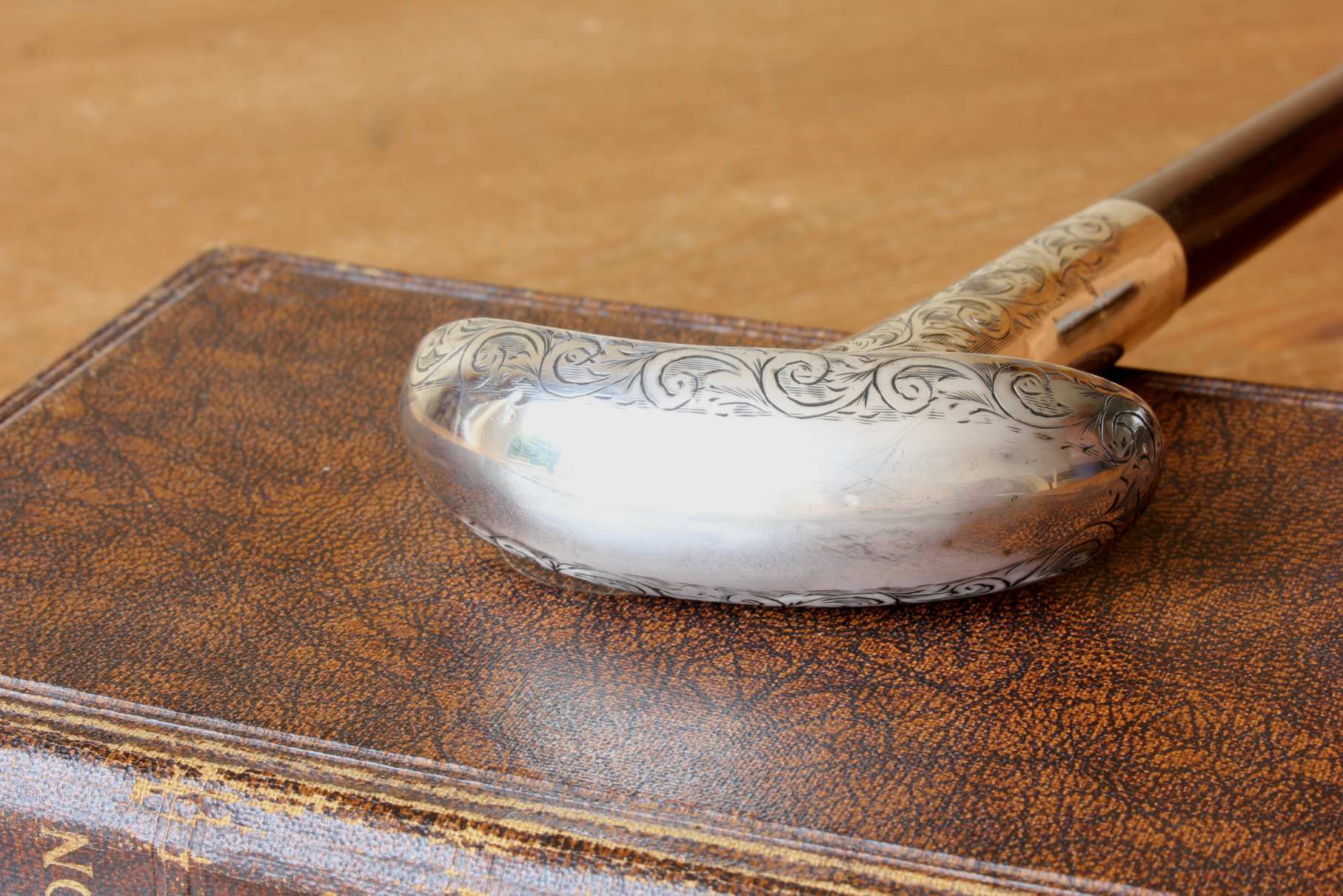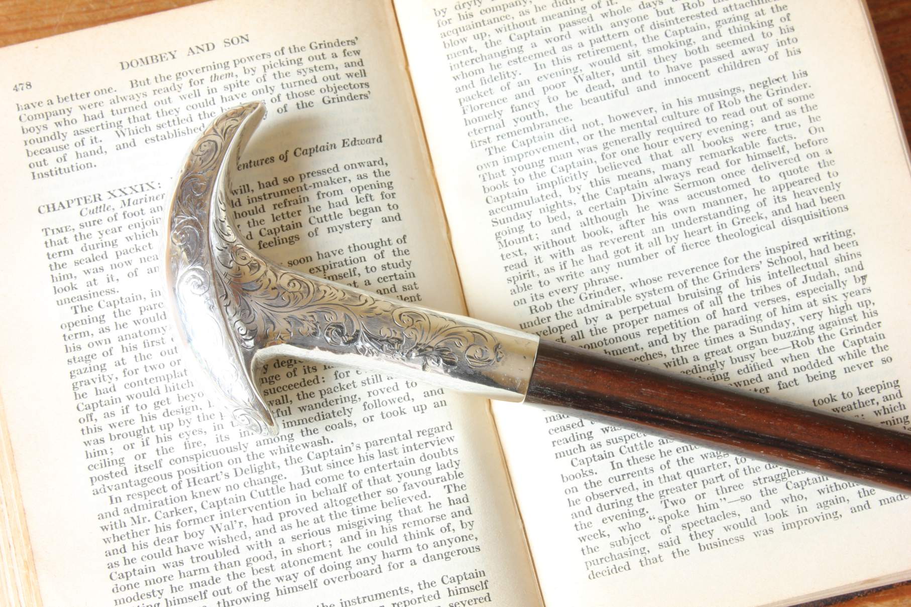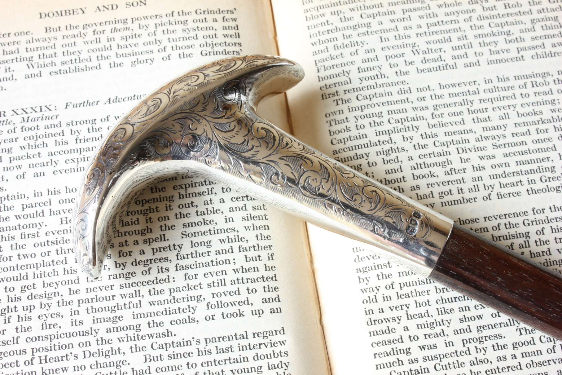 This fine quality antique stick which has a wooden shaft has a brass ferrule and a beautifully engraved decorative silver handle.