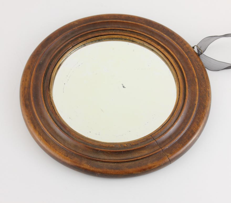 This charming small wall mirror has a round wooden frame and a mirror plate with some light foxing which gives it an attractive look.
