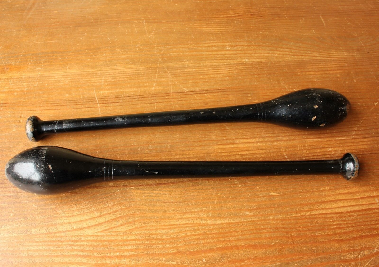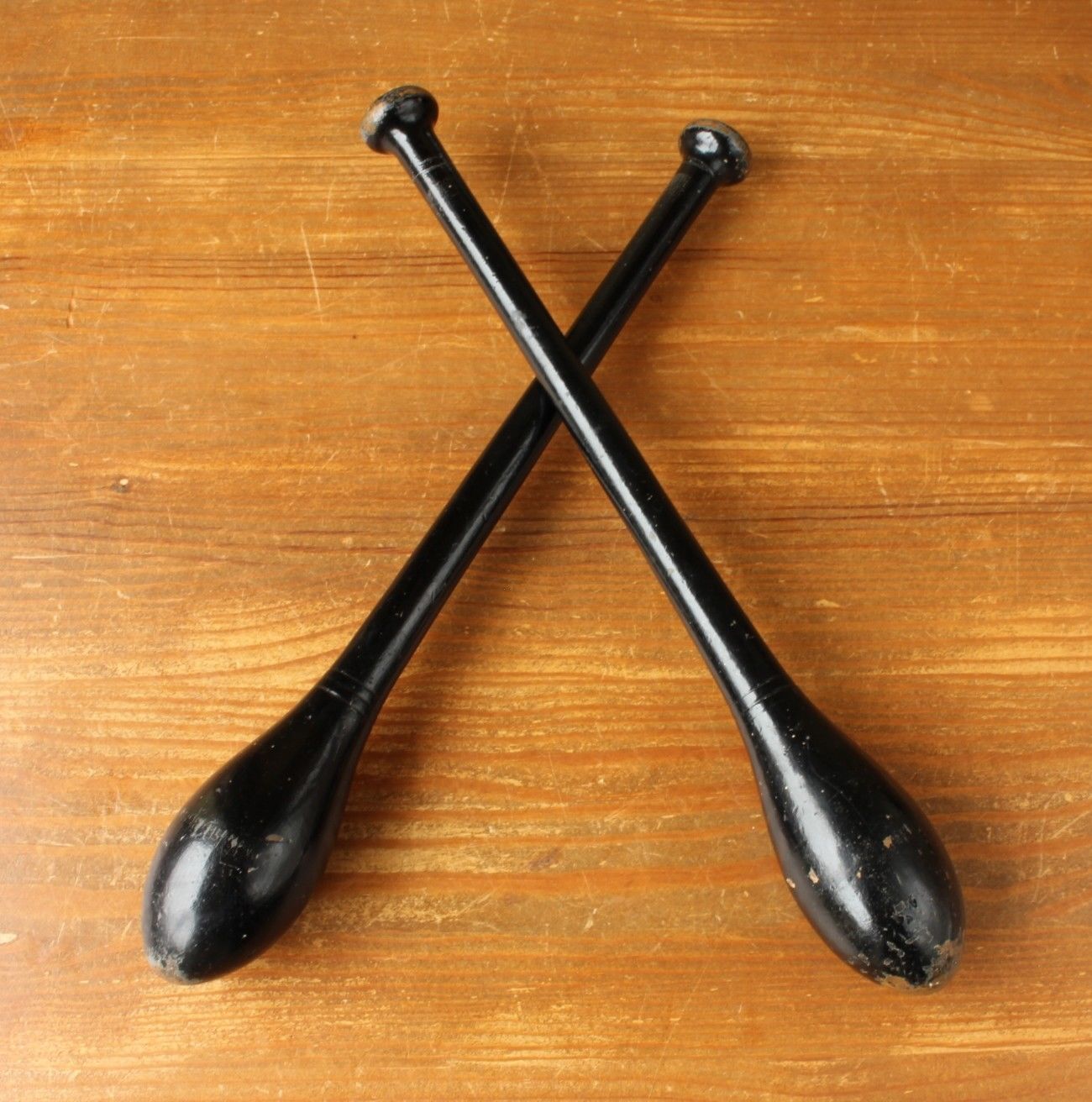 Indian clubs are a type of exercise equipment used for developing strength. They were swung in certain patterns as part of an exercise program and were popular in the late 1800s and early 20th century. This pair are unusual as they have original black paint.