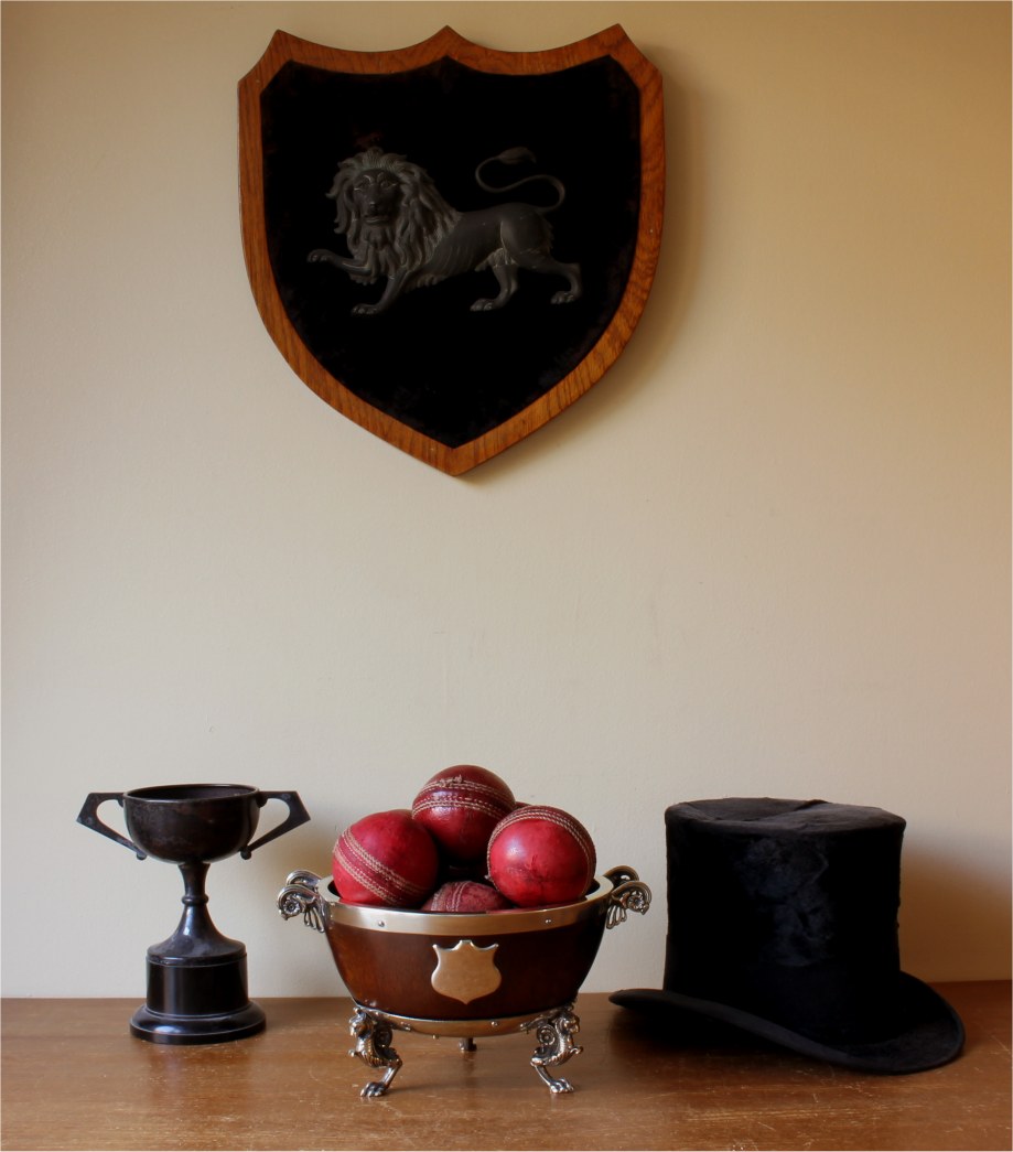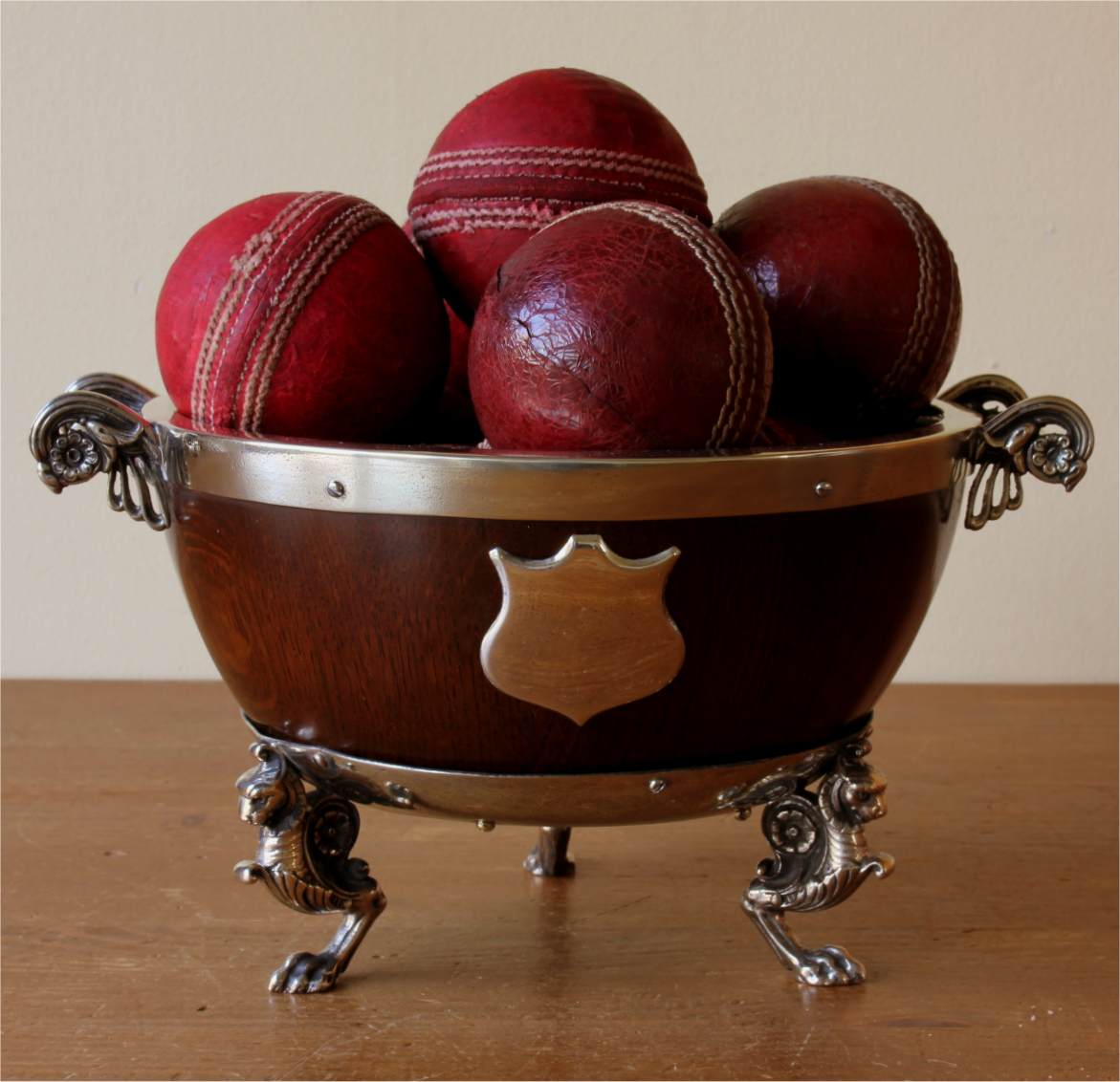 This handsome English Oak trophy bowl which dates from c1900 has silver plated fittings, is a smaller size bowl and is filled with 9 vintage cricket balls.