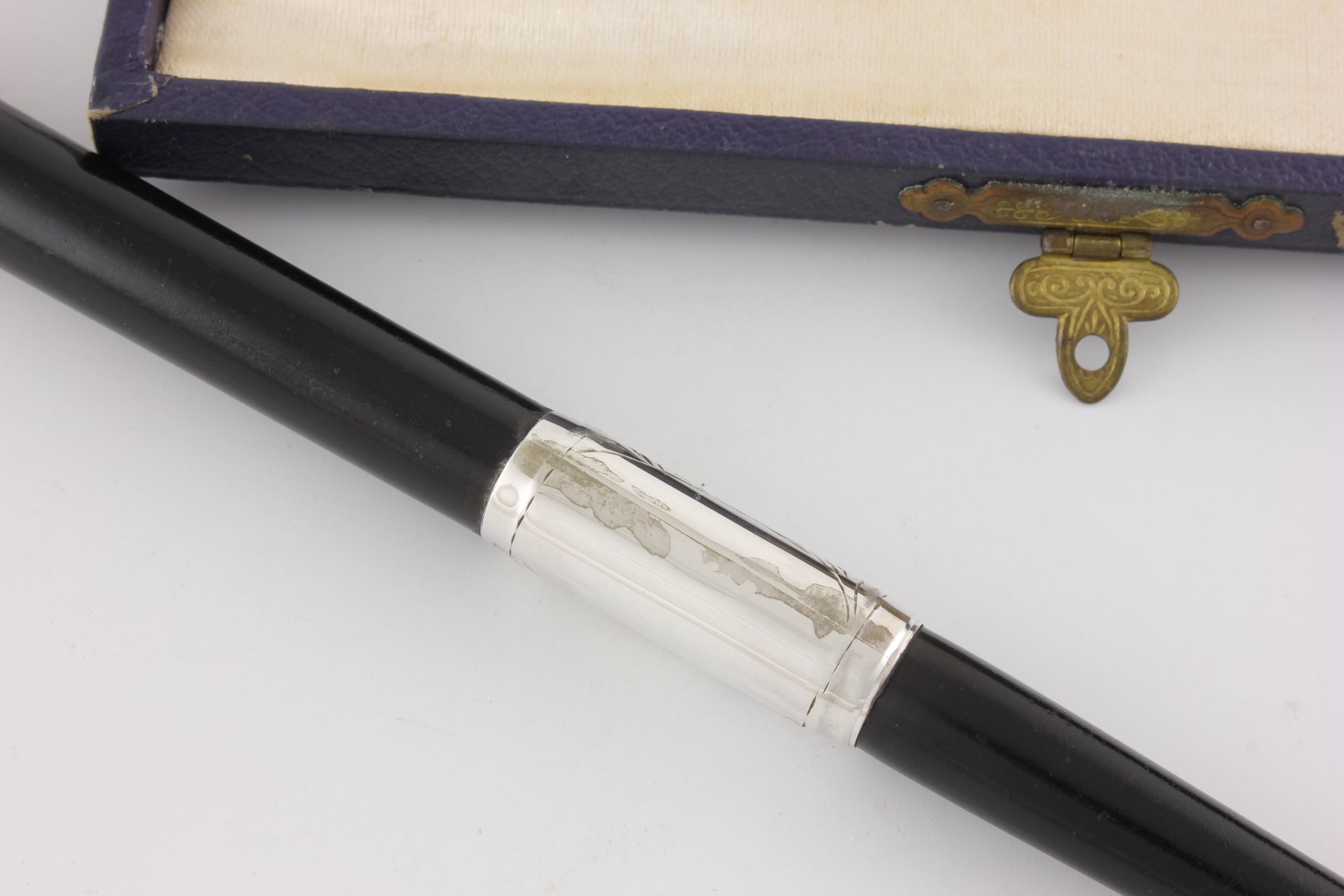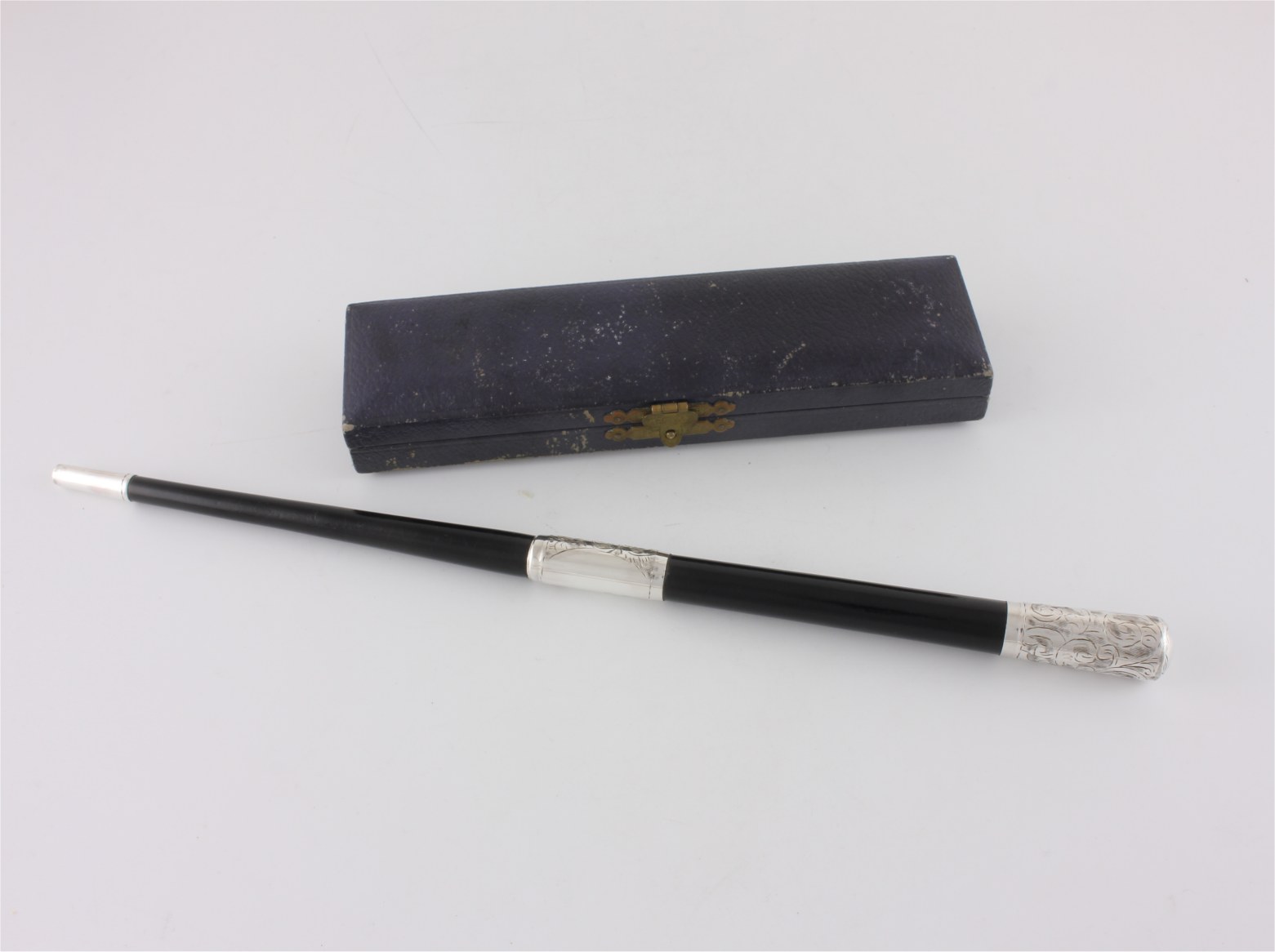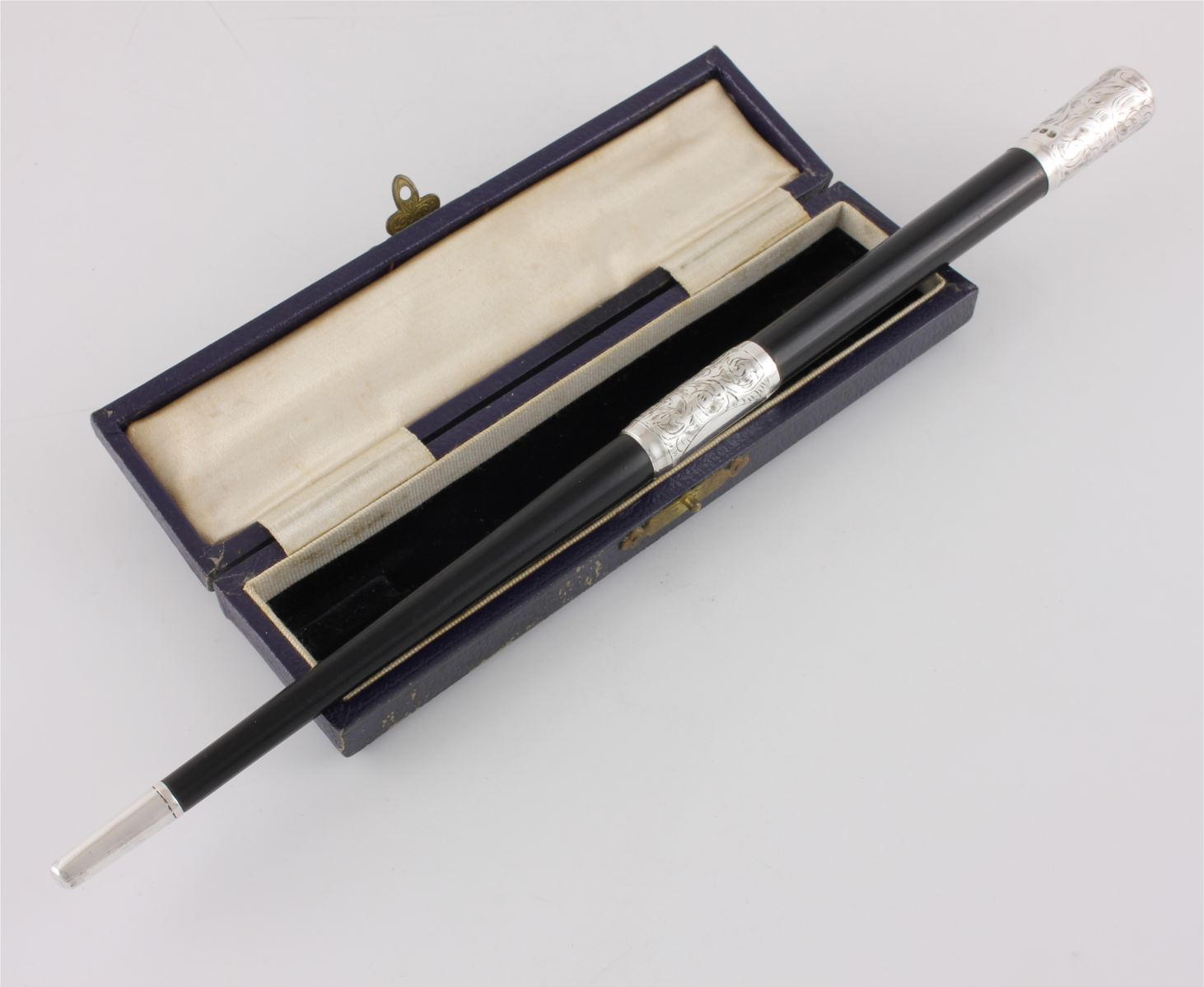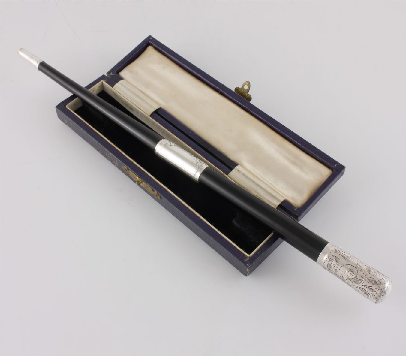 This two piece pocket sized conductor's baton which is made of ebony has silver fittings which are hallmarked for 1942 and unscrews so it can be packed away in it's case for transportation.